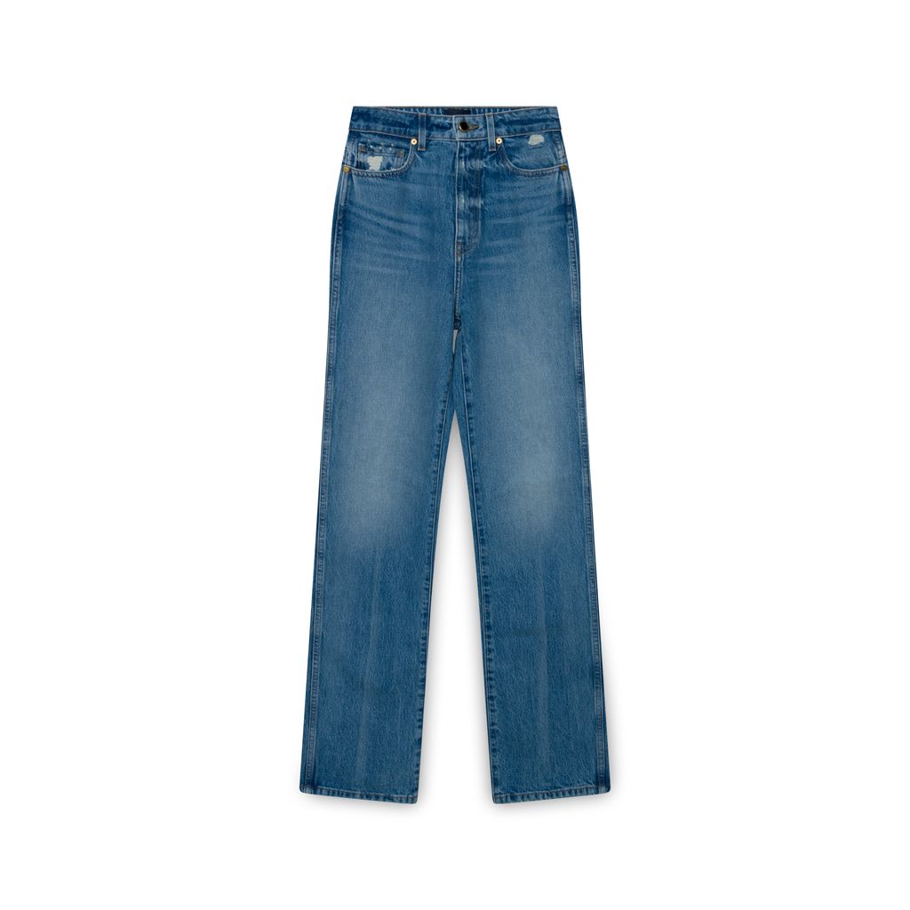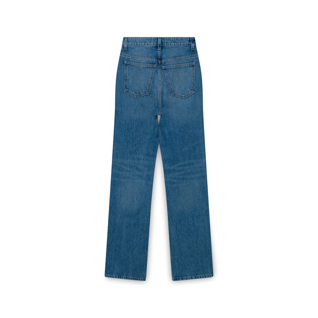 Designed to visually elongate the legs, these high-rise jeans flatter with a stovepipe silhouette traced by marigold topstitching. The robust structure of denim is infused with stretch for flexibility and recovery. Made in Los Angeles, each hand-finished pair has an enameled button of antiqued brass.