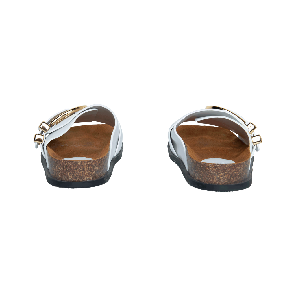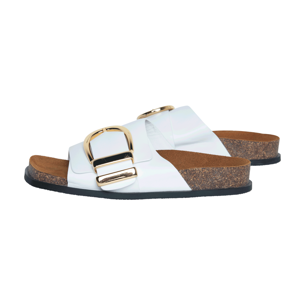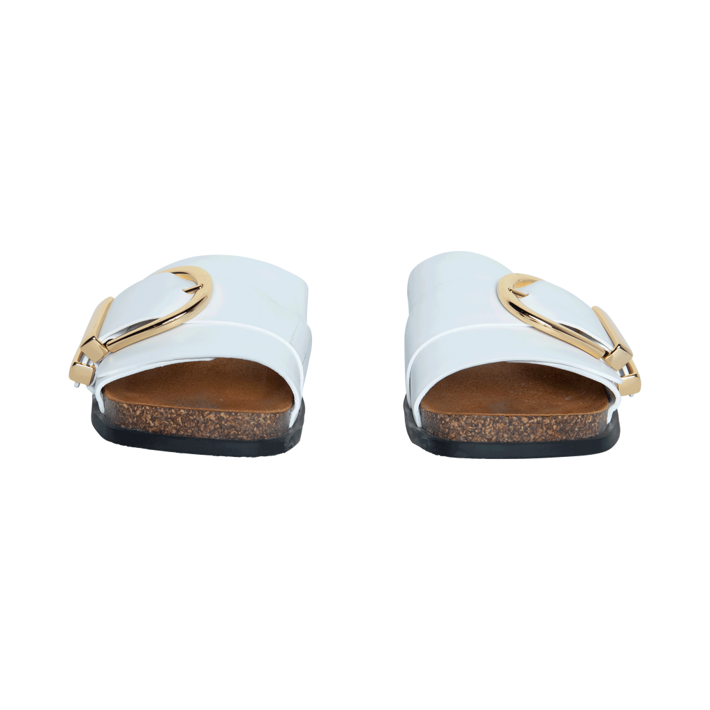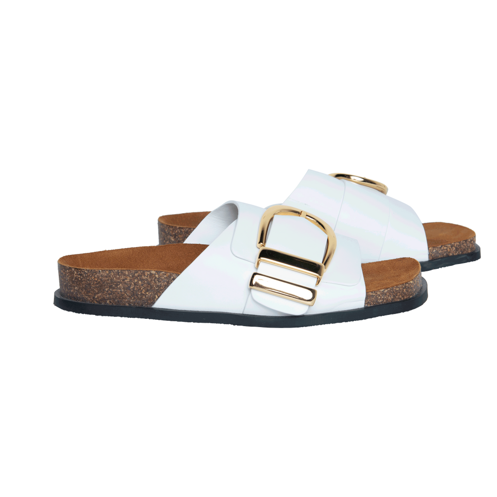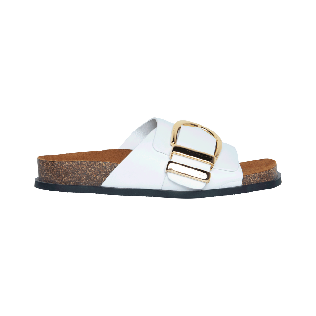 Khaite White Thompson Leather Sandal features oversized buckle, slip on style, smooth white leather, suede insoles, and contoured cork and latex footbeds.