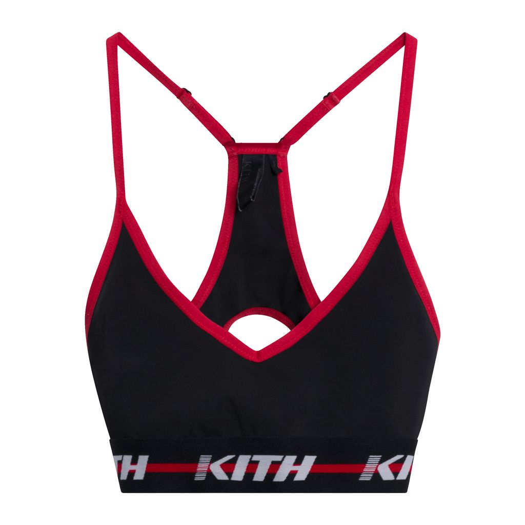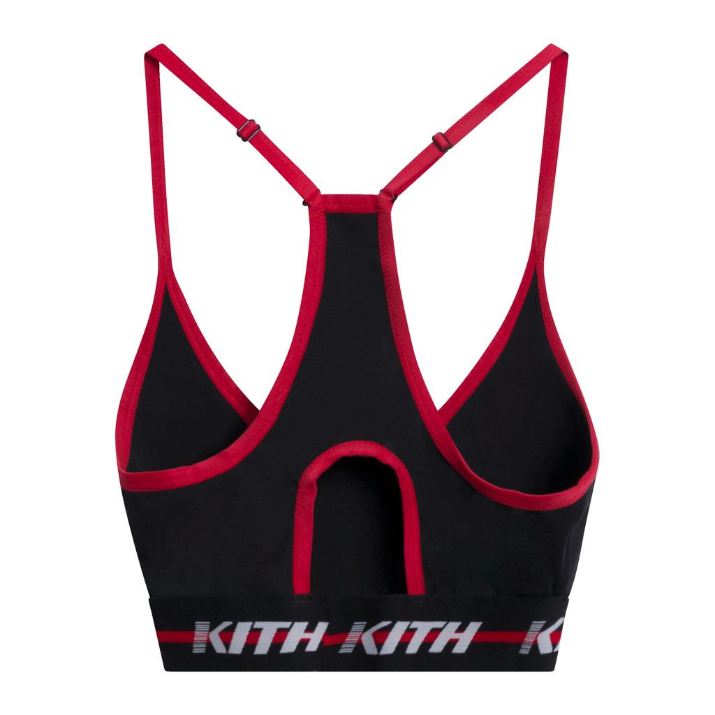 This racerback sports bra from Kith is made for light-support activity and features moisture-wicking polyester fabrication. Accented binding, mesh overlays, rear cutout, and Kith branded elastic bands finish off this sporty piece. No padding.