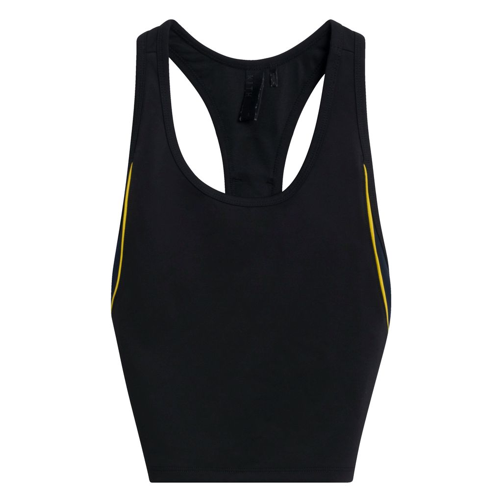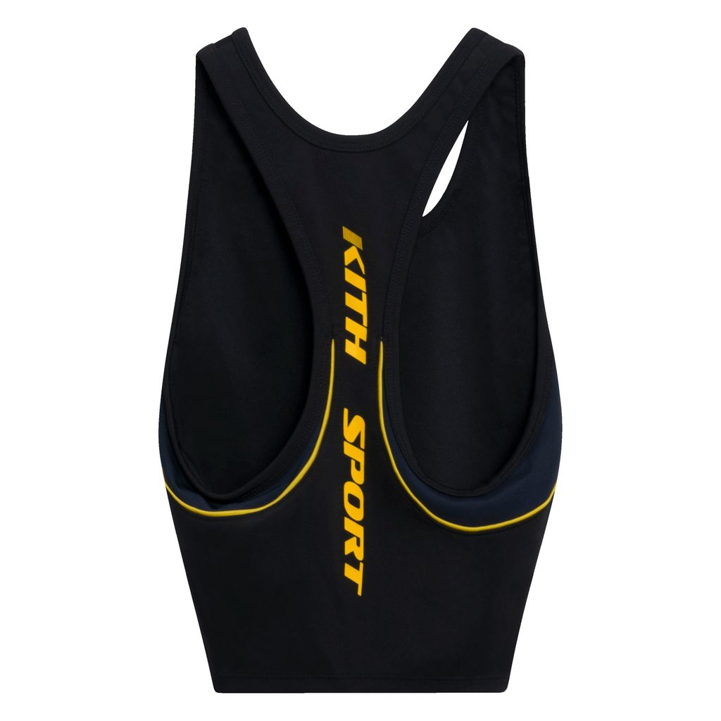 Made from a poly-spandex blend, this racer-back style bra top is cut a bit longer than the usual sports bra silhouette and features yellow custom Kith Sports silicone print on the back.