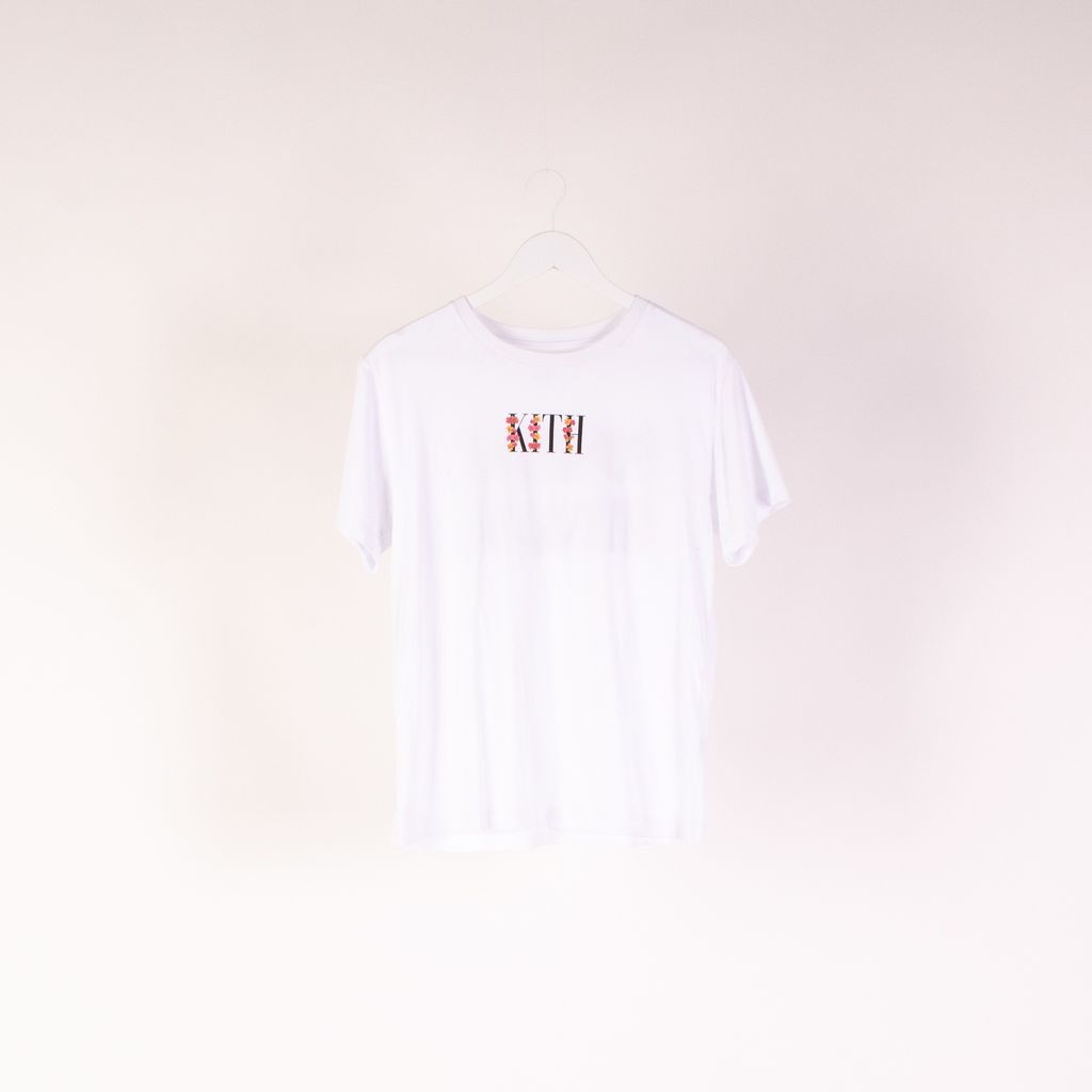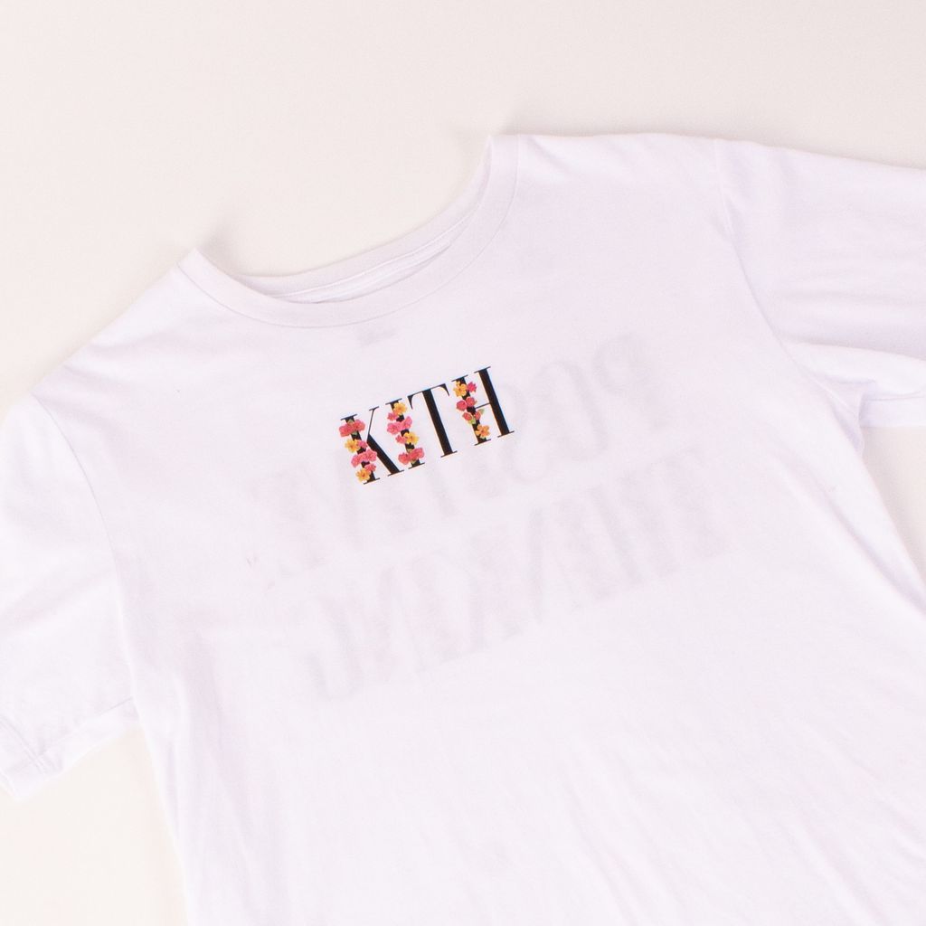 From notable street retailer, Kith, comes this fun and new take on their logo tee. Features Nirvana-esque text on front and back with floral integrated floral design.