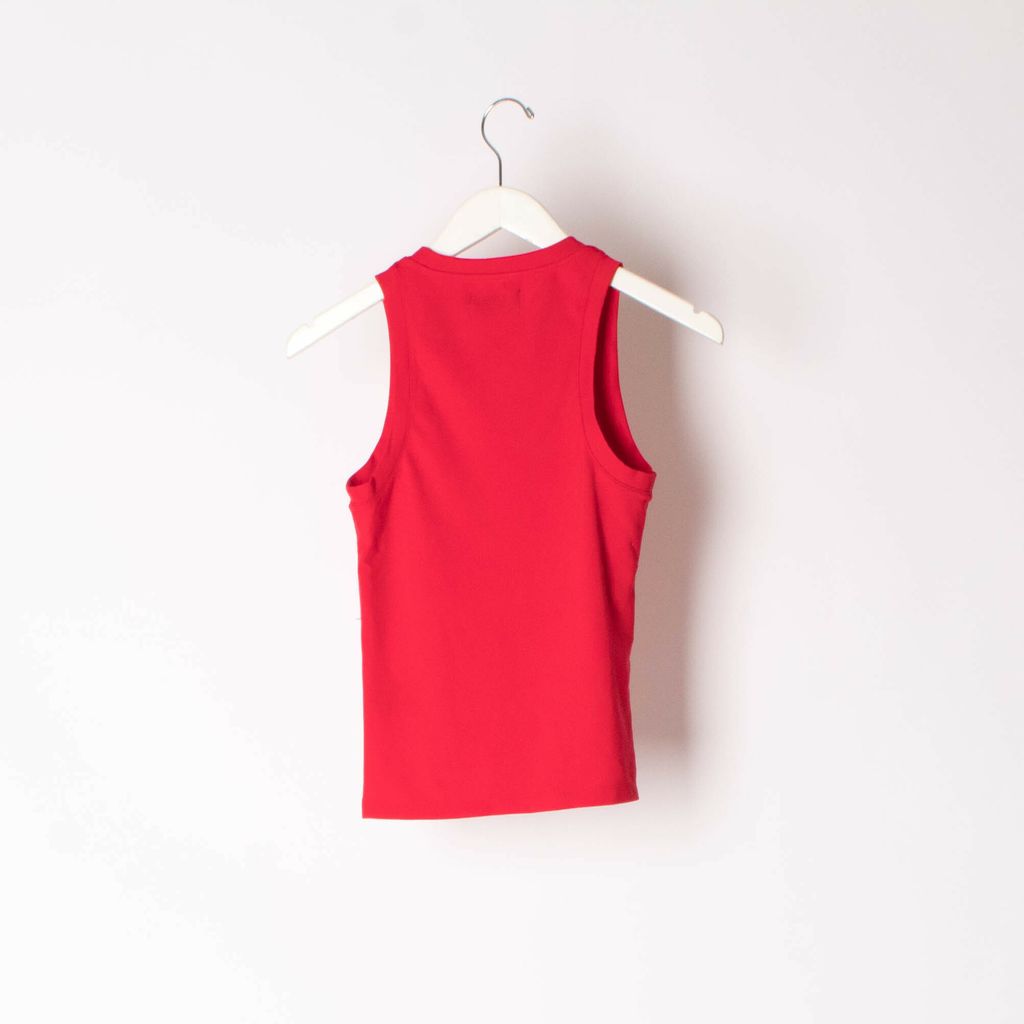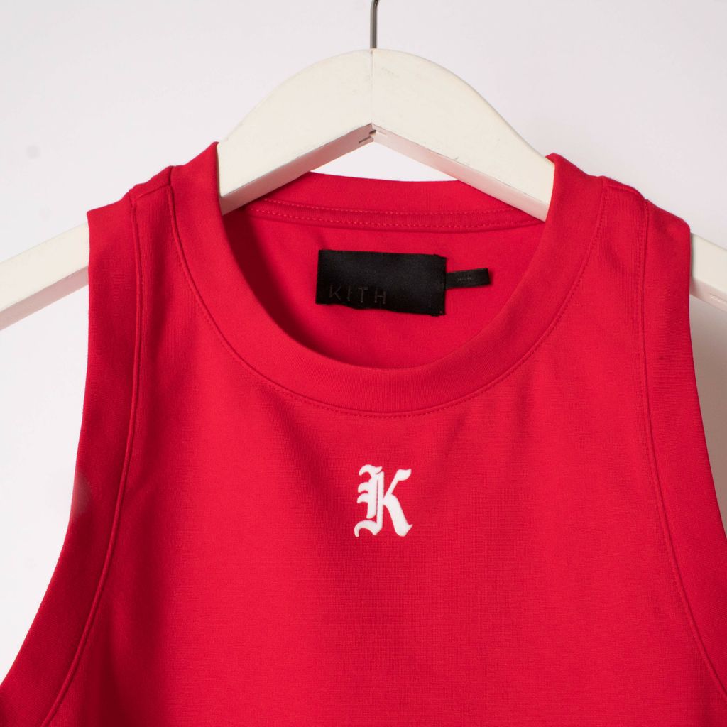 Kith red "K" fitted tank top. Made of viscose, nylon and spandex. Not labeled with a size but appears to be an XS.