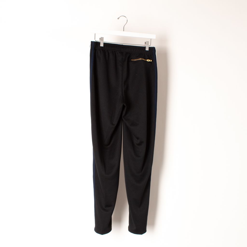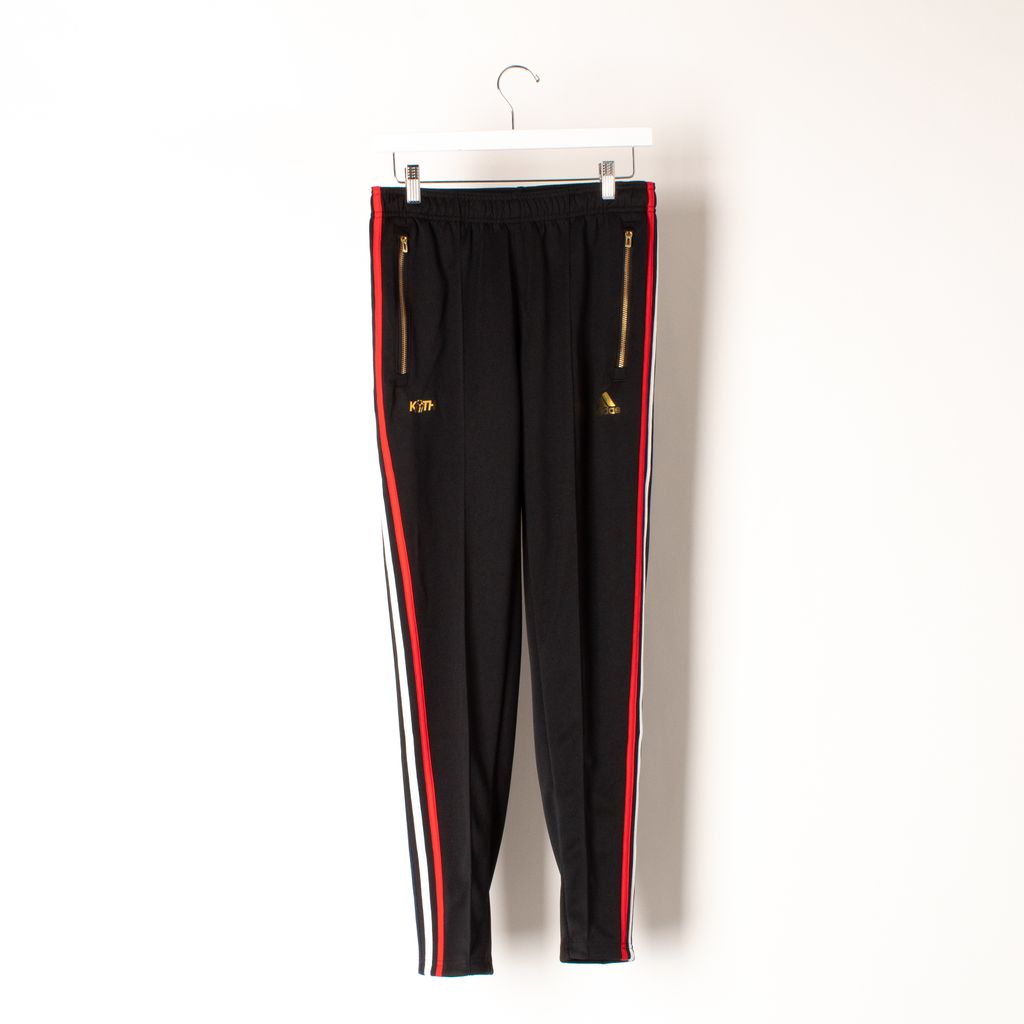 Like new, track pant from Kith x Adidas soccer collaboration. Polyester fabric featuring an elasticized waistband, 3-stripe branding down side panel, printed gold foil branding on front, two front gold zipper hand pockets and a rear right zip gold pocket.