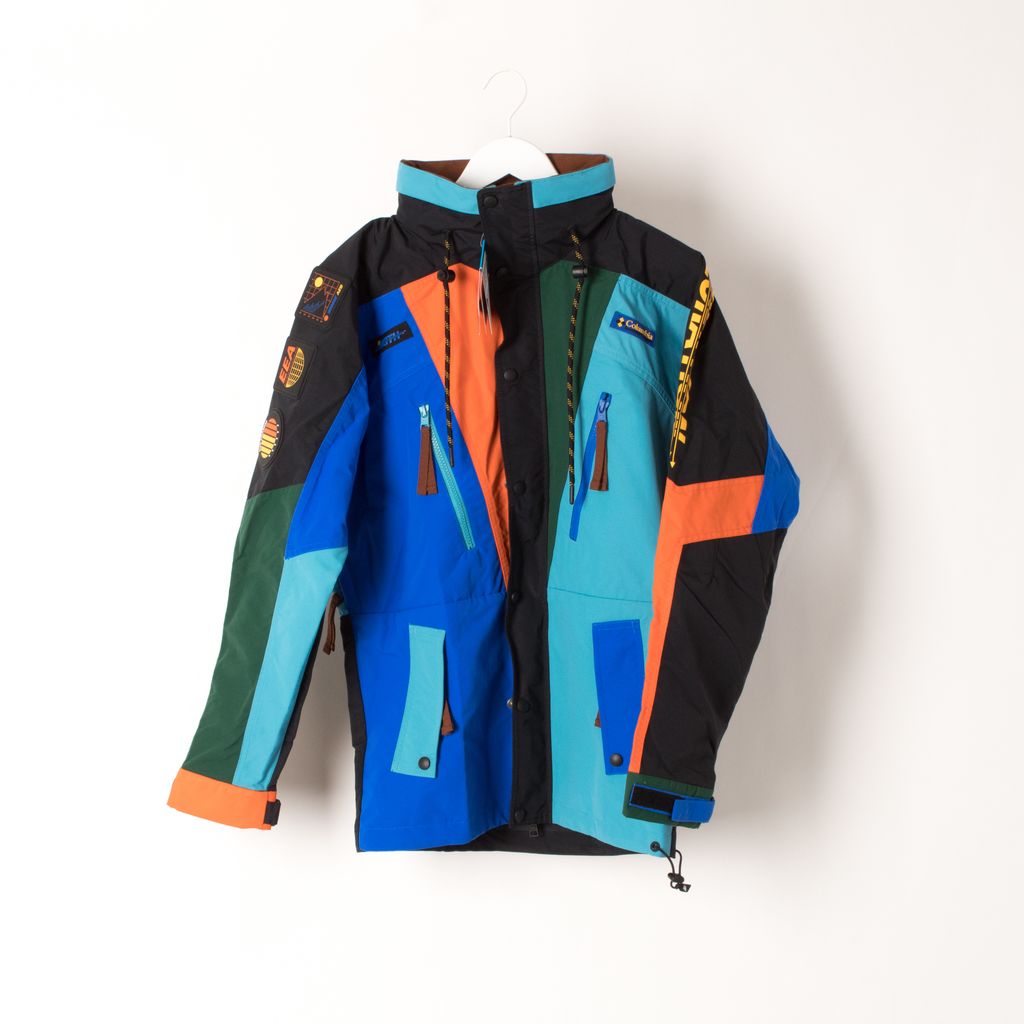 Nylon fabric, color-block construction, mesh liner, concealed hood with zipper closure and thin flap, drawstring pulls on collar, armpit zipper ventilations, canvas/rubberized co-branded logos on chest, branded logos on sleeves, bungee cord hem. Sold out instantly. Lightly worn.