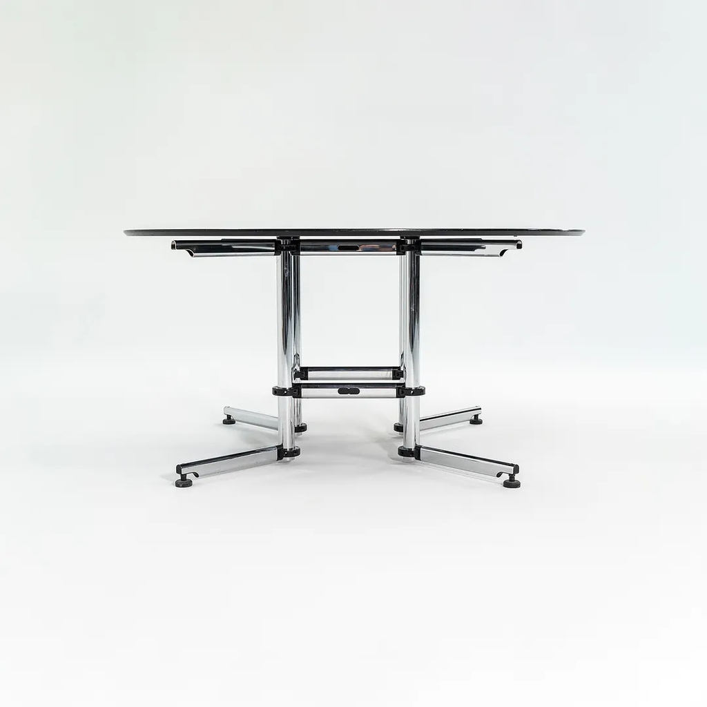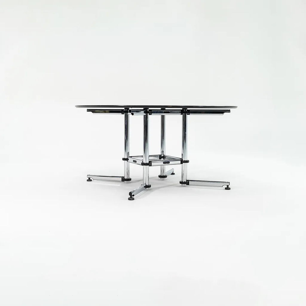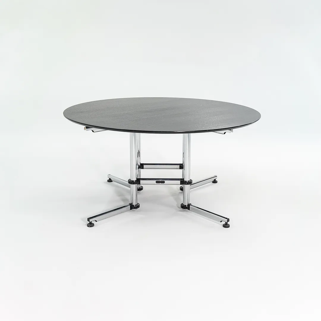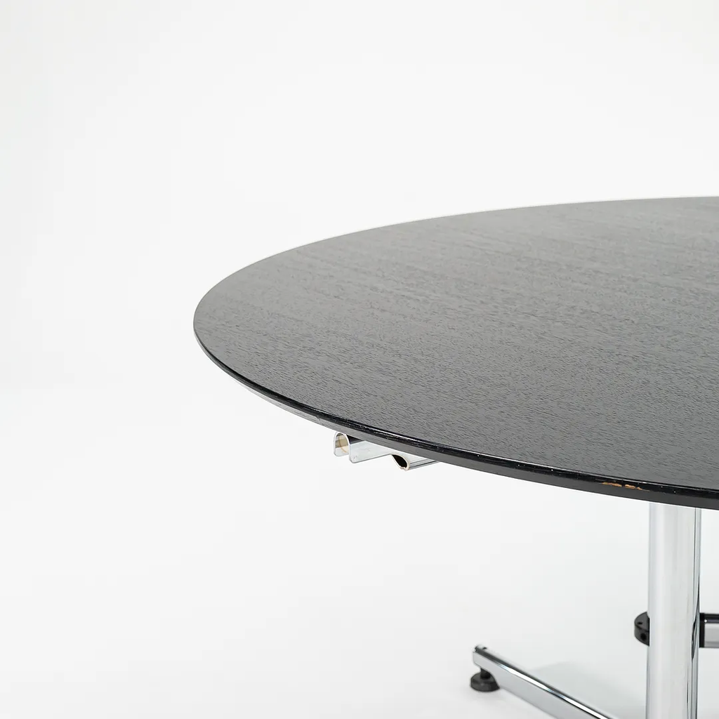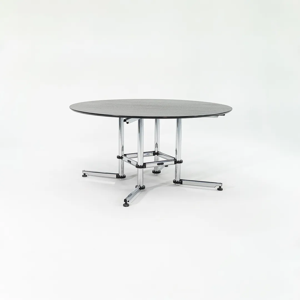 Listed for sale is a single USM Haller Round dining / conference (three are available, though they are priced individually) with polished chrome framing and an ebonized wood top. We guarantee this to be an authentic USM Haller piece made in Switzerland. As authorized USM Haller Dealers, we only sell authentic products. Condition is good with some wear from use. See Photos. This came from a Swiss office headquarters in New York.