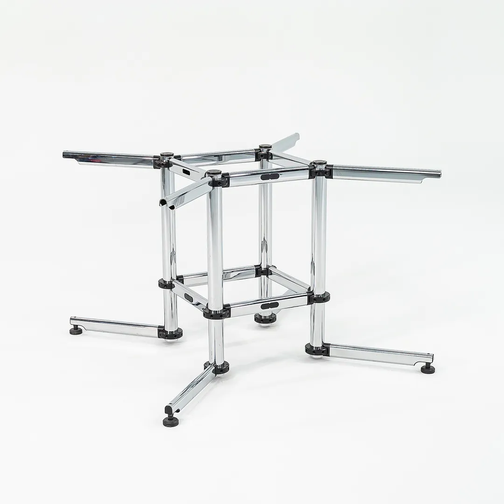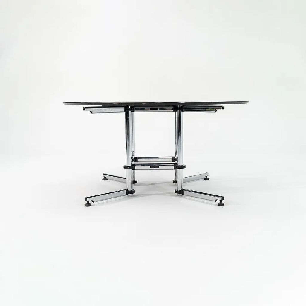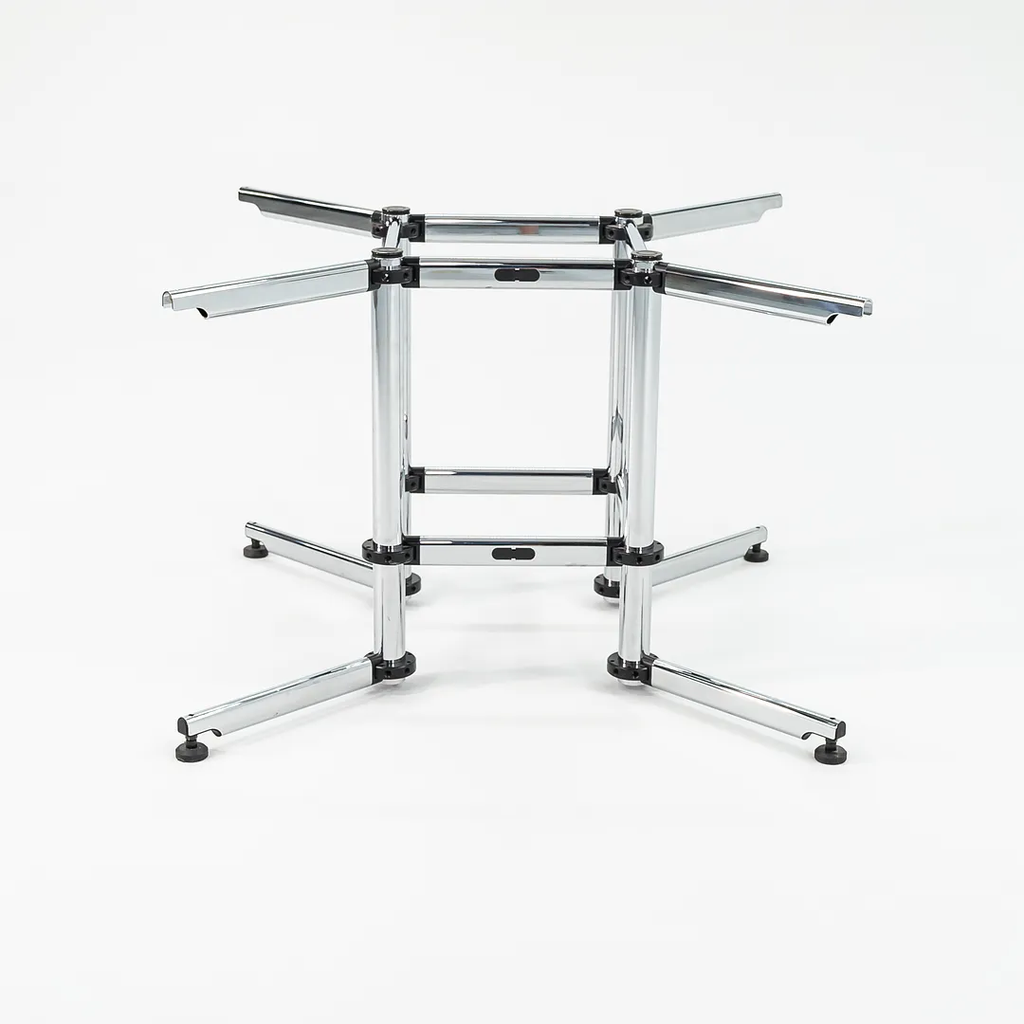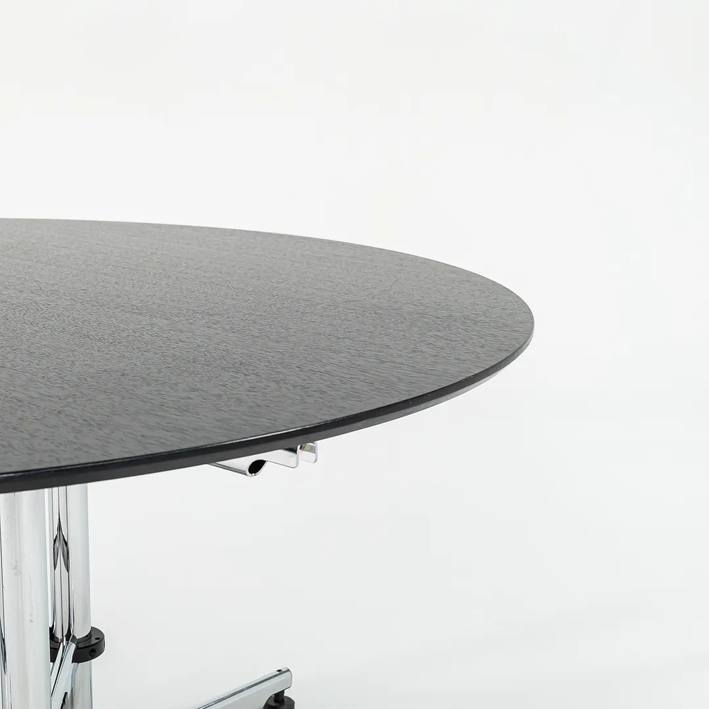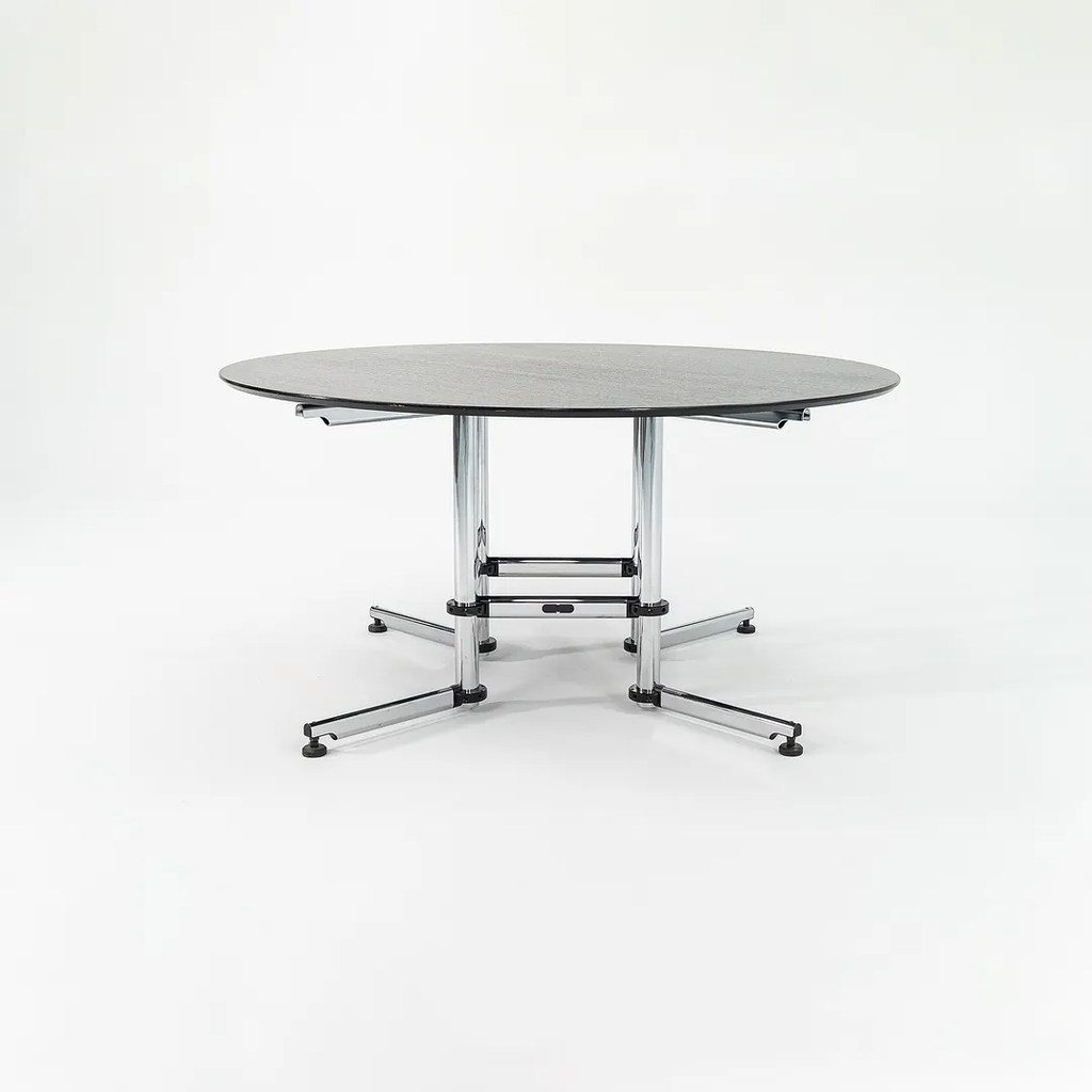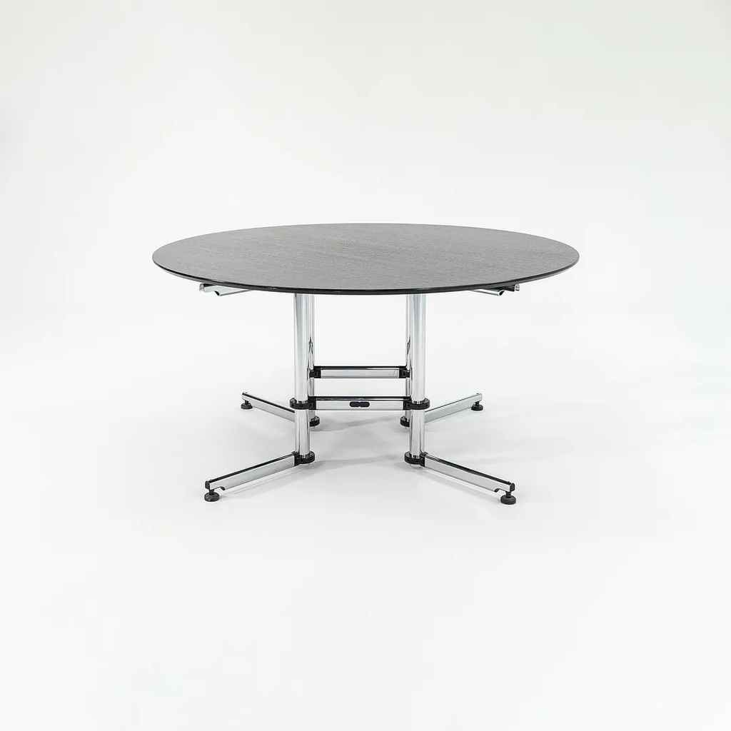 Listed for sale is a single USM Haller Round dining / conference (three are available, though they are priced individually) with polished chrome framing and an ebonized wood top. We guarantee this to be an authentic USM Haller piece made in Switzerland. As authorized USM Haller Dealers, we only sell authentic products. Condition is good with some wear from use. See Photos. This came from a Swiss office headquarters in New York.