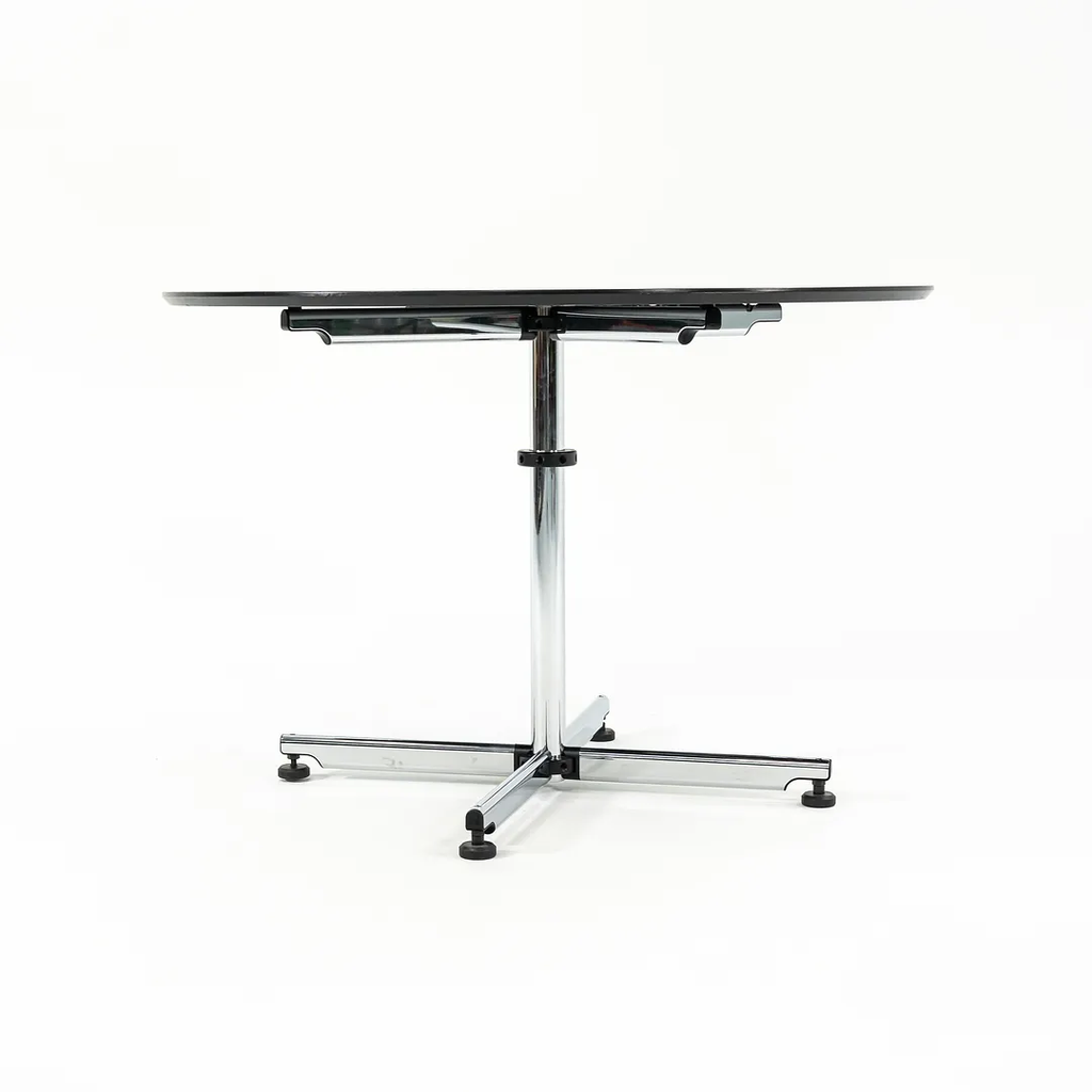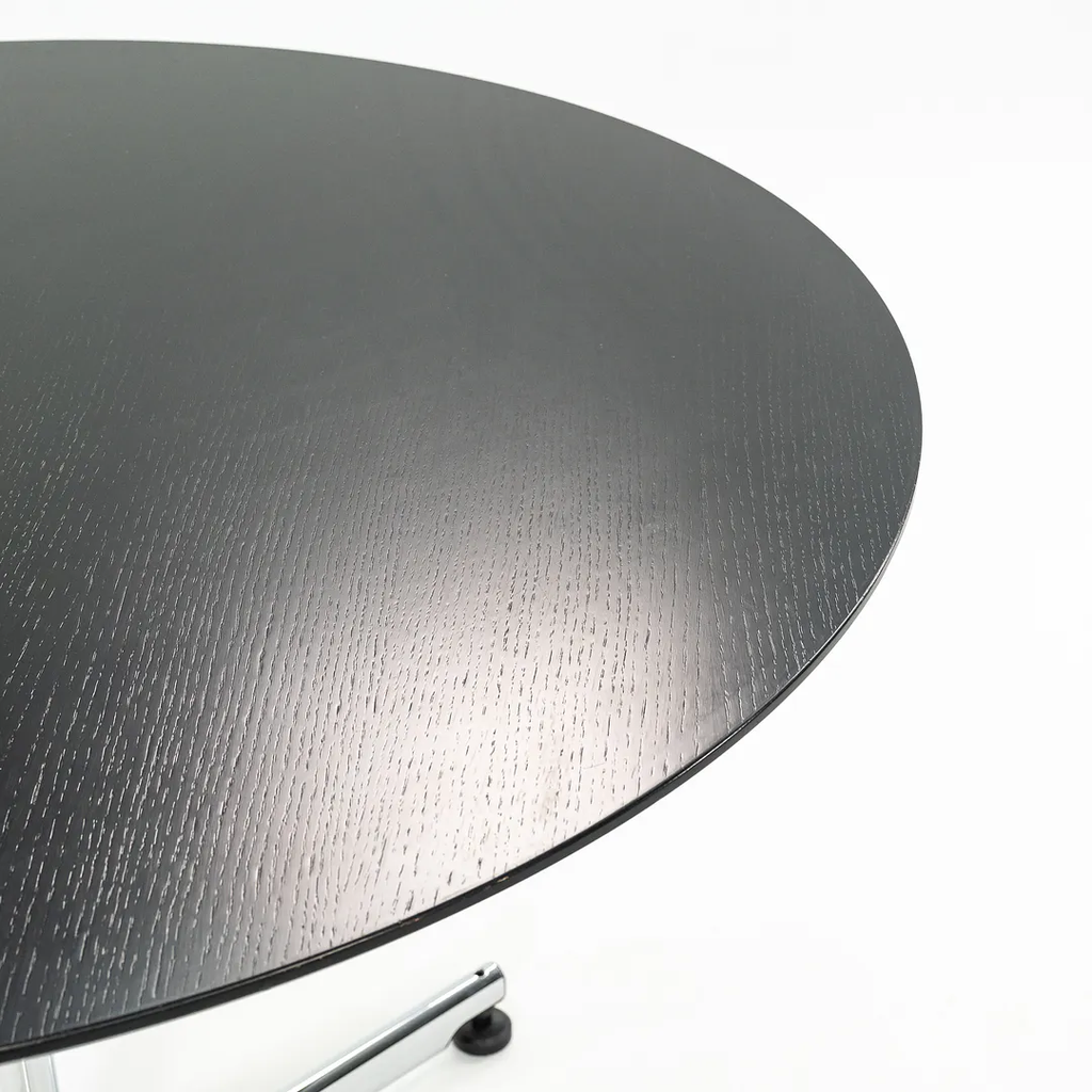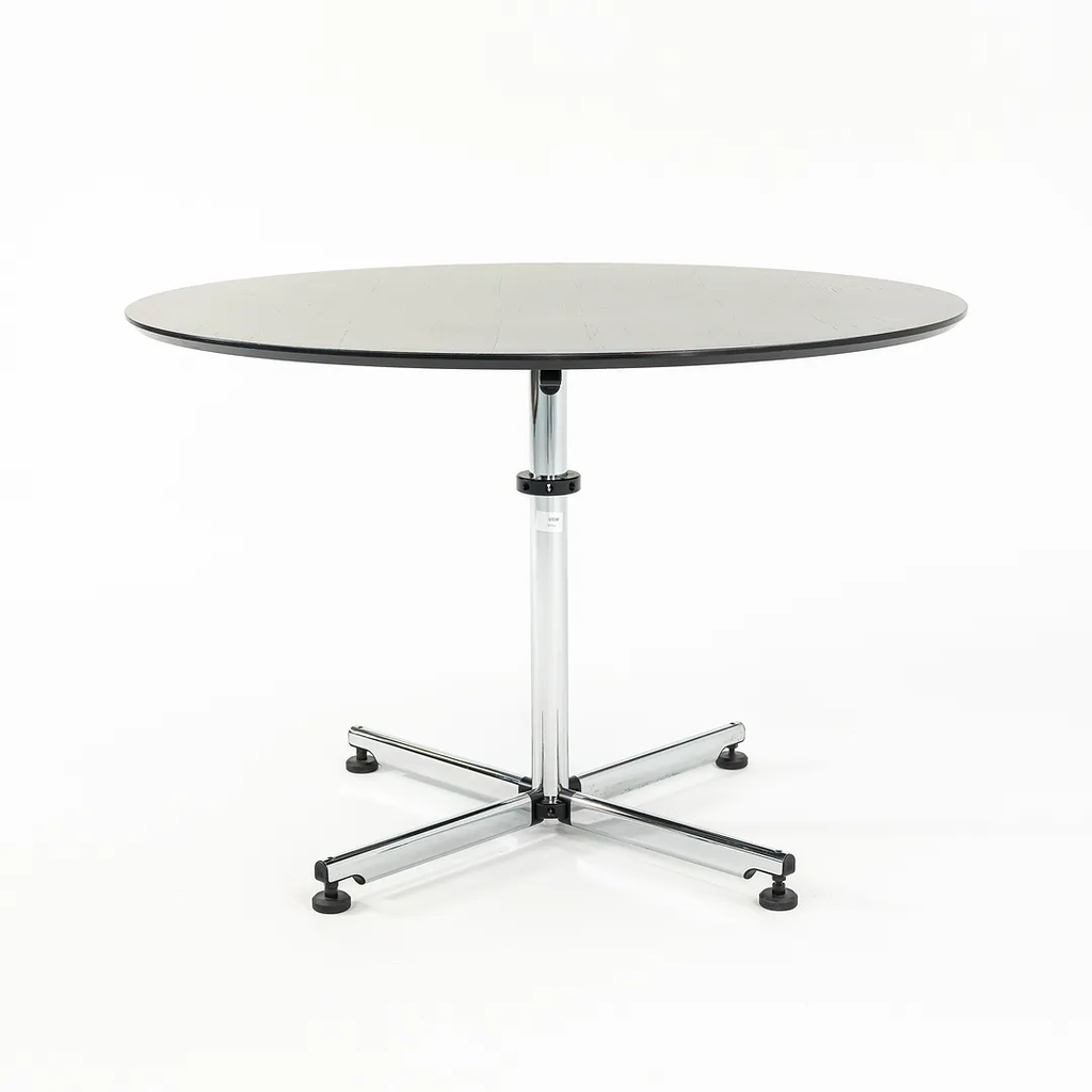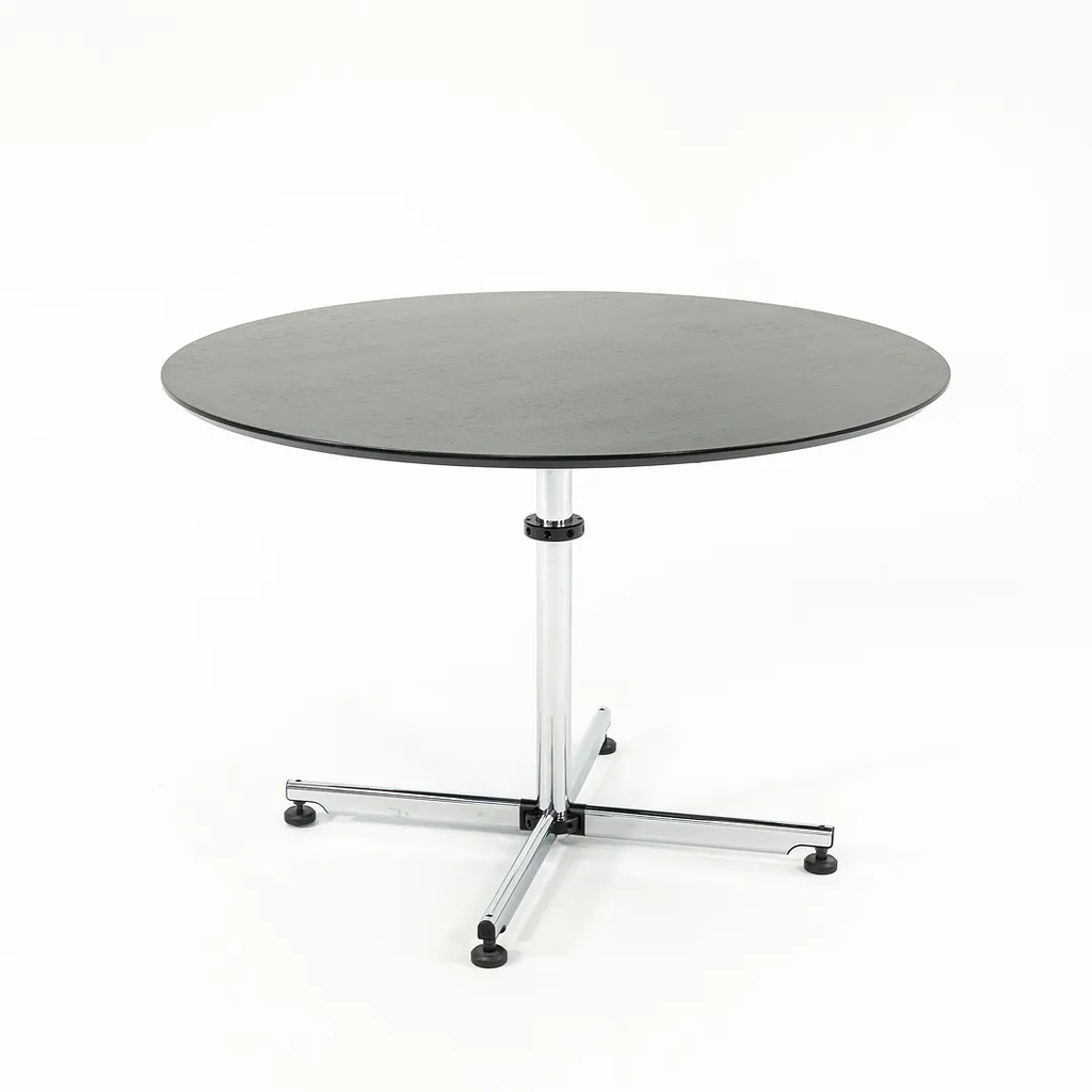 This is round Kitos Table, designed by Swiss manufacturer USM Haller in 1990. These pieces date to the early to mid 2000s. The listed price includes one table, and we have 7 available for purchase. Their design includes a steel columnar base, and has steel support tubes under the top. The round top is made of ebonized oak. The piece can serve as a dining table or a meeting table and is able to be adjusted in terms of height.