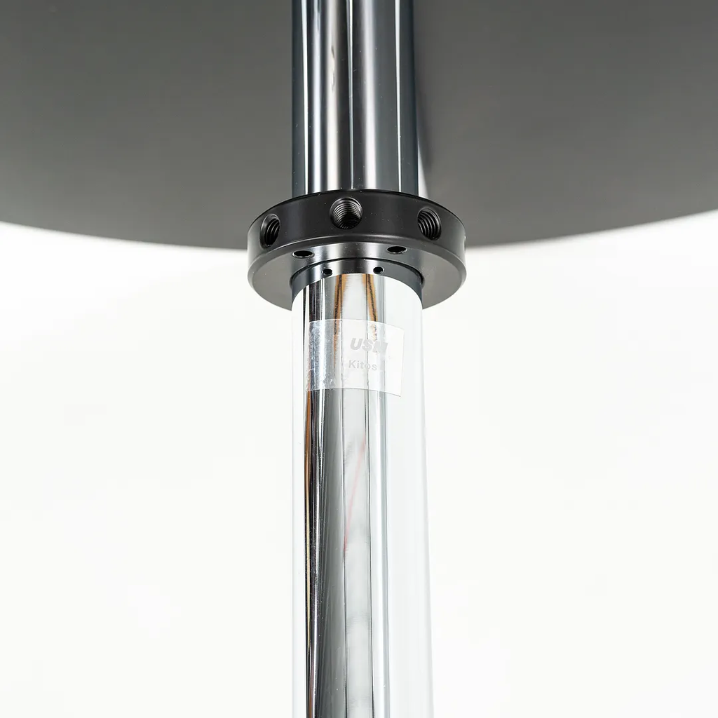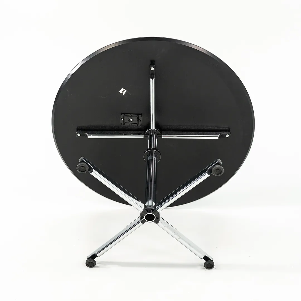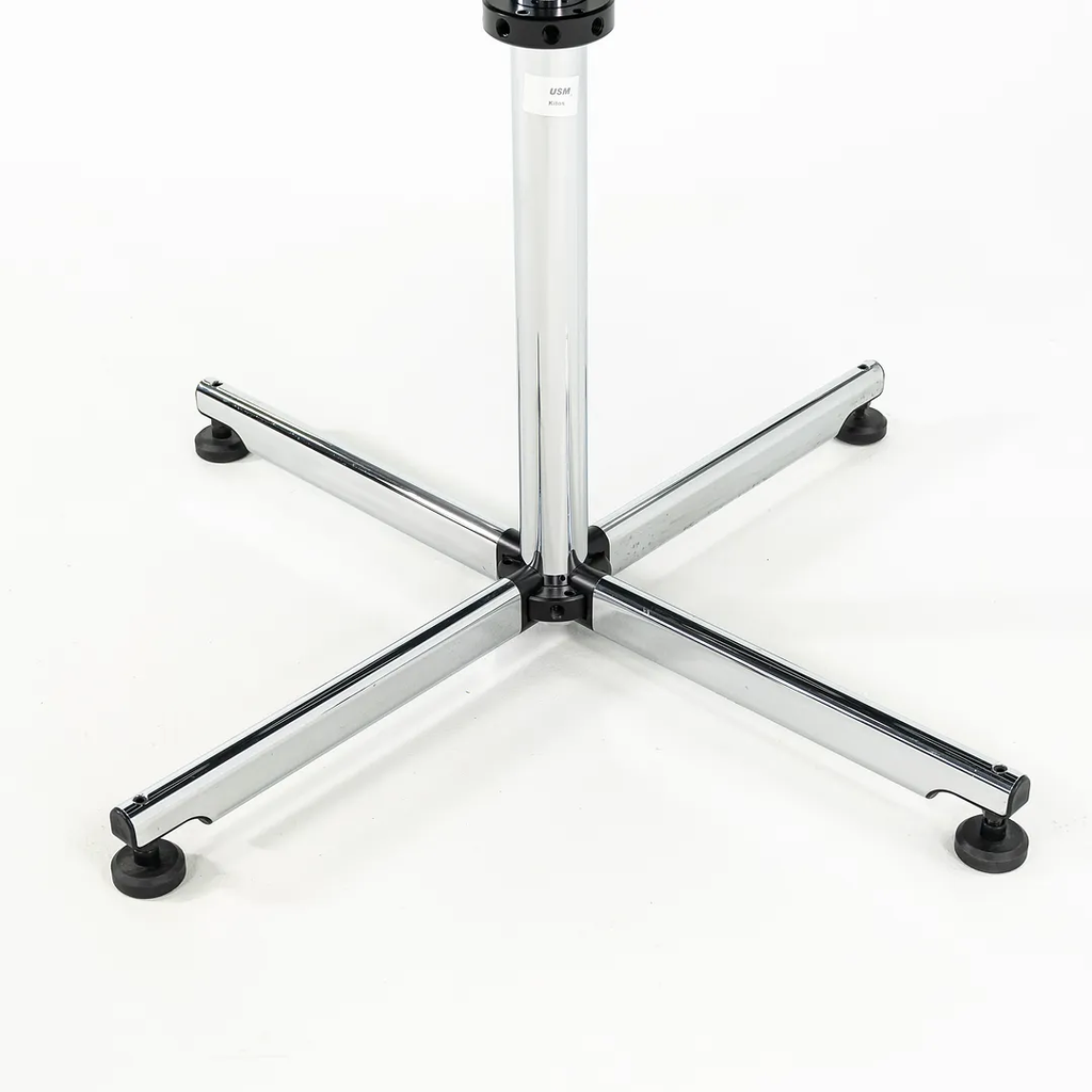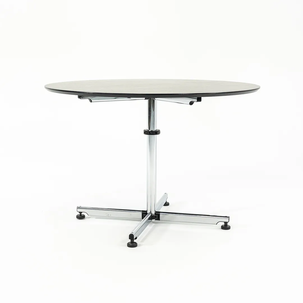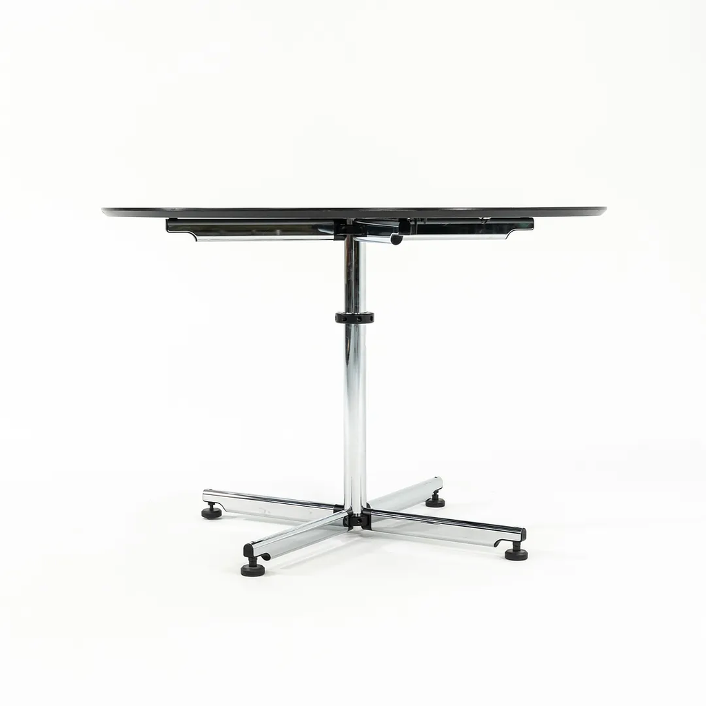 This is round Kitos Table, designed by Swiss manufacturer USM Haller in 1990. These pieces date to the early to mid 2000s. The listed price includes one table, and we have 7 available for purchase. Their design includes a steel columnar base, and has steel support tubes under the top. The round top is made of ebonized oak. The piece can serve as a dining table or a meeting table and is able to be adjusted in terms of height.