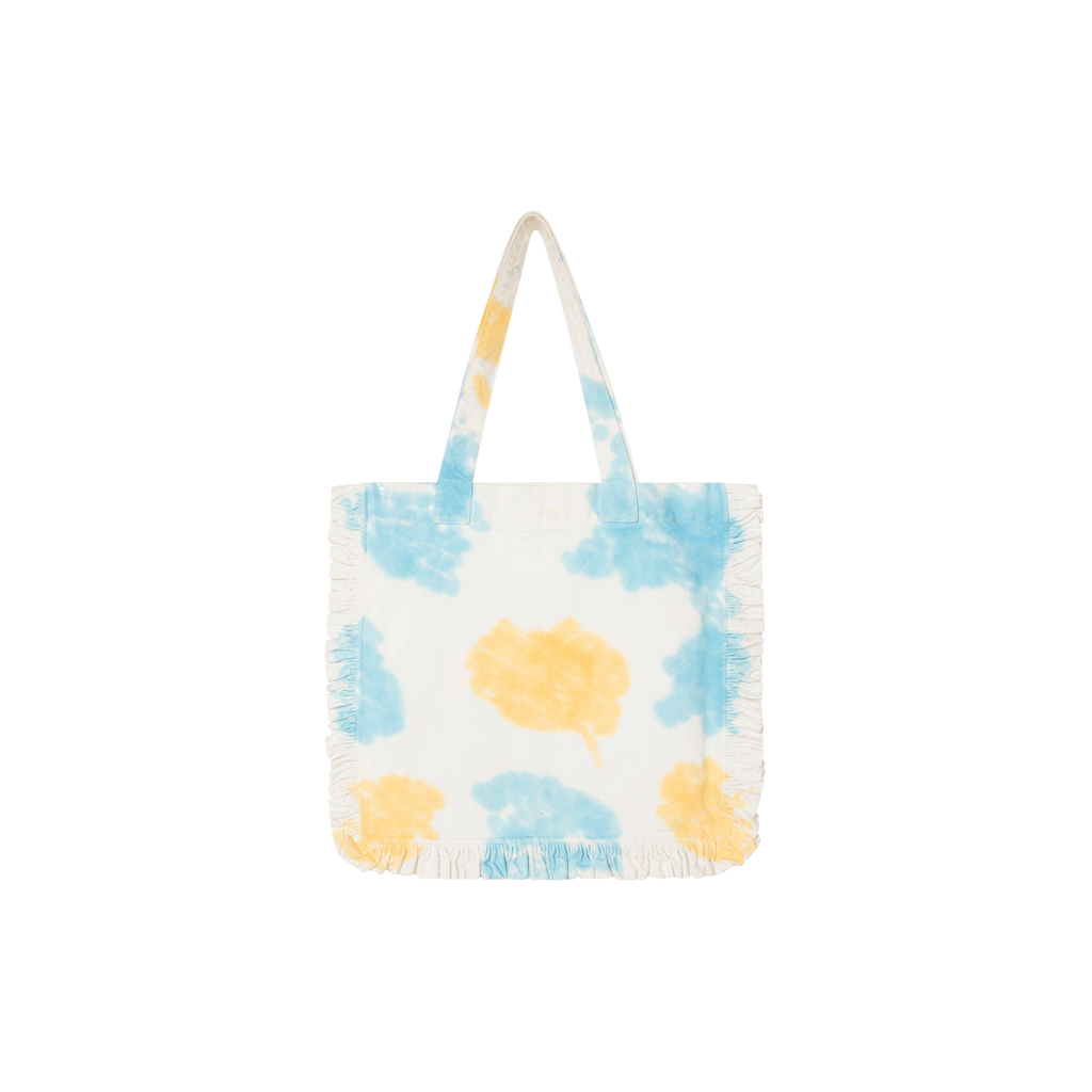 KkCo Studio Utility Tote in Cloud Tie Dye features ruffle trim detail, 4 cargo style pockets, and logo on front.