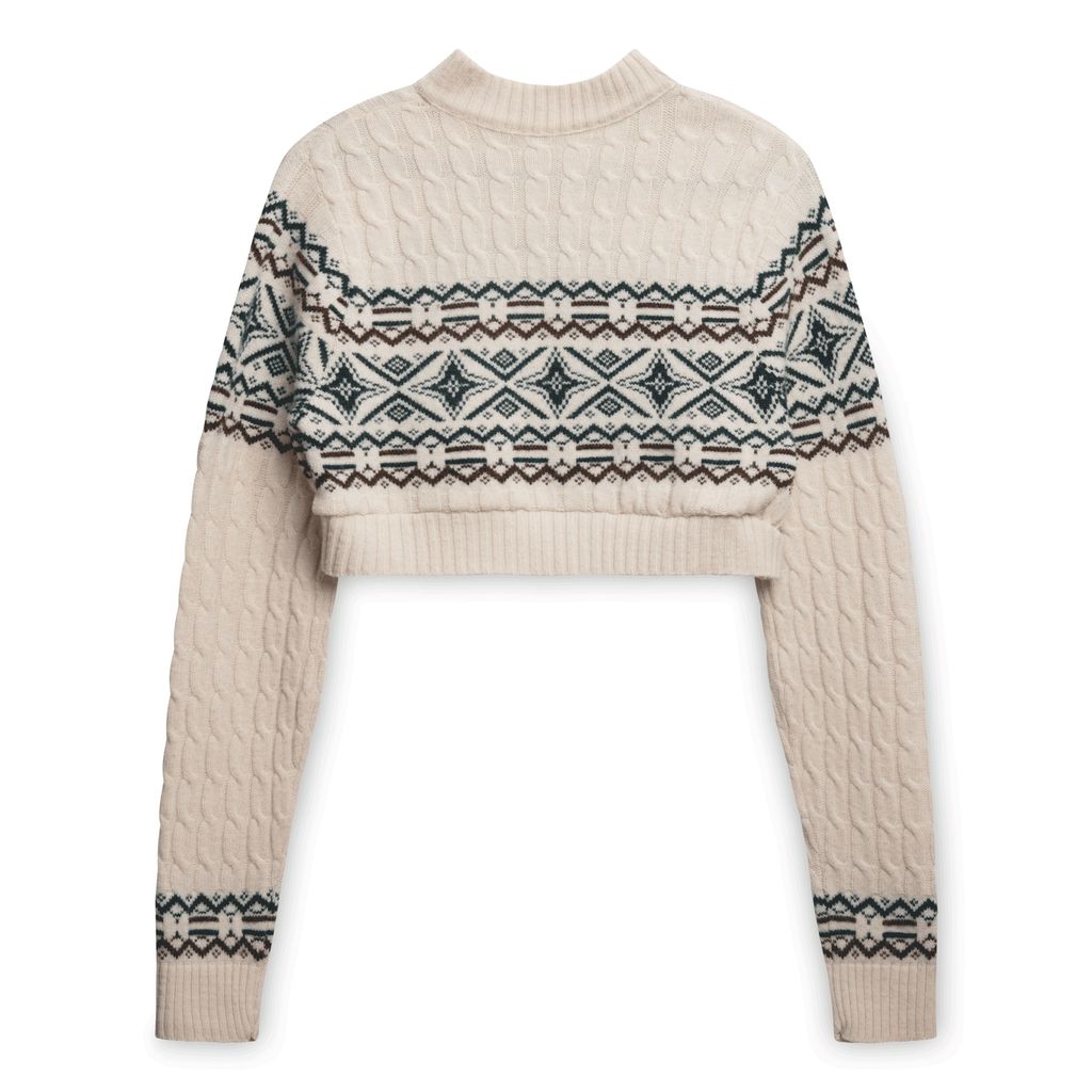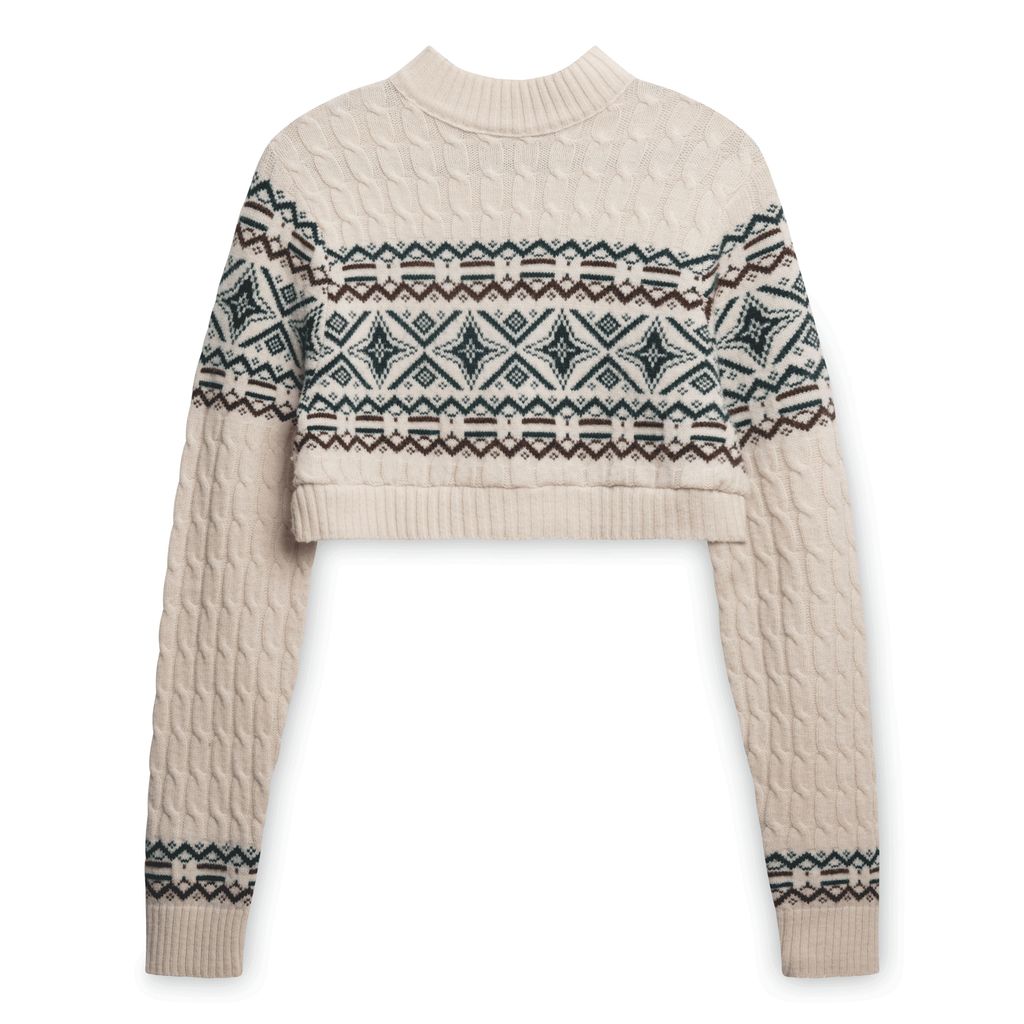 Knit Crop Top Sweater features pullover fit, knit patterned detail, ribbing at hem and collar.