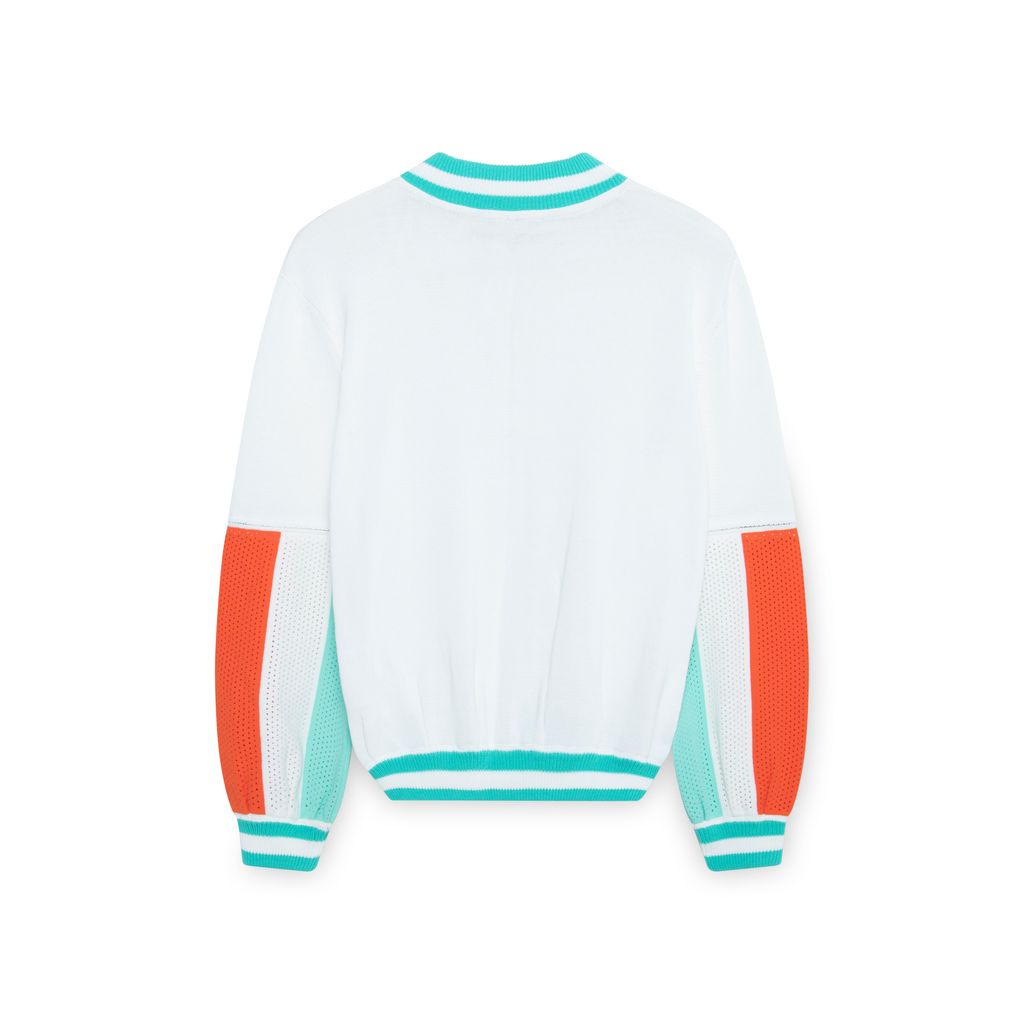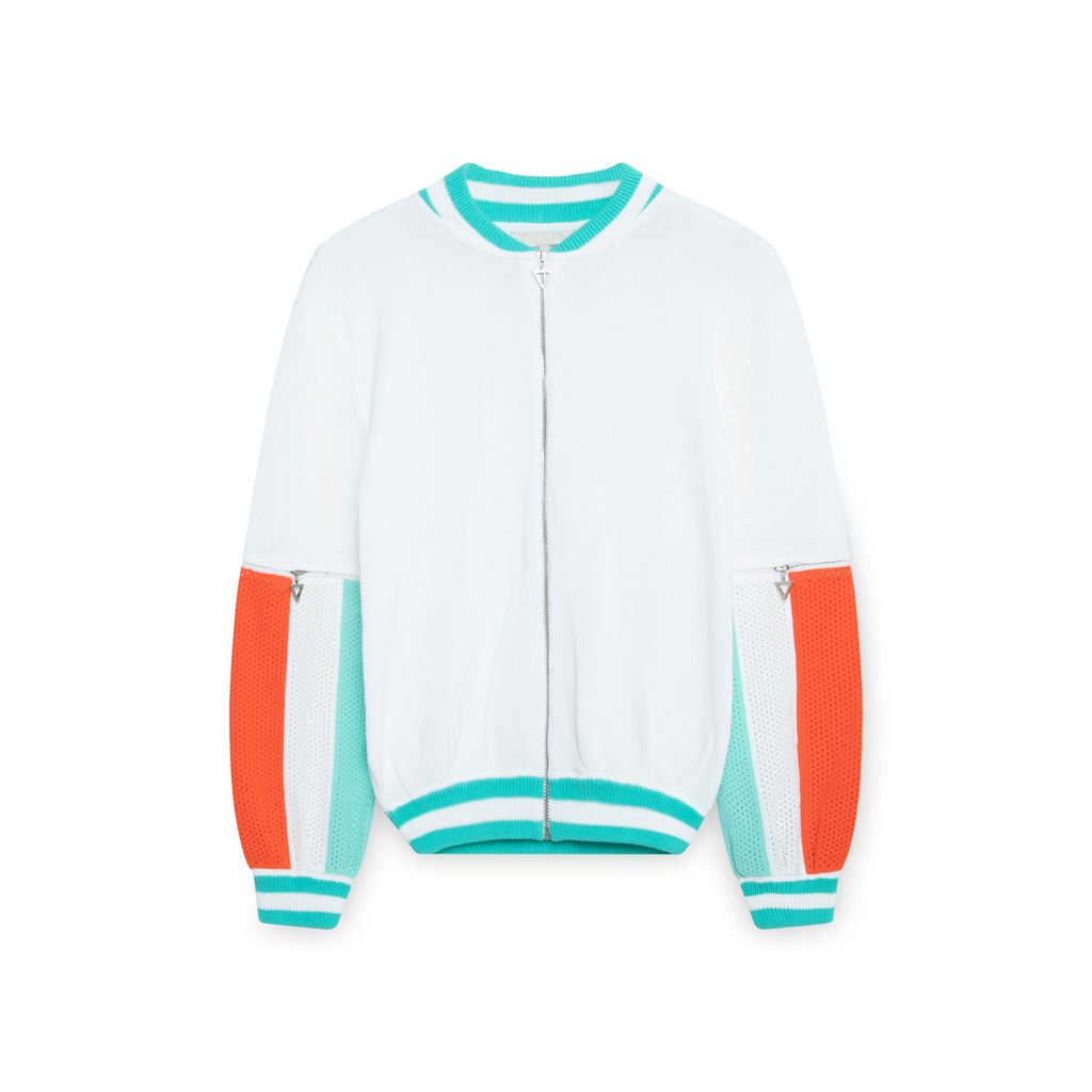 Knitts Knit Varsity Zip Up features striped collar, waistband, and cuffs, removable arm sleeves, silver zipper hardware, and striped sleeves.