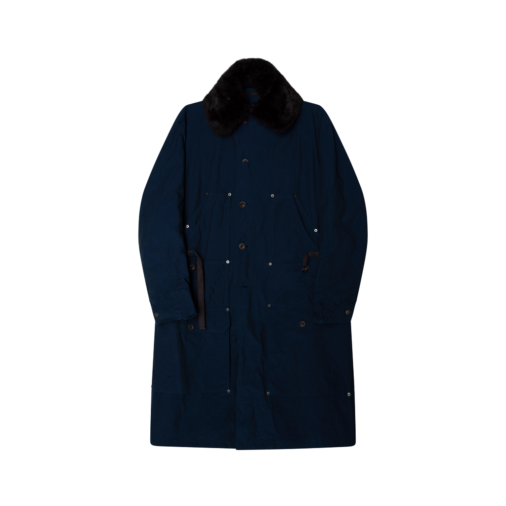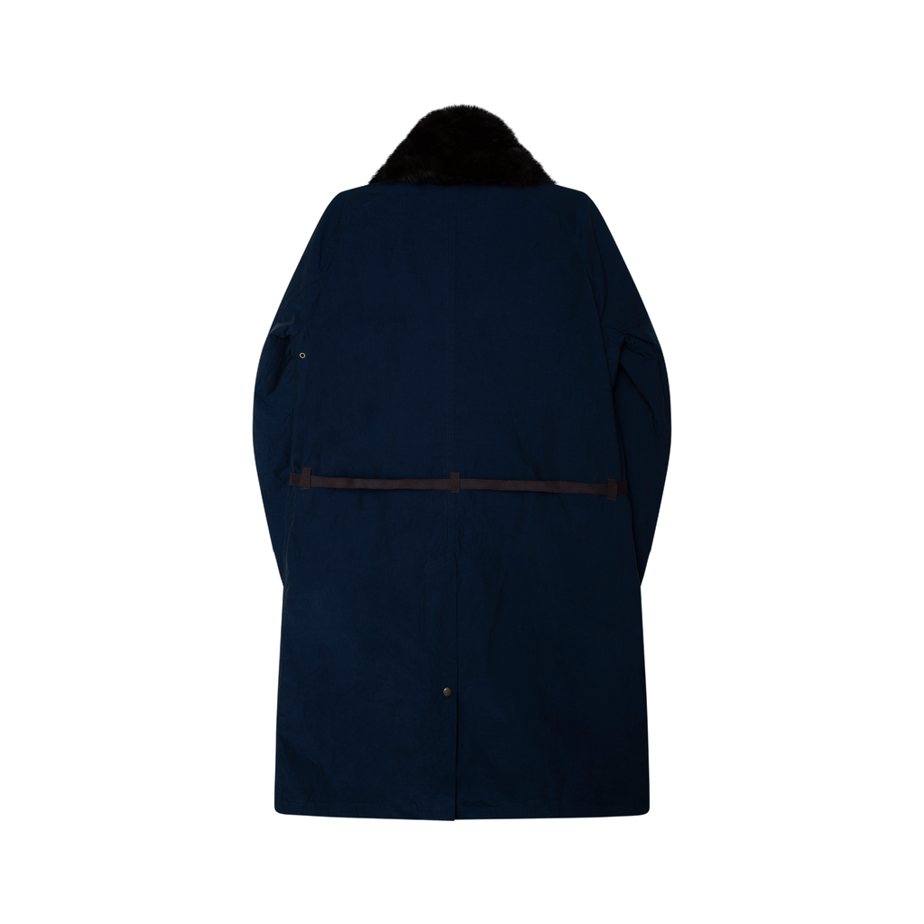 Kolor Navy Fur Collar Parka features brown fur collar, utilitarian pockets on front, front button closure, and detachable brown string belt.