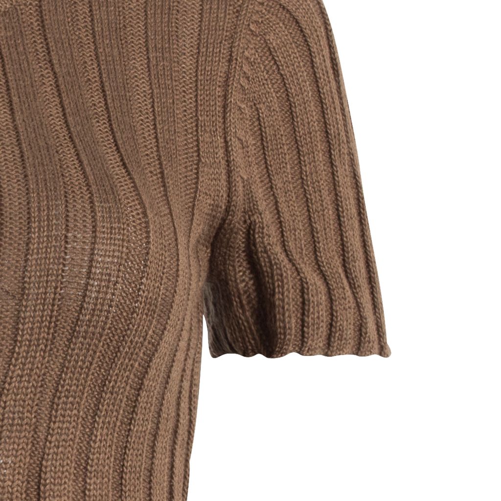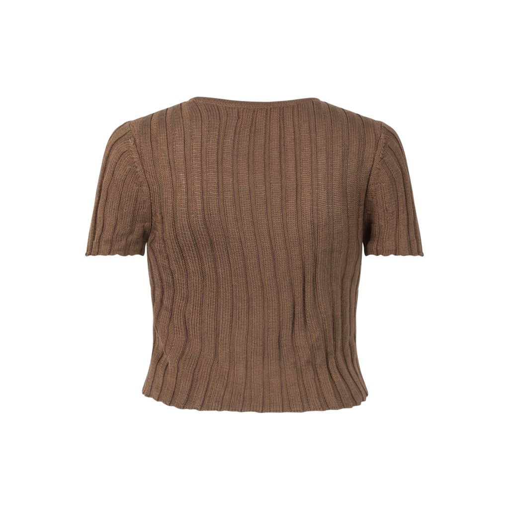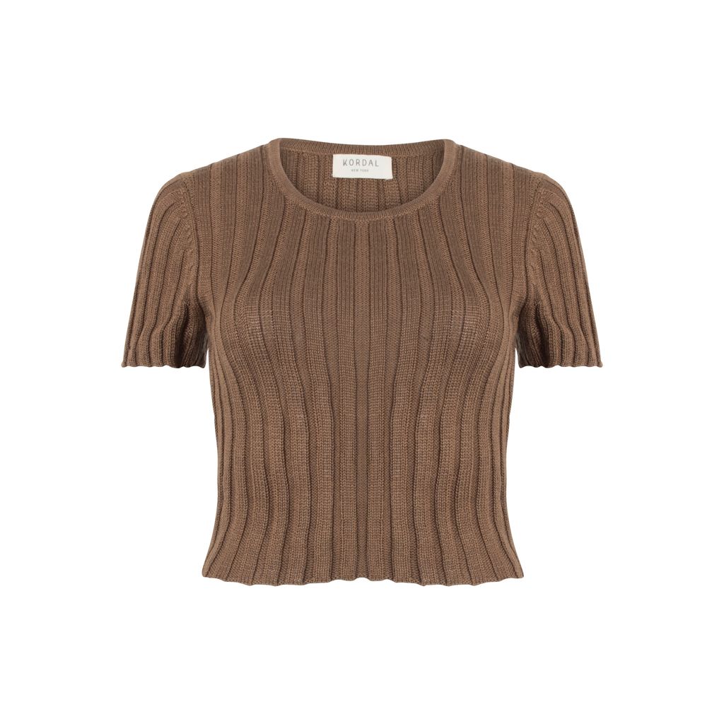 In a beautiful blend of silk and alpaca, this classic tee has a distinct rib knit which perfectly molds to your body. Inspired by the simplicity of the early 90’s, this top has accentuated texture, slightly longer short sleeves, and the scoop neck. Gently worn.