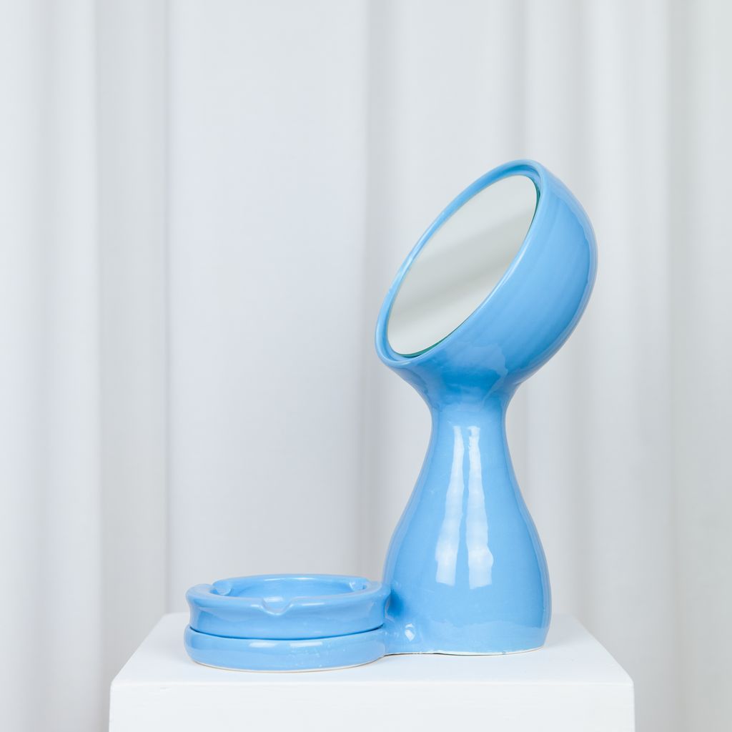 Mirror with detachable ashtray in white earthenware. This piece is designed and handcrafted in the south of France.