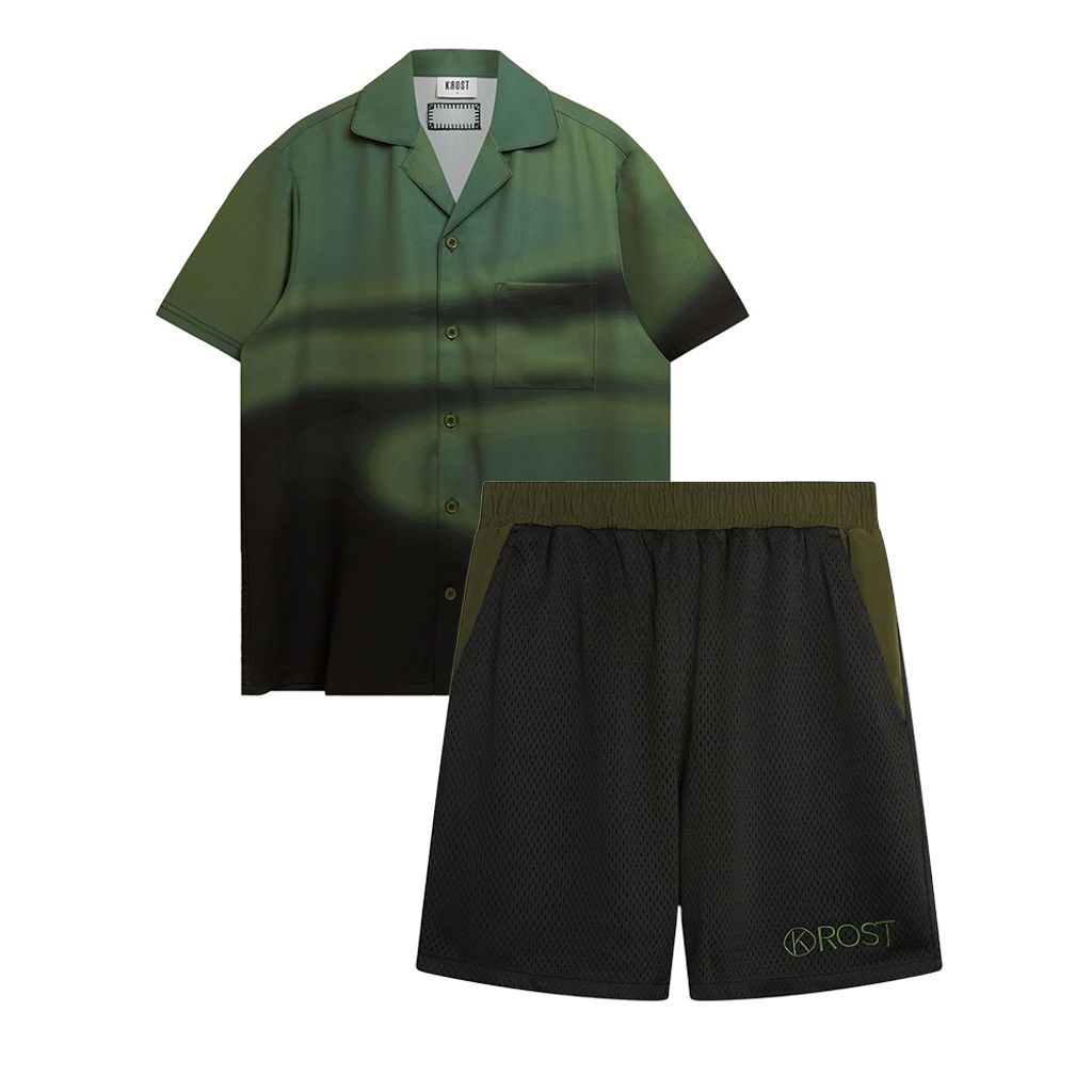 Top & Bottom set featuring the Wavy Bowling Shirt and the Mesh Shorts. Both pieces are from Samuel Krost.