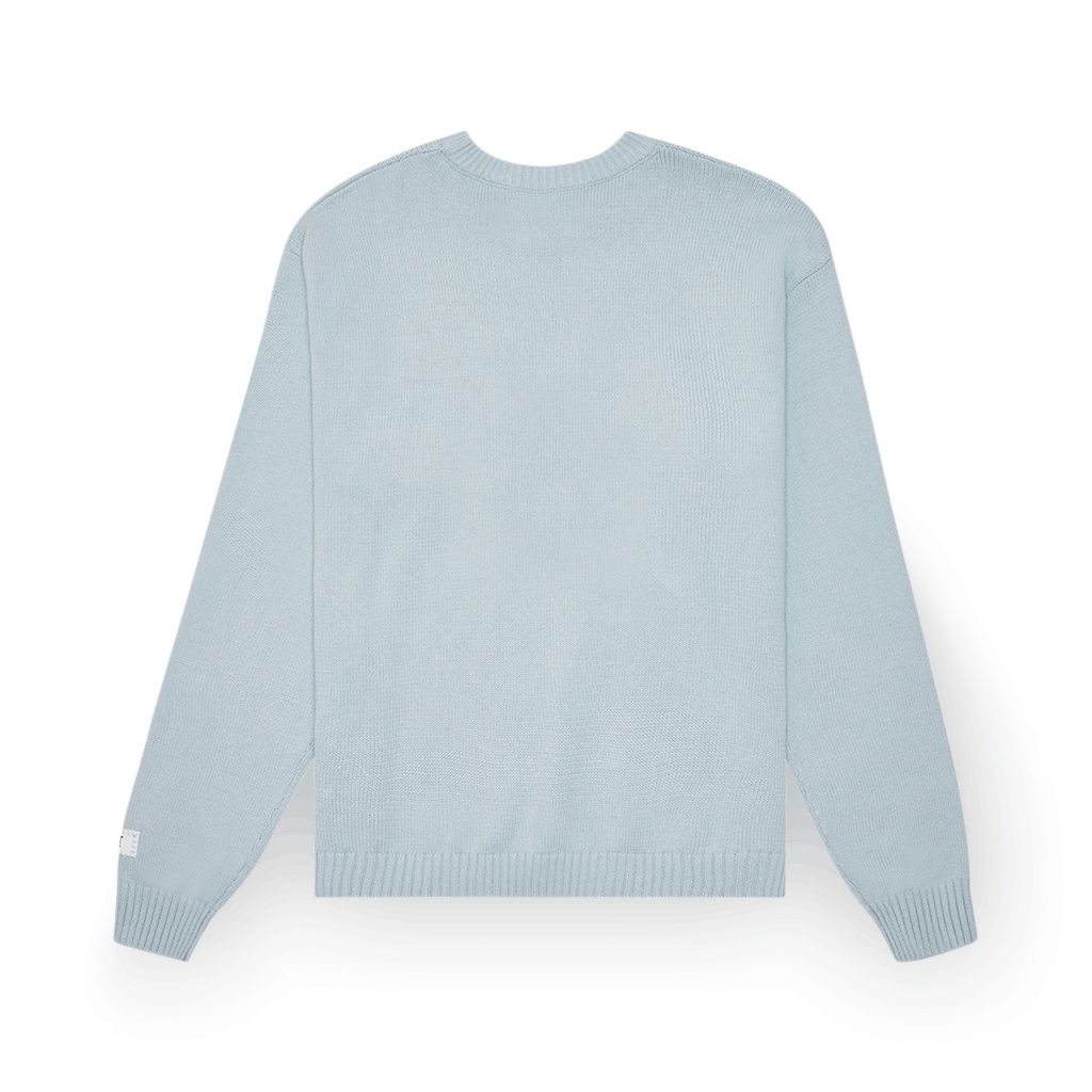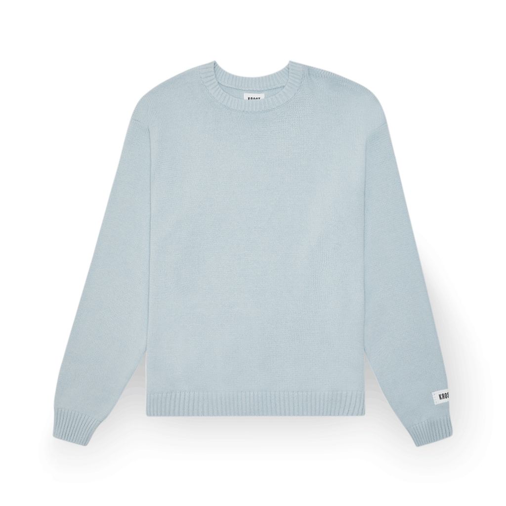Krost 100% cotton knit blue sweater features the Krost logo on the sleeve.