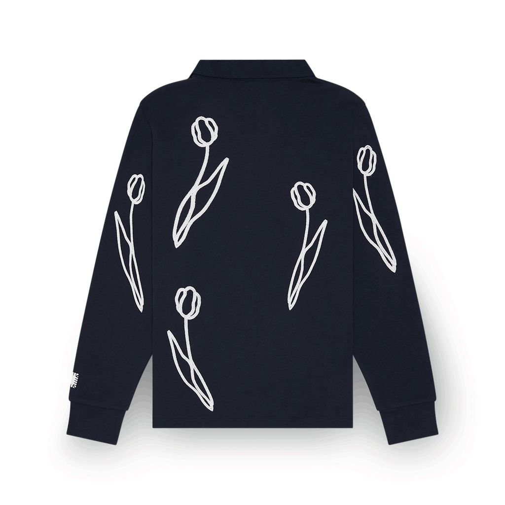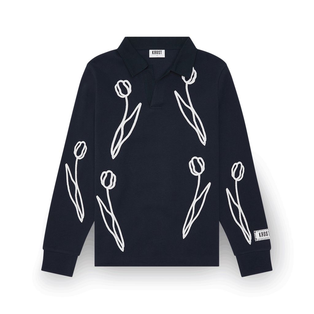 Krost tulip rugby shirt features a cream tulip pattern on navy fabric and the Krost logo at the sleeve.
