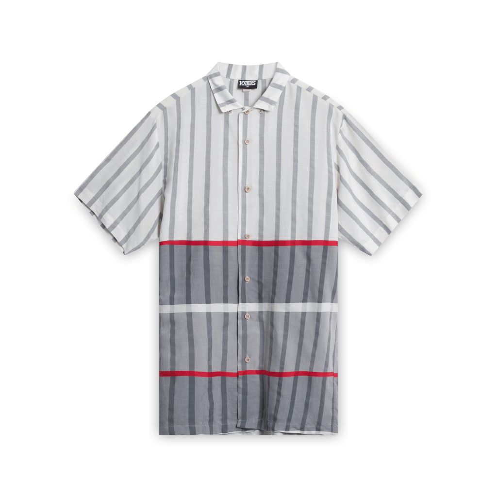 This short-sleeve collared button-down from Kudos features vertical soft grey stripes is contrasted by red and white horizontal stripes for a retro feel.