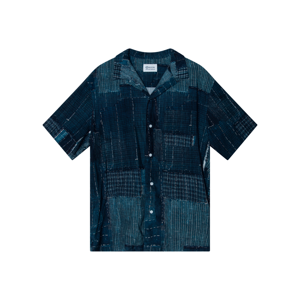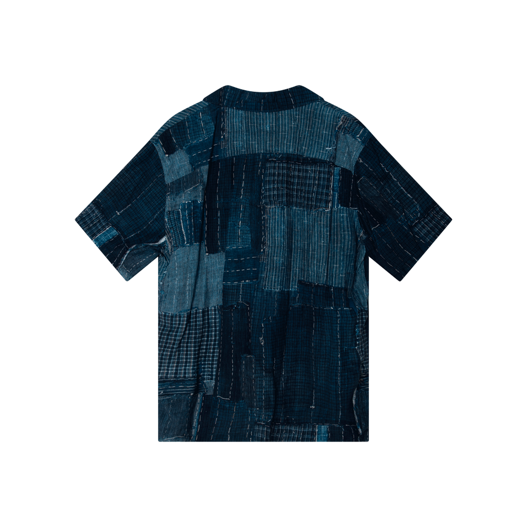 KUON Boro Hawaiian Shirt in Navy features intricately produced printed tribute to traditional Japanese boro throughout, relaxed fit, open collar, front button closure, and single chest patch pocket.