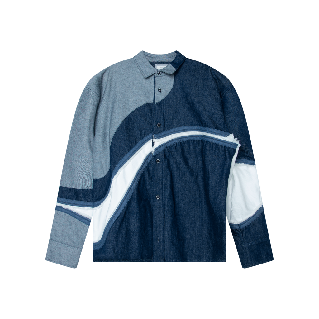 KUSIKOHC Blue and White Denim Jacket features front button closure and denim cut out patchwork design.