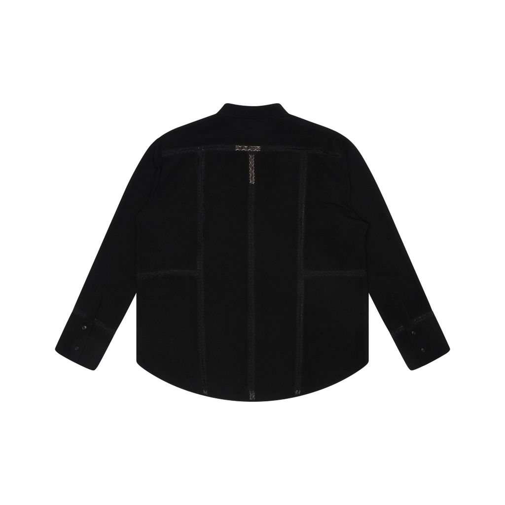 La Ligne Marlien Blouse features lace inserts placed in patchwork seams, stretch crepe, relaxed fit, and front button closure.