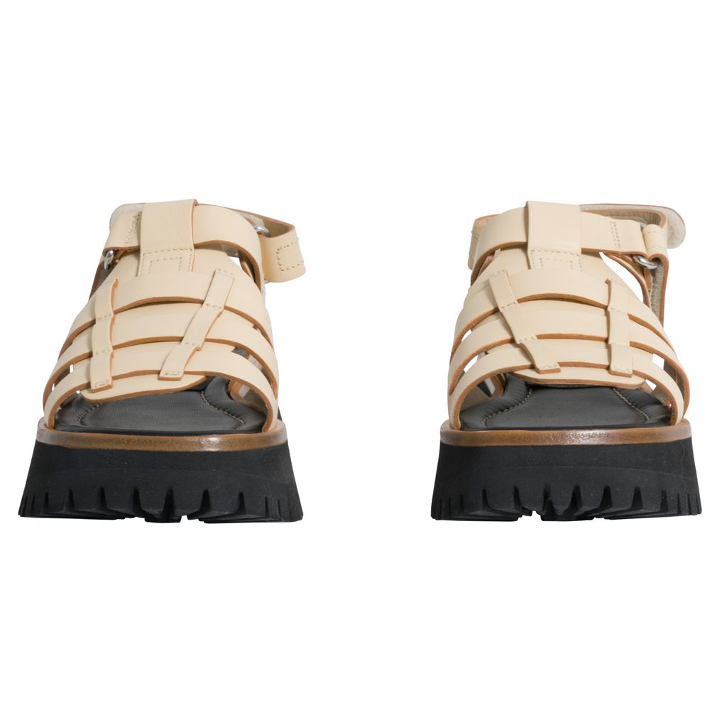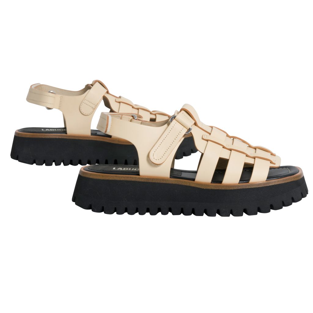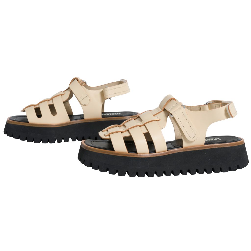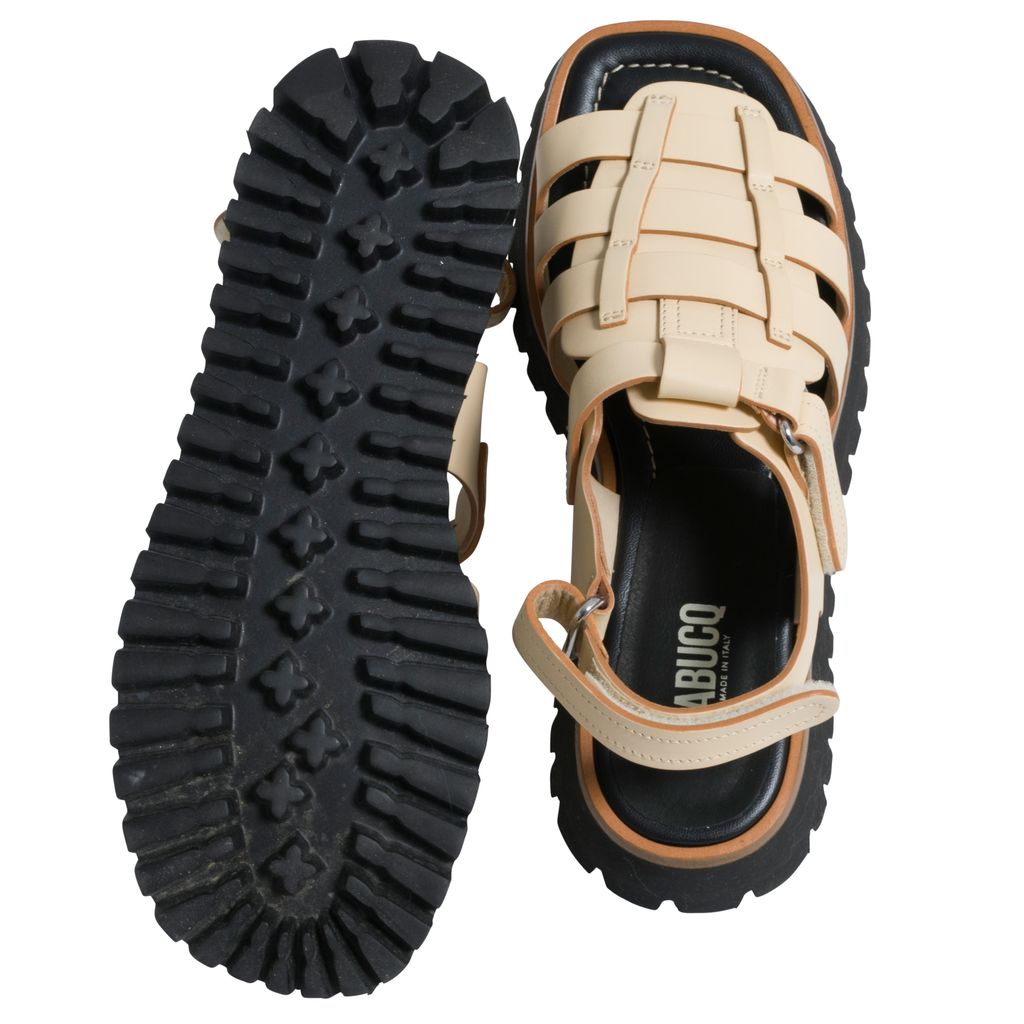 Handmade in Tuscany, these sandals from Labucq feature Italian vegetable-tanned calf leather uppers with calf leather lining, hook and loop closure straps, and foam cushioned insole. In excellent condition. Comes in original box.