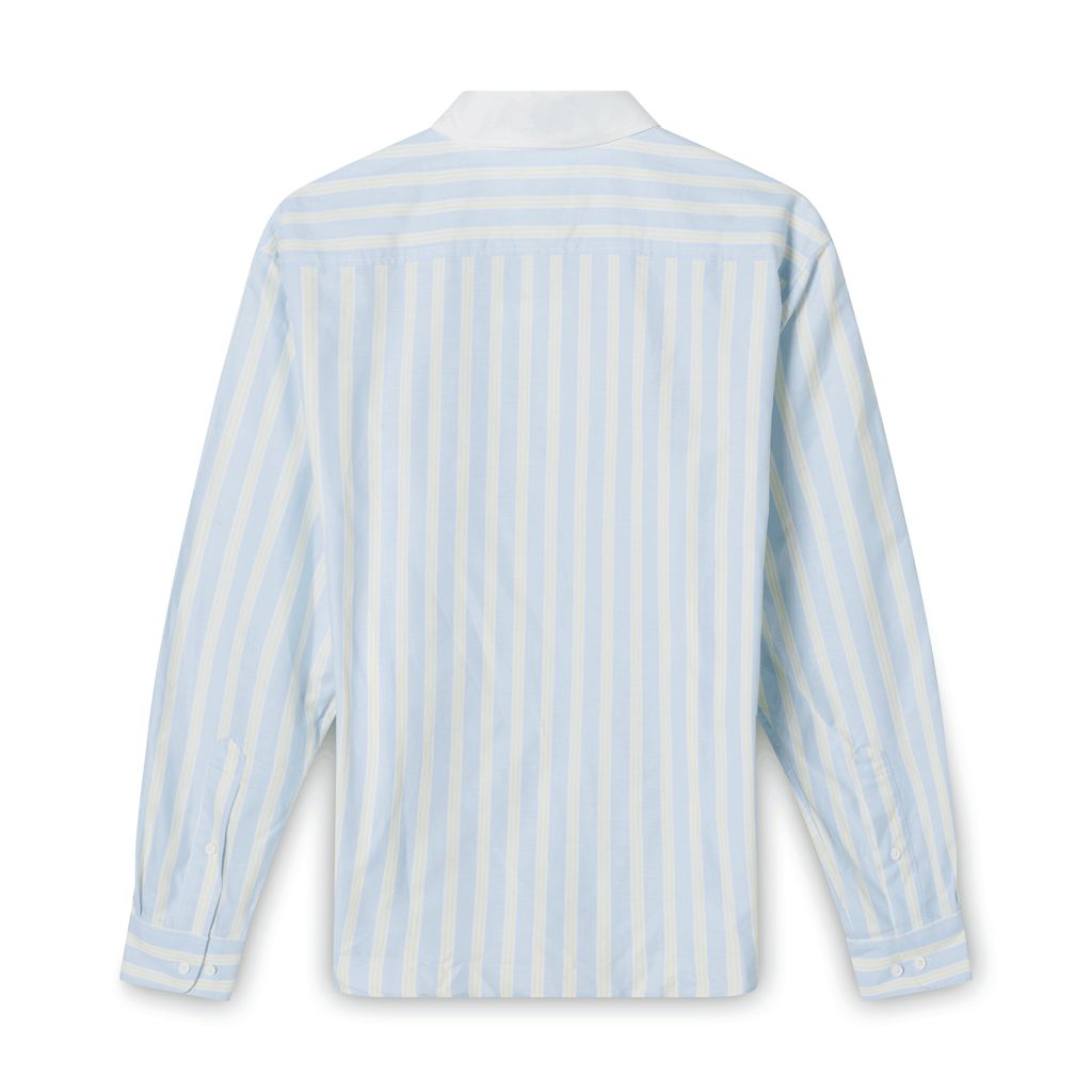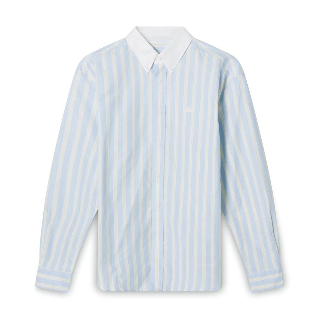 This sample size Lacoste button down features light blue and yellow coloring.