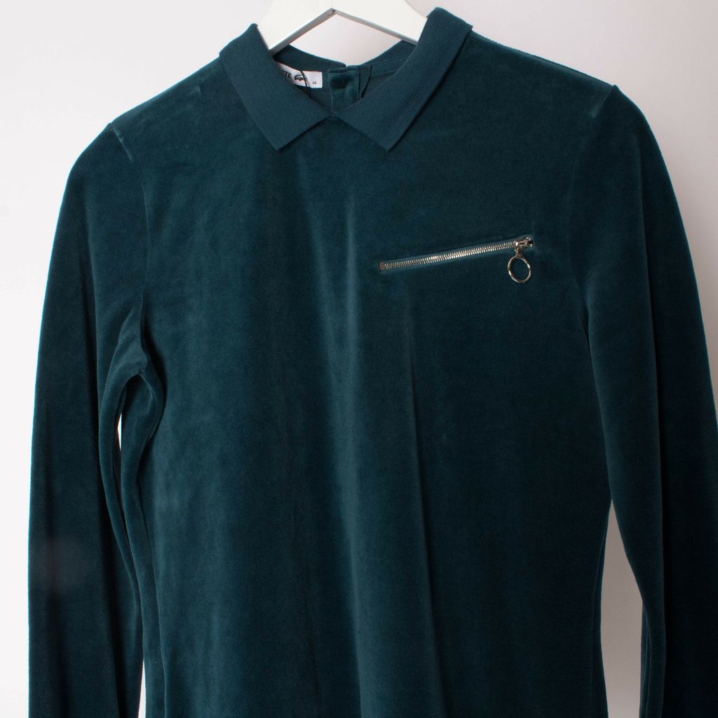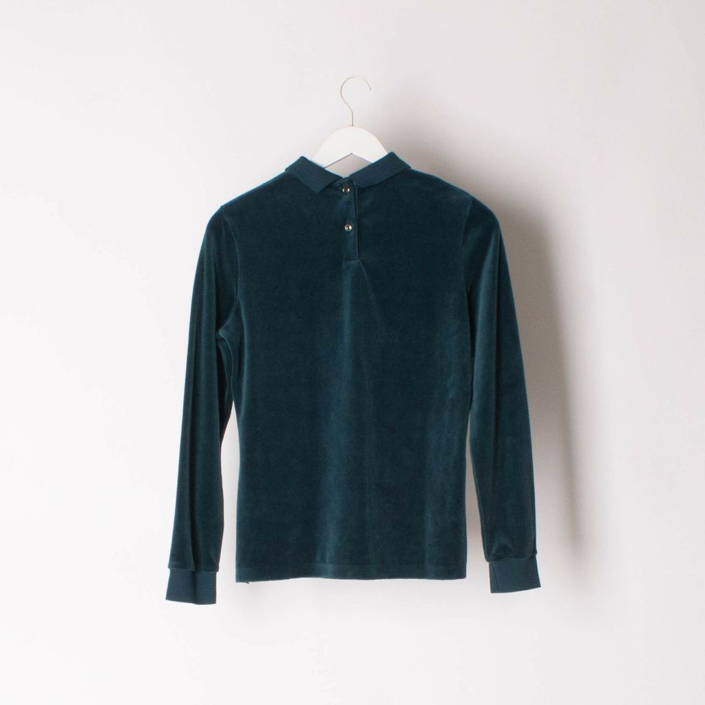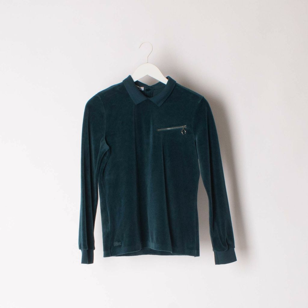 New with tags velvet long sleeve polo from Lacoste's Runway Collection. Rib knit sleeve cuffs and collar design. Front featured decorative o-ring zipper and back button closure.