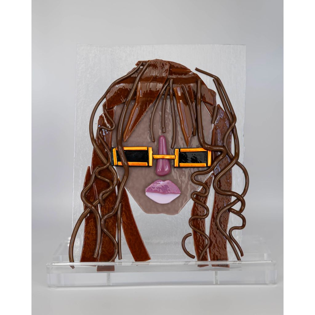 A striking, one-of-a-kind portrait crafted entirely from glass and recycled scrap glass. Each shard is carefully selected and fused to create a harmonious blend of bold edges and soft, fluid forms.