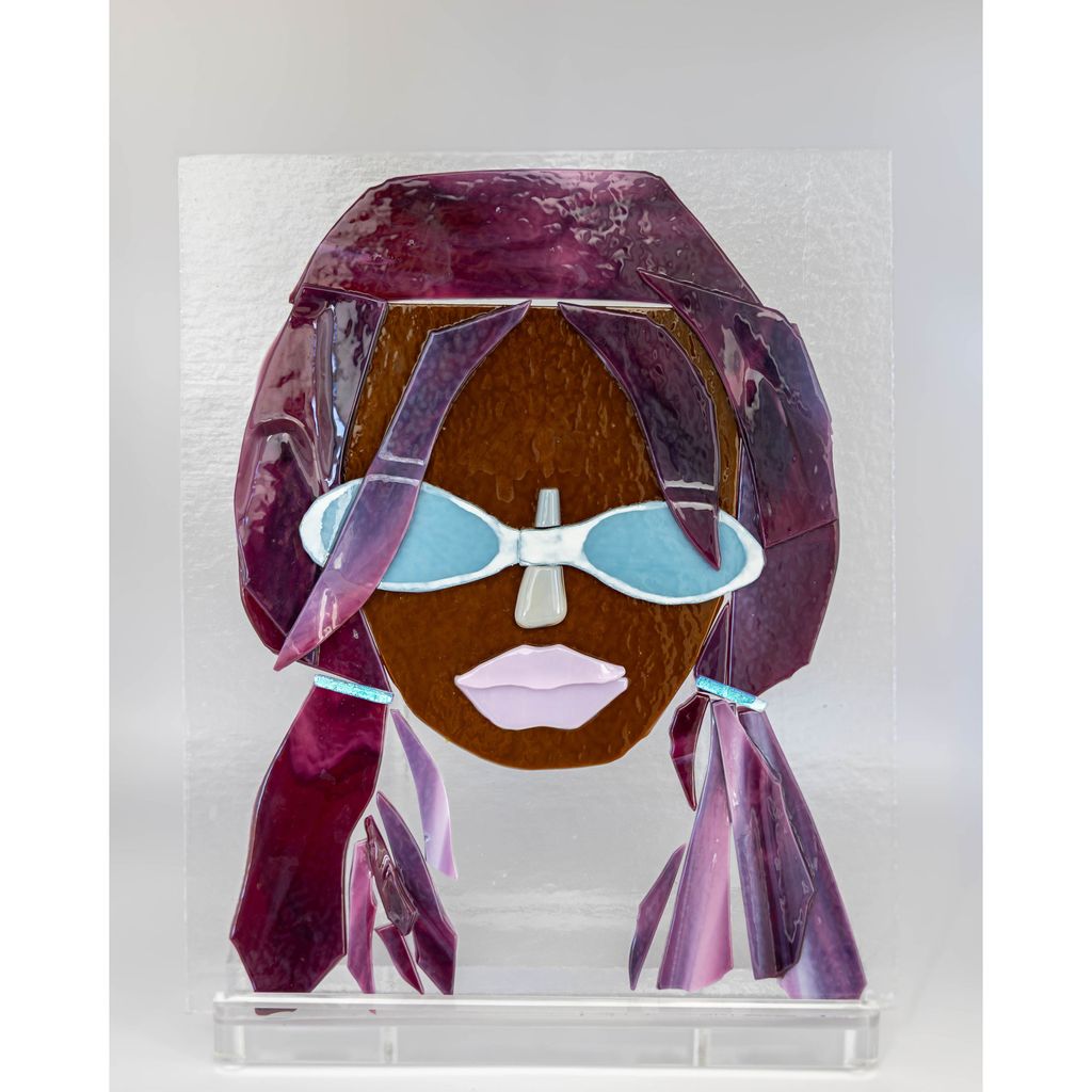 A striking, one-of-a-kind portrait crafted entirely from glass and recycled scrap glass. Each shard is carefully selected and fused to create a harmonious blend of bold edges and soft, fluid forms.