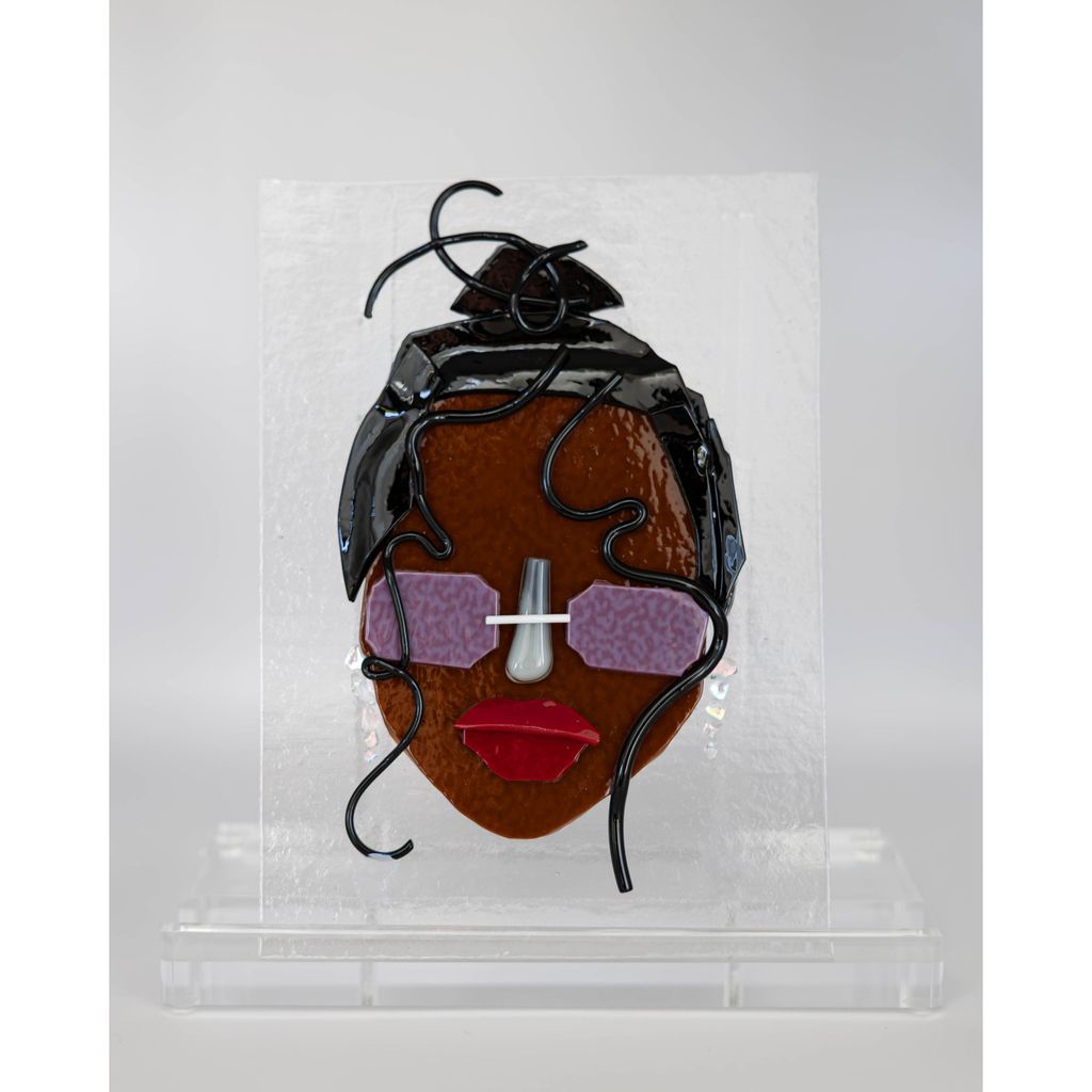 A striking, one-of-a-kind portrait crafted entirely from glass and recycled scrap glass. Each shard is carefully selected and fused to create a harmonious blend of bold edges and soft, fluid forms.