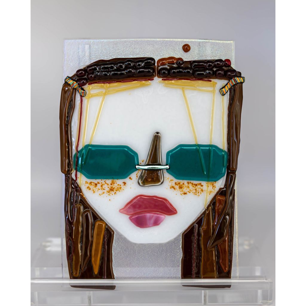 A striking, one-of-a-kind portrait crafted entirely from glass and recycled scrap glass. Each shard is carefully selected and fused to create a harmonious blend of bold edges and soft, fluid forms.