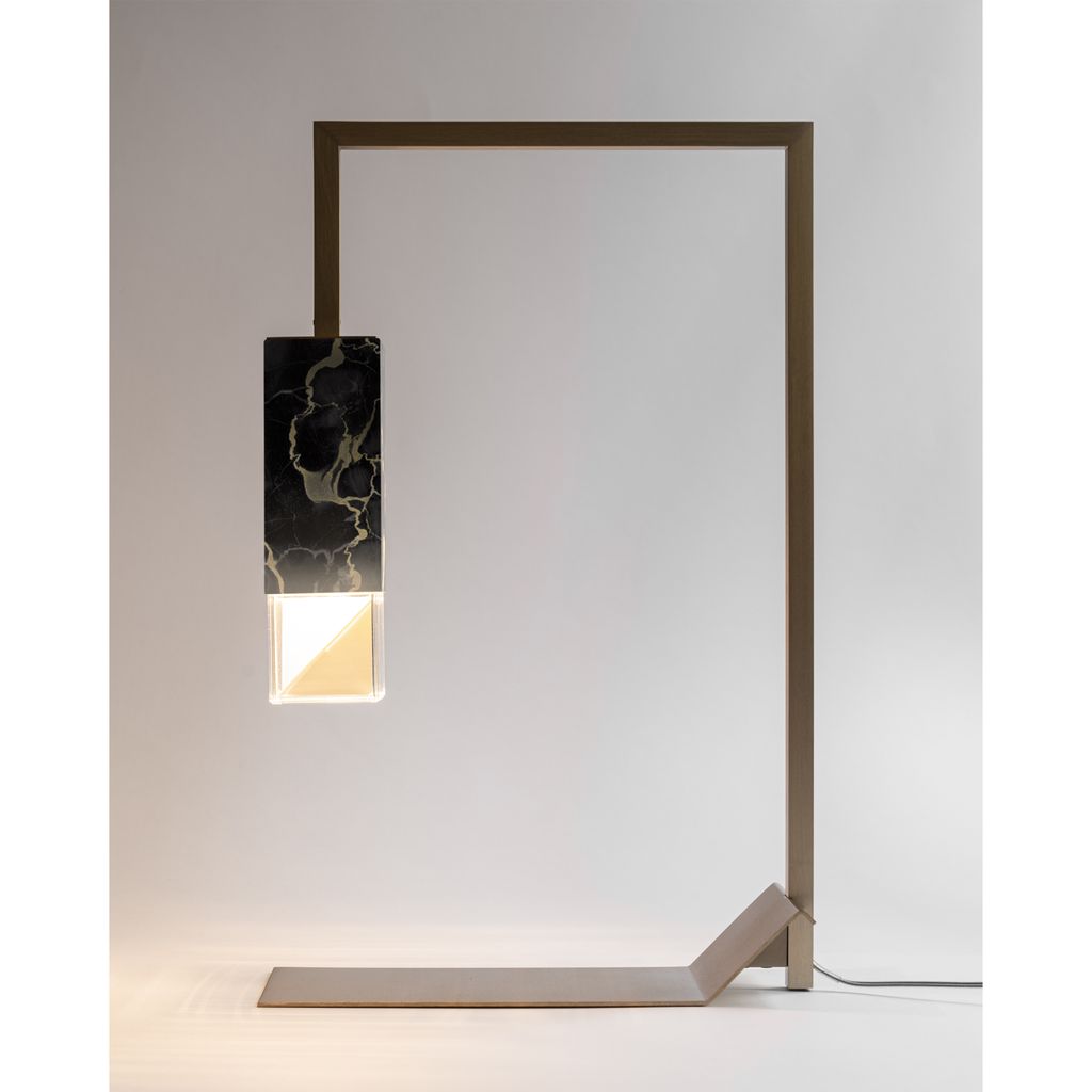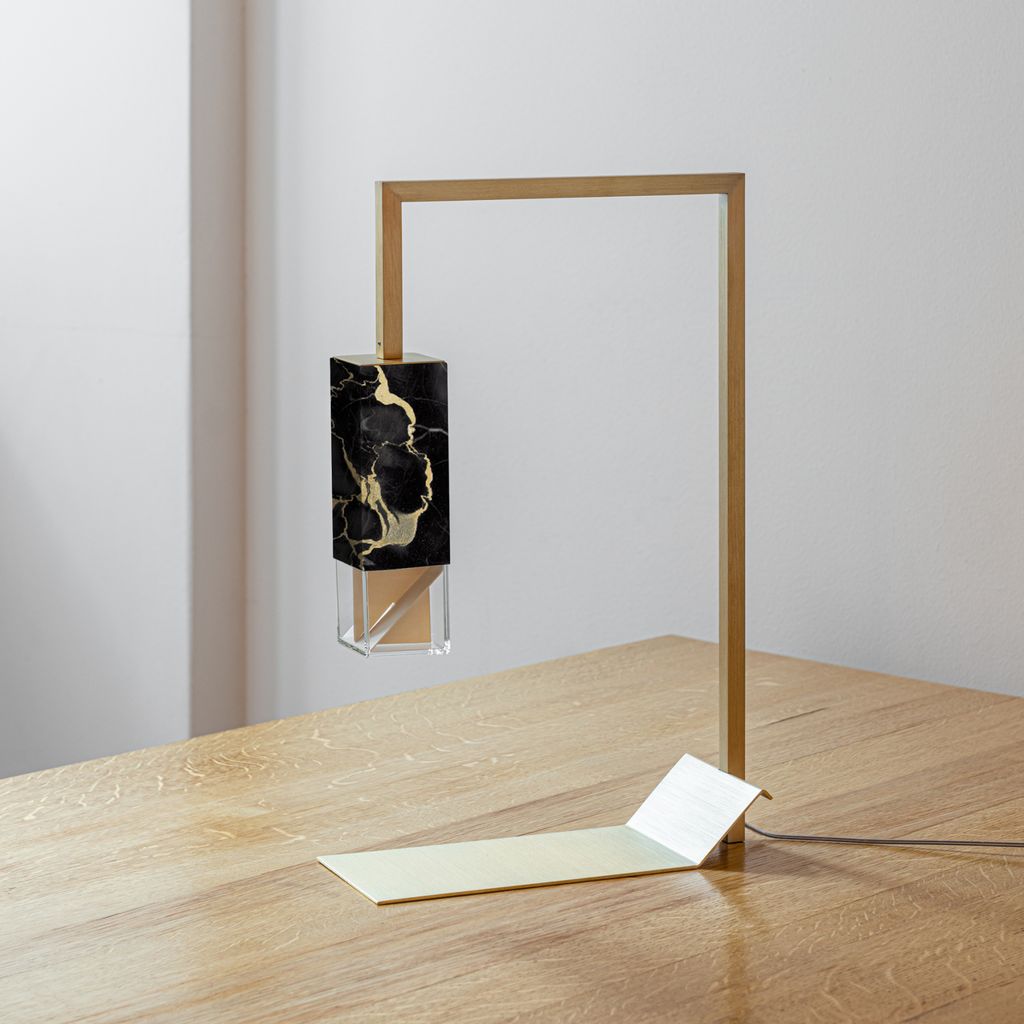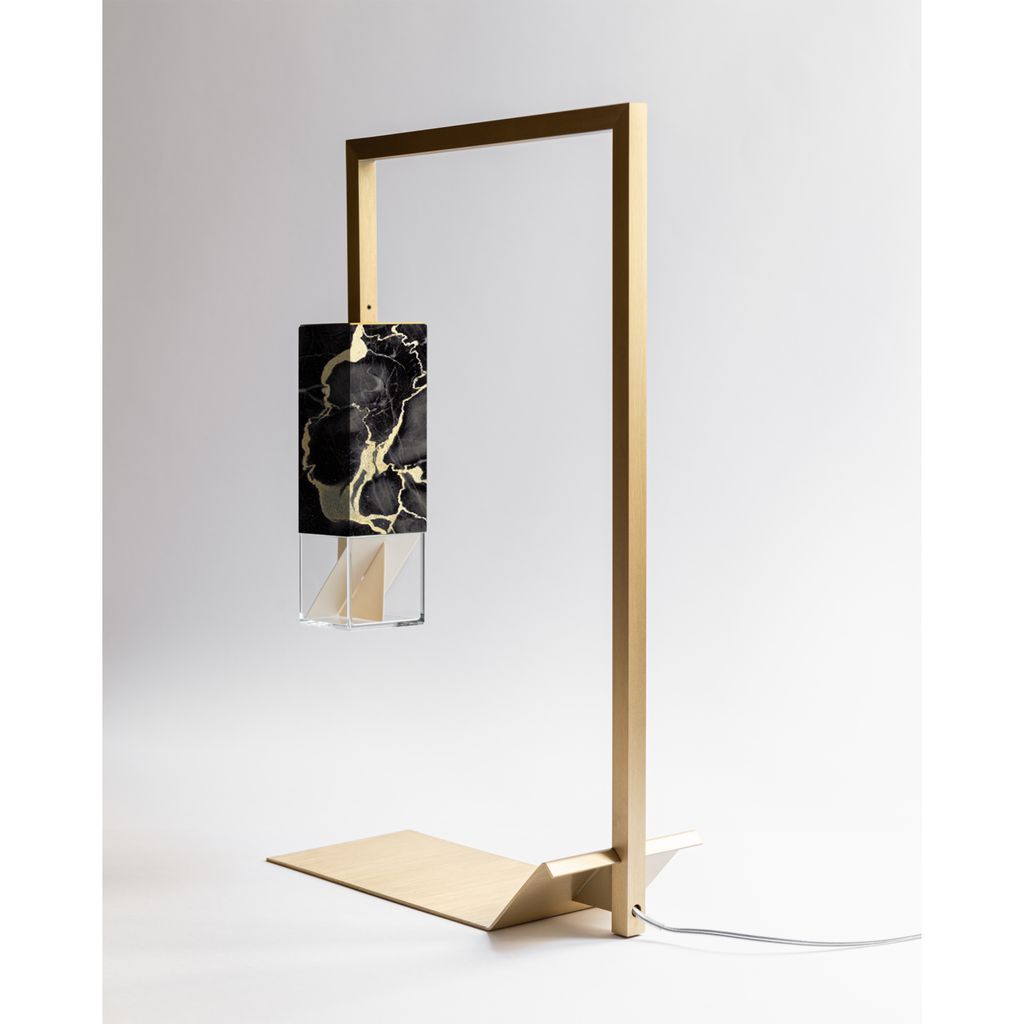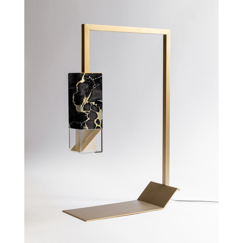 Part of the Lamp/s Collection Black Edition, Lamp/Two Black represents the sophisticated and luxurious décor object that any Interior needs. The solid marble Portoro Gold vein, known also as “Black & Gold marble”, here is masterly handcrafted by the excellence of Formaminima artisans, and characterised by a velvety black background, crossed by precious large yellow-gold veins. Extracted from the beautiful “Gulf of Poets” of Portovenere in Liguria-Italy, this prestigious polychromatic marble has been employed, among others, in the decoration of Versailles castle in France. A sleek solid brass squared tubular, enriched by the golden nuance of a satin matt finish, perfectly matches with the golden veins of Portoro Gold, designing the silhouette of this refined table light, which provides a soft downlight into the surrounding space.