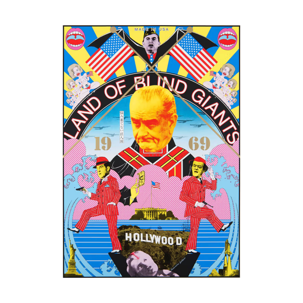 A limited-edition silkscreen print (edition 26 of 70), Land of the Blind Giants embodies Yokoo’s layered visual lexicon—where myth, memory, and modernity collide. The composition offers fragmented imagery: imagined landscapes, looming silhouettes, and symbolic forms that blur boundaries between the seen and unseen.