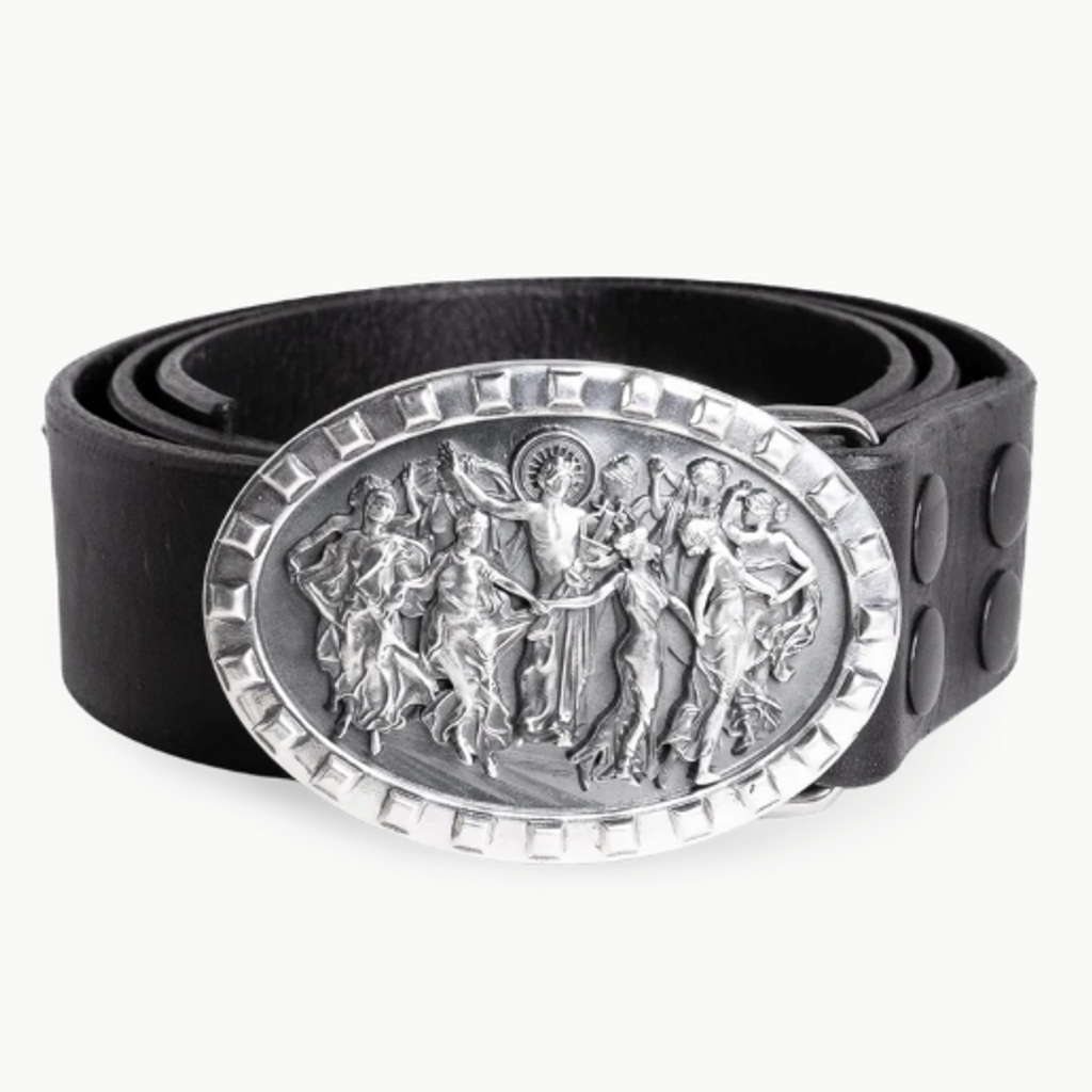 The god Apollo is surrounded by his nine Muses‚ goddesses embodying the arts. This monumental buckle is rendered in precious solid Sterling Silver, and secured on a weighty Tuscan leather strap.