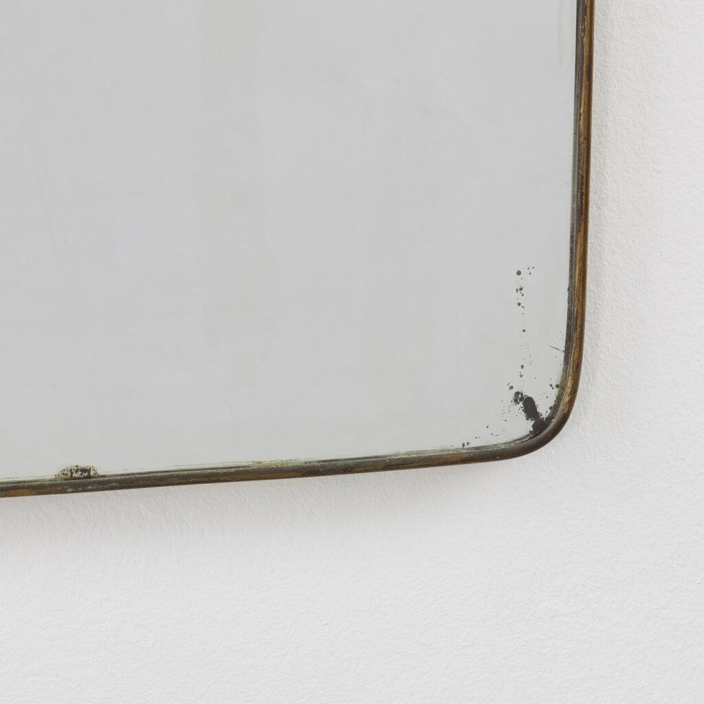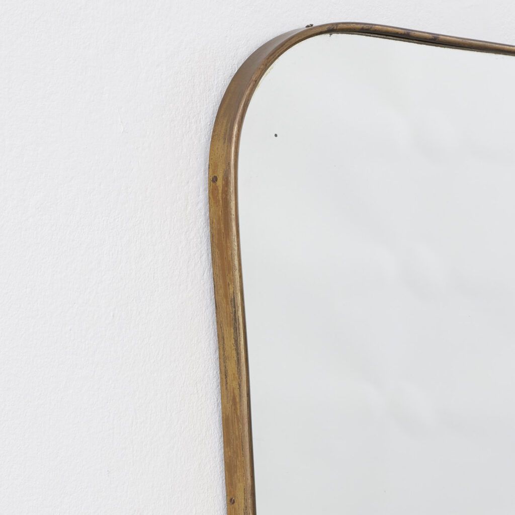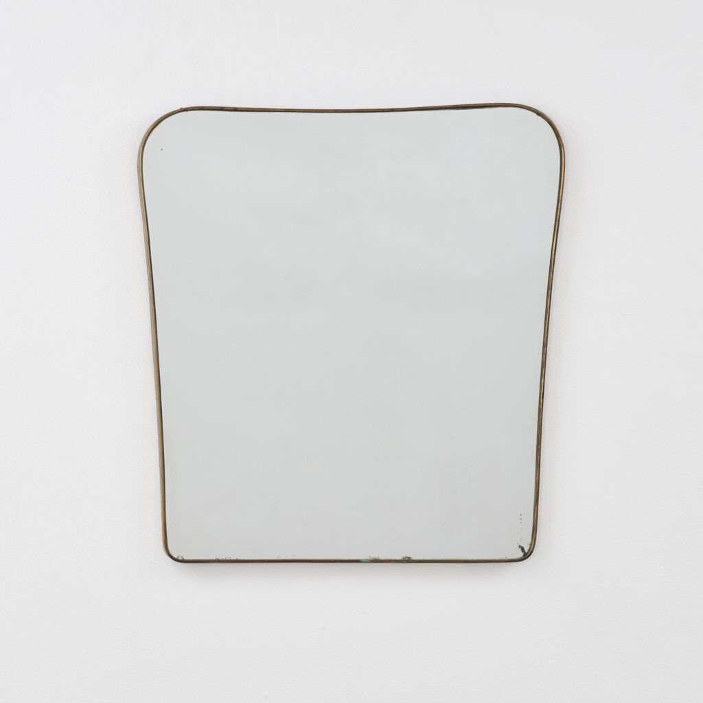 A mid-century brass mirror with a distinctive dipped top that recalls Gio Ponti’s F.A. 33 design for FontanaArte. Its straight lower edge makes it well suited to a spot above a mantelpiece.