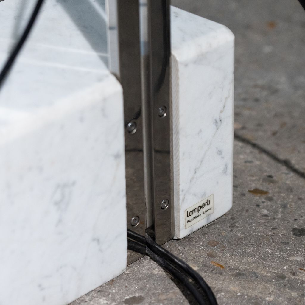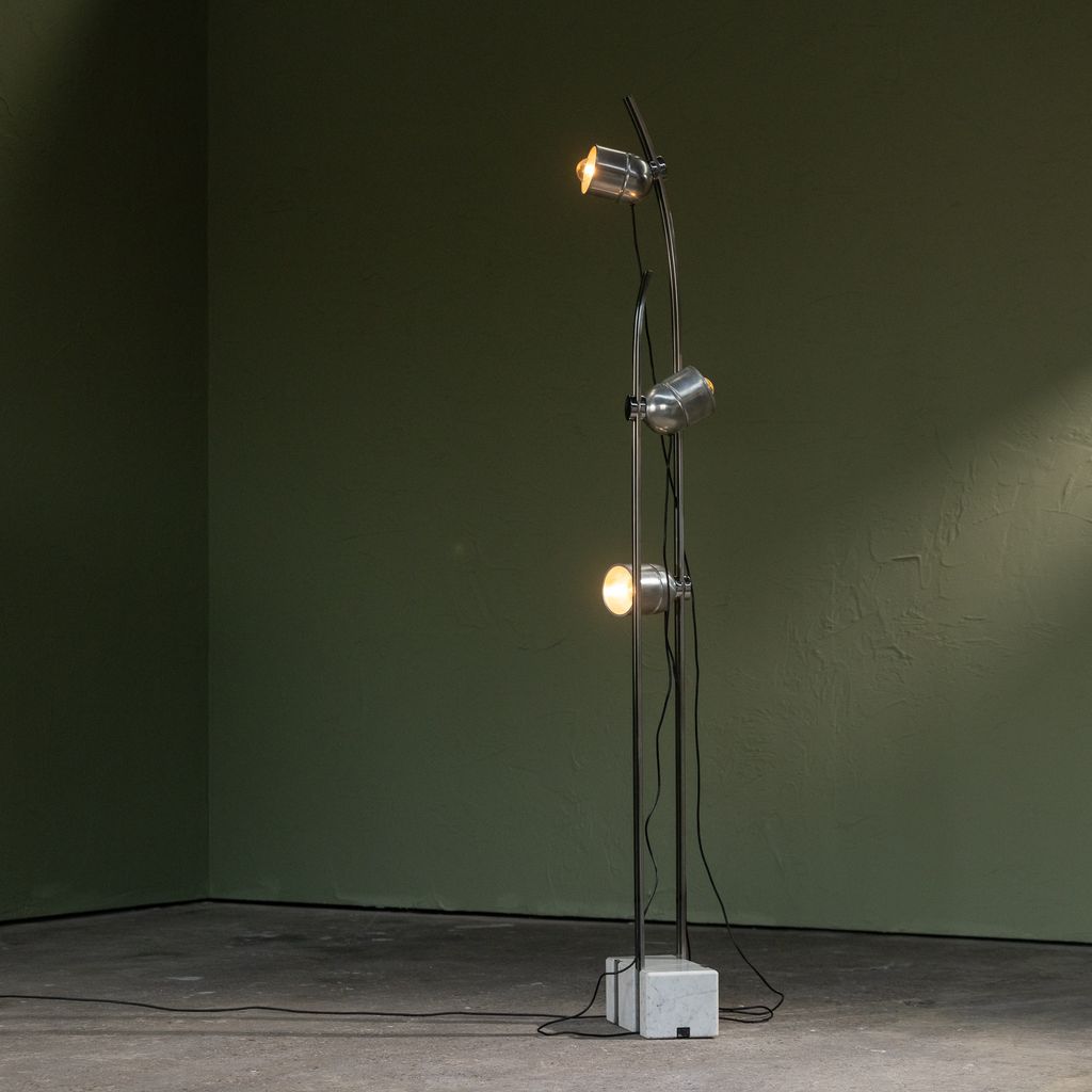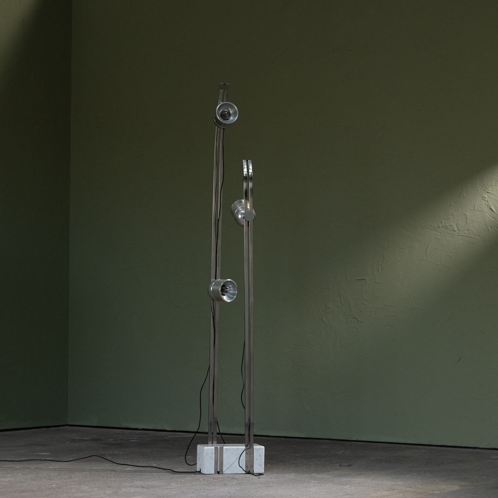 This Italian floor lamp by Lamperti, dating from the 1970s, features a white marble base supporting two large vertical chrome stems. One stem is equipped with two adjustable light shades in chrome, allowing the direction of light to be modified as needed, while the other stem carries a single chrome shade that can also be adjusted in multiple positions. The lamp’s design emphasizes functionality and versatility, providing multiple light sources within a single structure. The marble base ensures stability for the lamp’s considerable height, while the chrome stems contribute to a clean, linear aesthetic typical of Italian lighting design from this period. The combination of marble and chrome, along with the adjustable shades, allows the lamp to serve both practical and decorative purposes. Its height and sculptural presence make it a striking addition to any interior, reflecting the innovative and modernist approach to lighting characteristic of Italy in the 1970s.