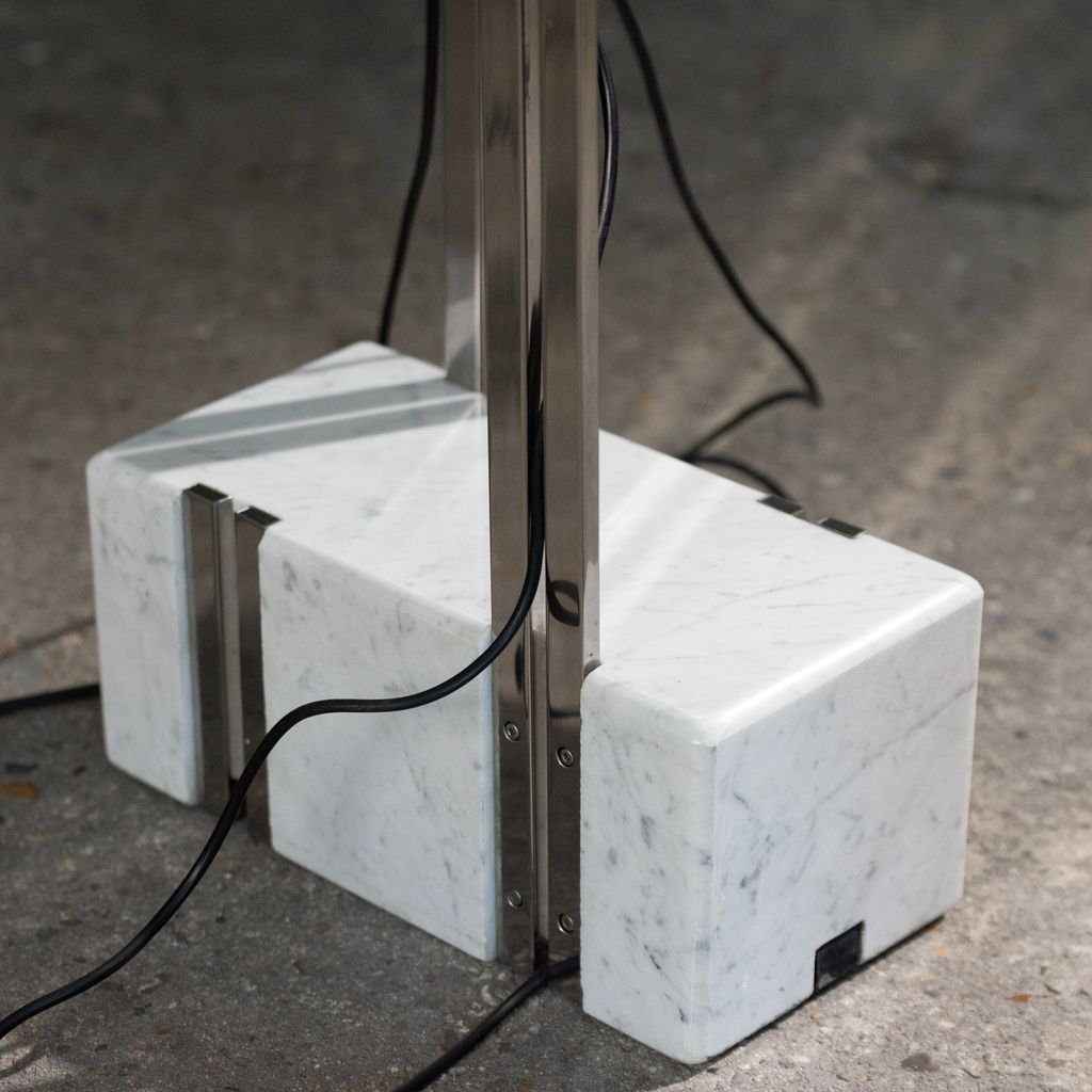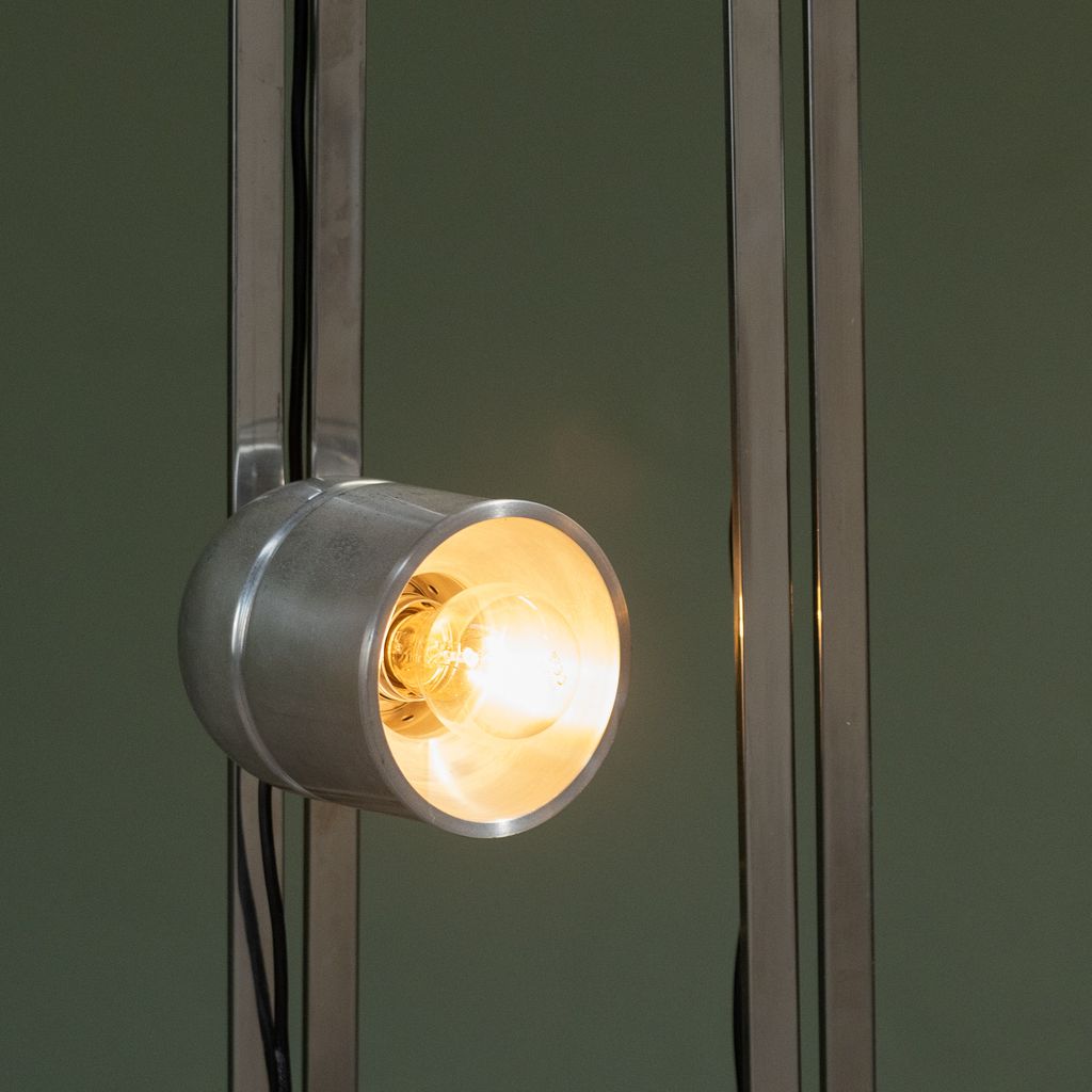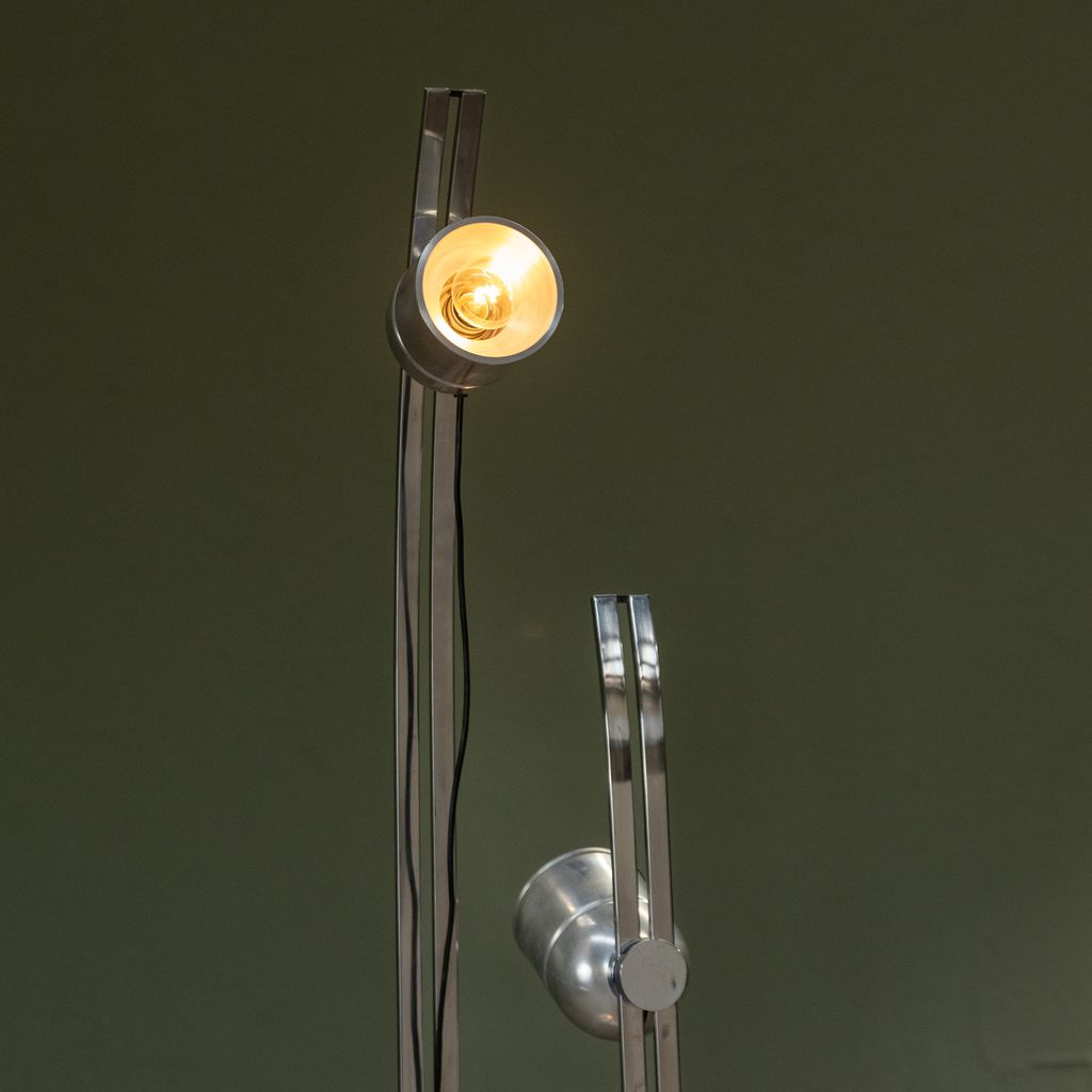 This Italian floor lamp by Lamperti, dating from the 1970s, features a white marble base supporting two large vertical chrome stems. One stem is equipped with two adjustable light shades in chrome, allowing the direction of light to be modified as needed, while the other stem carries a single chrome shade that can also be adjusted in multiple positions. The lamp’s design emphasizes functionality and versatility, providing multiple light sources within a single structure. The marble base ensures stability for the lamp’s considerable height, while the chrome stems contribute to a clean, linear aesthetic typical of Italian lighting design from this period. The combination of marble and chrome, along with the adjustable shades, allows the lamp to serve both practical and decorative purposes. Its height and sculptural presence make it a striking addition to any interior, reflecting the innovative and modernist approach to lighting characteristic of Italy in the 1970s.