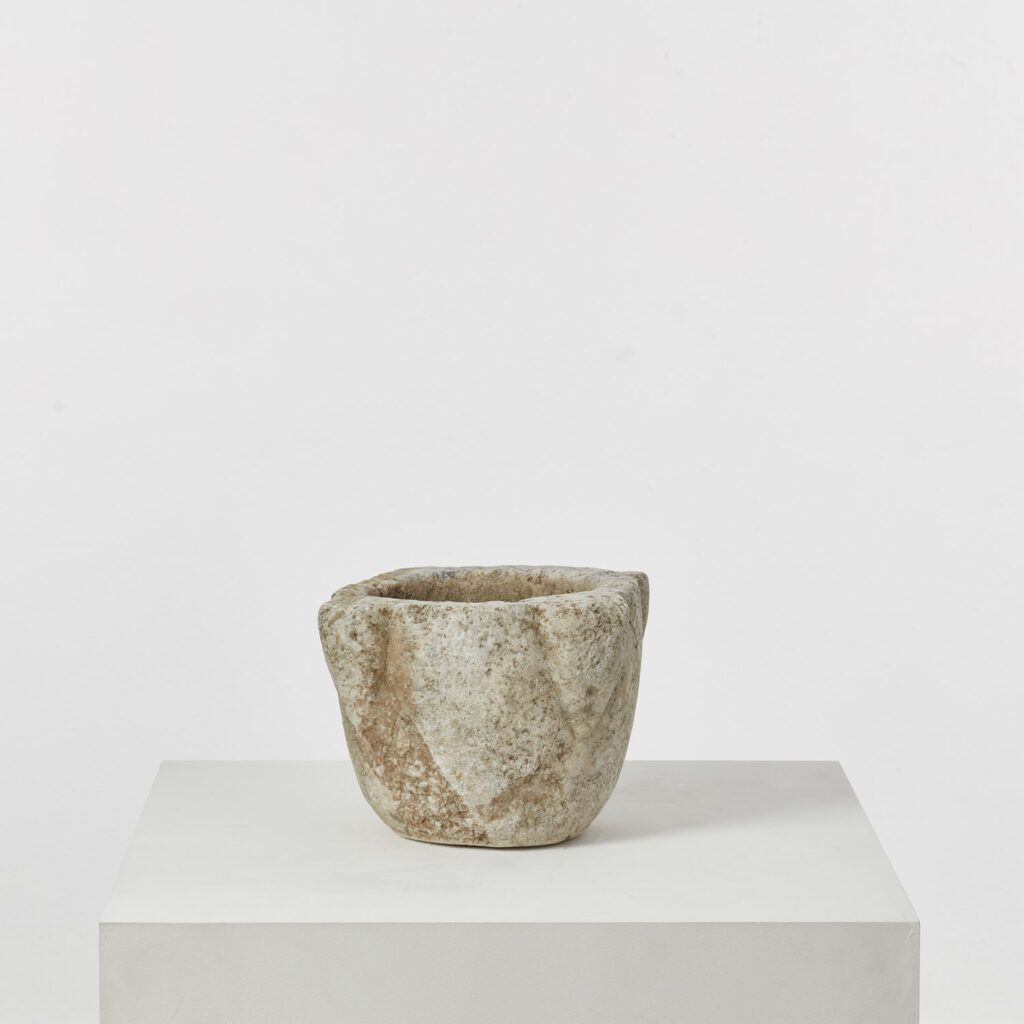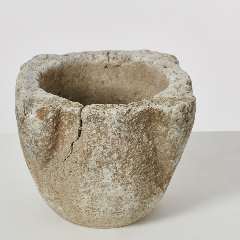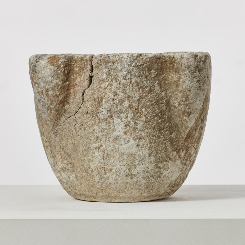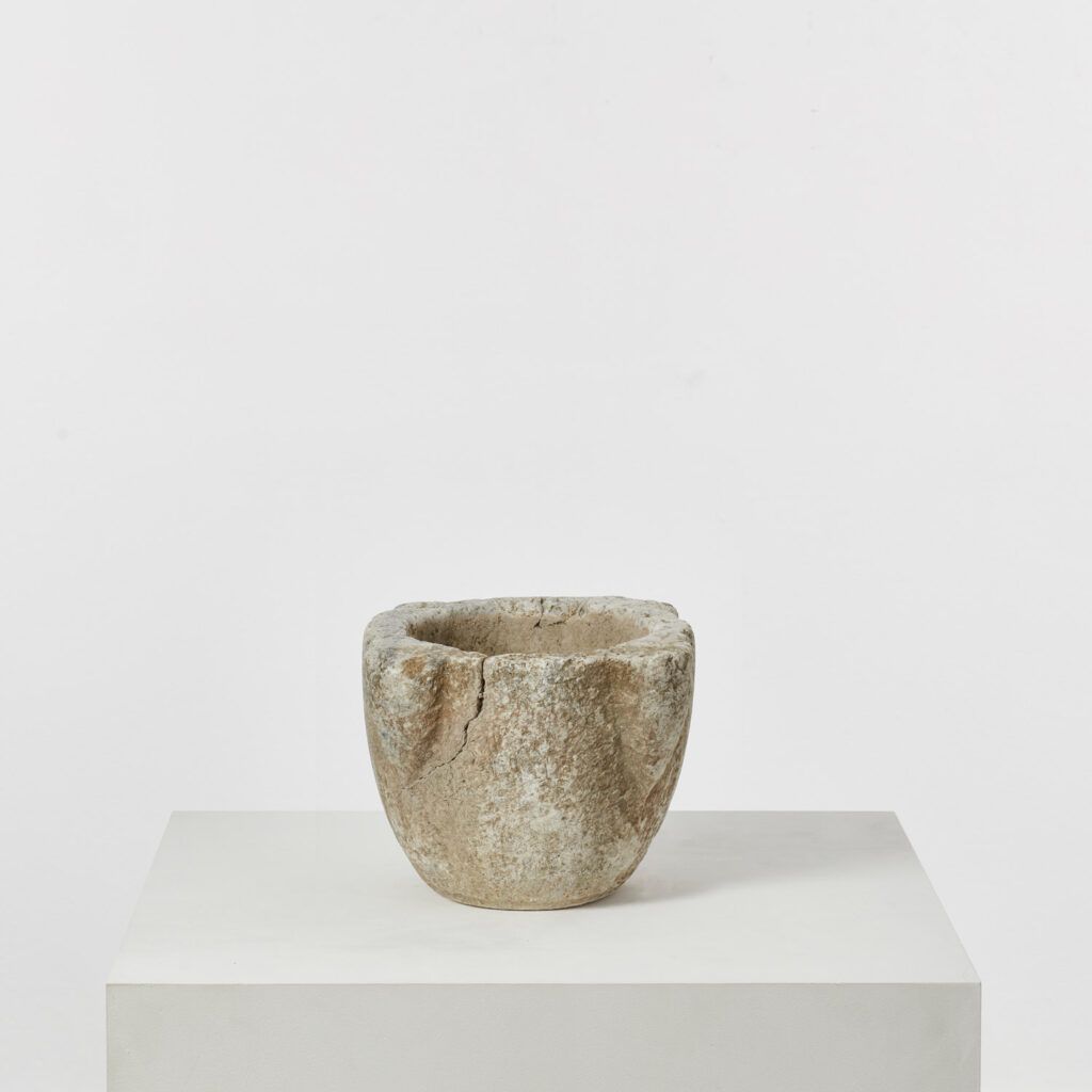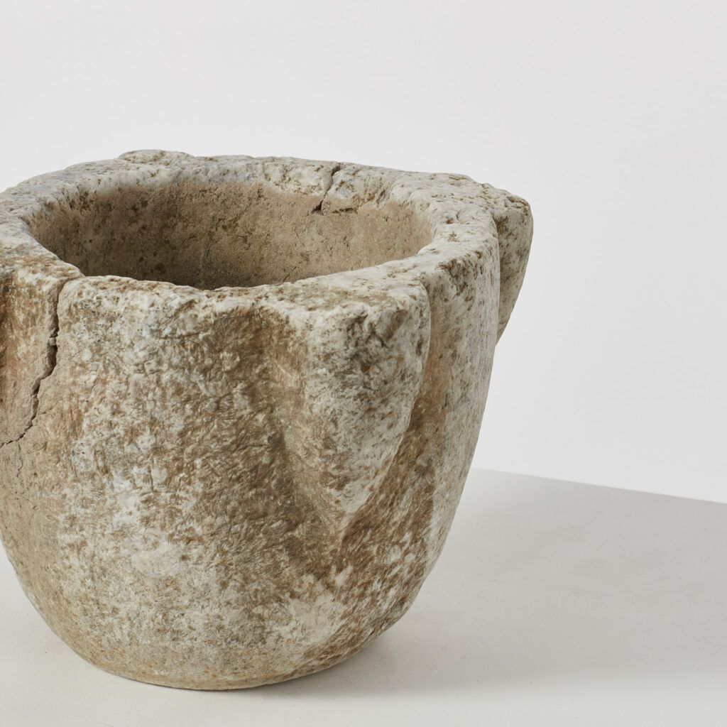 With a rich textural character and satisfying weight, this time-hewn stone mortar transcends its original function. Four handles emerge from the rounded body, expressing a now-muted geometry.