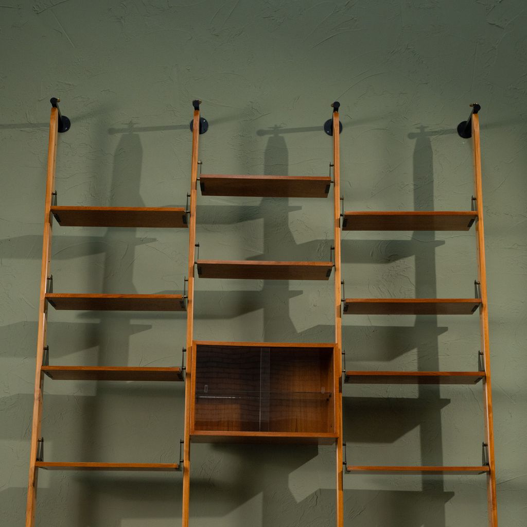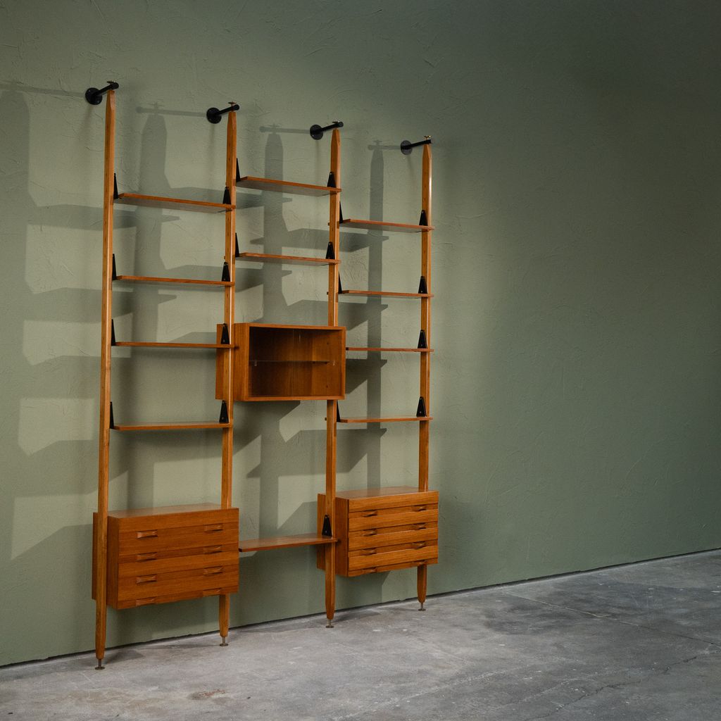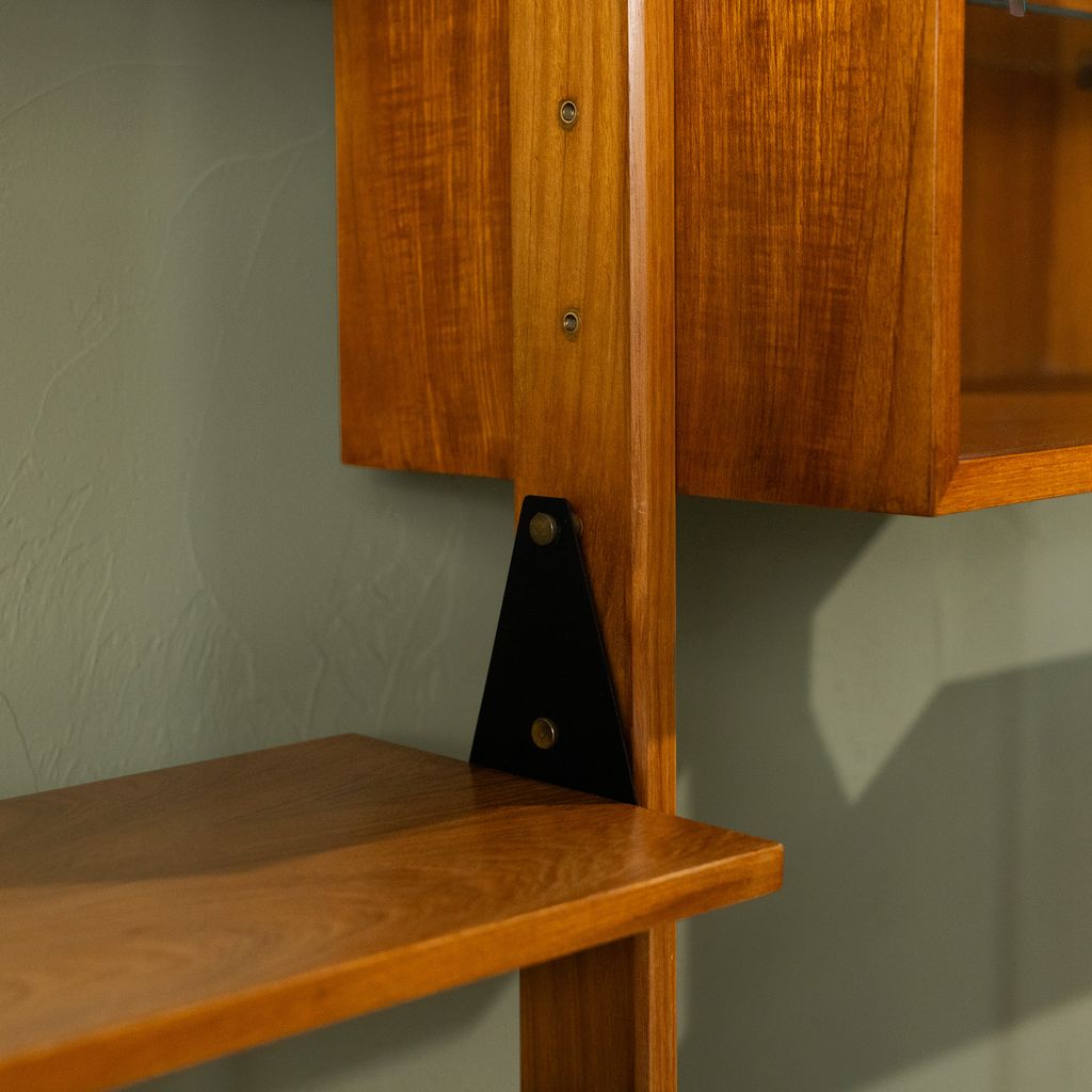 This Italian wall unit from the 1960s is made from teak with brass elements and includes two drawer cabinets and one cabinet with a glass door. The drawers feature handles cut from a single continuous layer of teak, a method that avoids additional hardware and ensures consistent detailing. The glass-fronted cabinet allows for display as well as storage. The shelving is supported by triangular black metal brackets, which connect the shelves to the vertical supports and create a visual contrast with the teak and brass. These brackets provide both structural stability and compositional balance. The modular design allows cabinets and shelves to be repositioned along the supports, offering flexibility in use and layout. Reflecting Italian furniture practices of the 1960s, the unit emphasizes adaptability, functional integration, and the combination of materials. It provides storage and display options within a framework that can be adjusted to suit different interior layouts.
