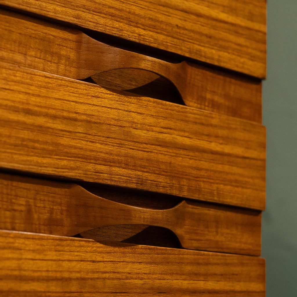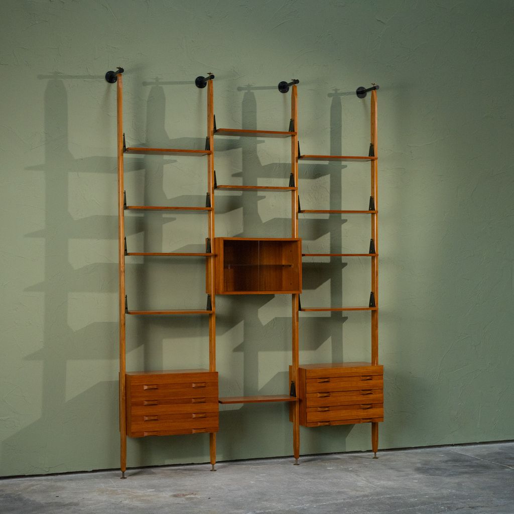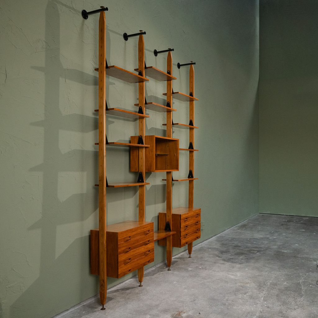 This Italian wall unit from the 1960s is made from teak with brass elements and includes two drawer cabinets and one cabinet with a glass door. The drawers feature handles cut from a single continuous layer of teak, a method that avoids additional hardware and ensures consistent detailing. The glass-fronted cabinet allows for display as well as storage. The shelving is supported by triangular black metal brackets, which connect the shelves to the vertical supports and create a visual contrast with the teak and brass. These brackets provide both structural stability and compositional balance. The modular design allows cabinets and shelves to be repositioned along the supports, offering flexibility in use and layout. Reflecting Italian furniture practices of the 1960s, the unit emphasizes adaptability, functional integration, and the combination of materials. It provides storage and display options within a framework that can be adjusted to suit different interior layouts.