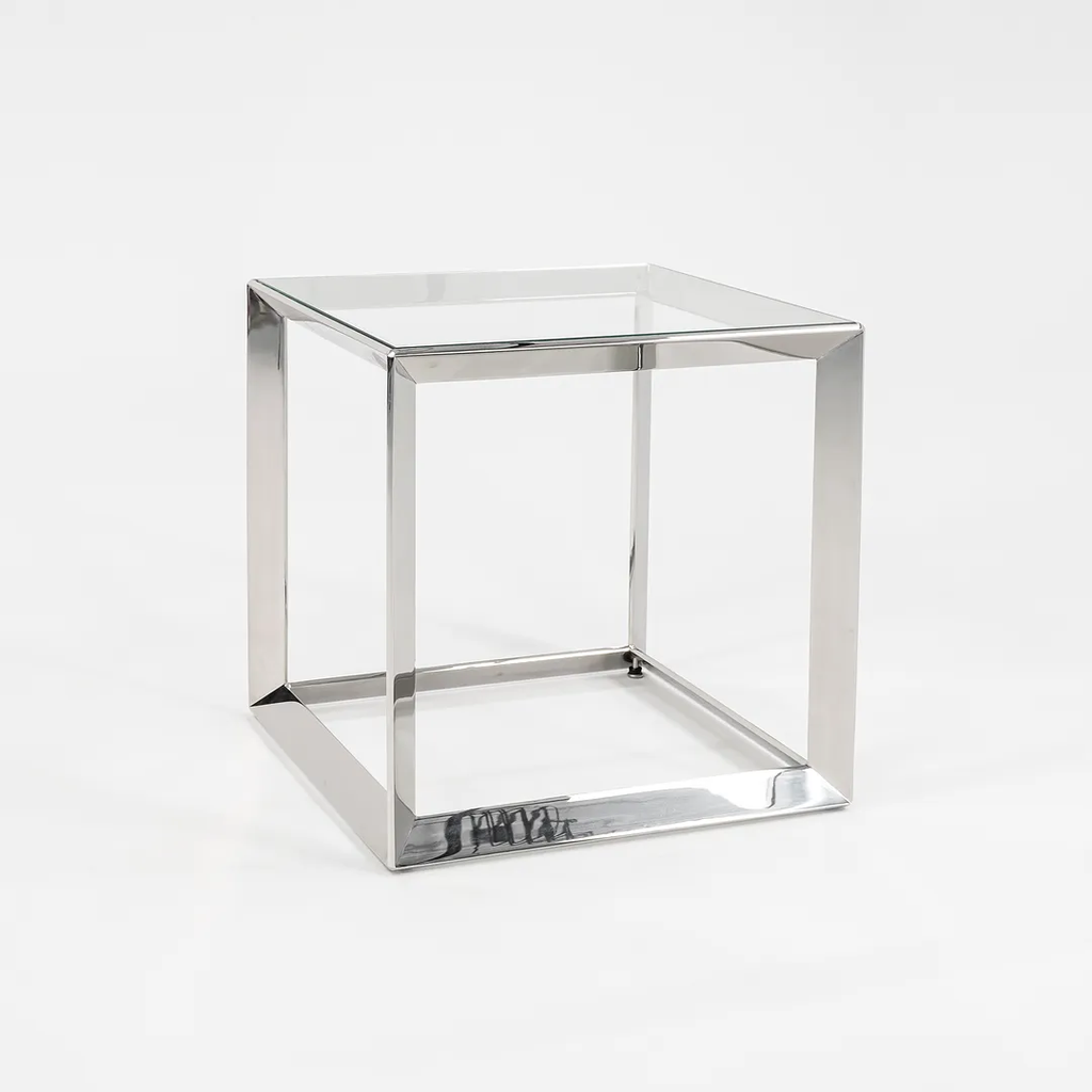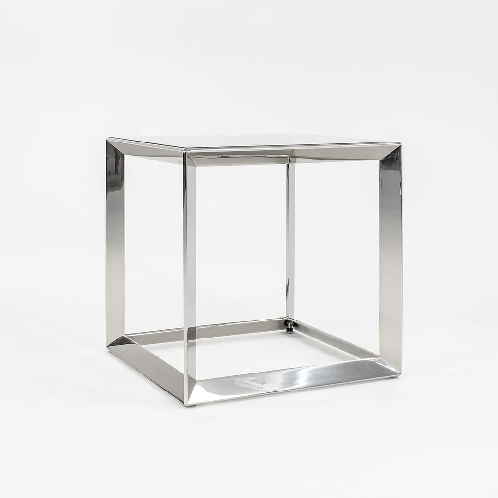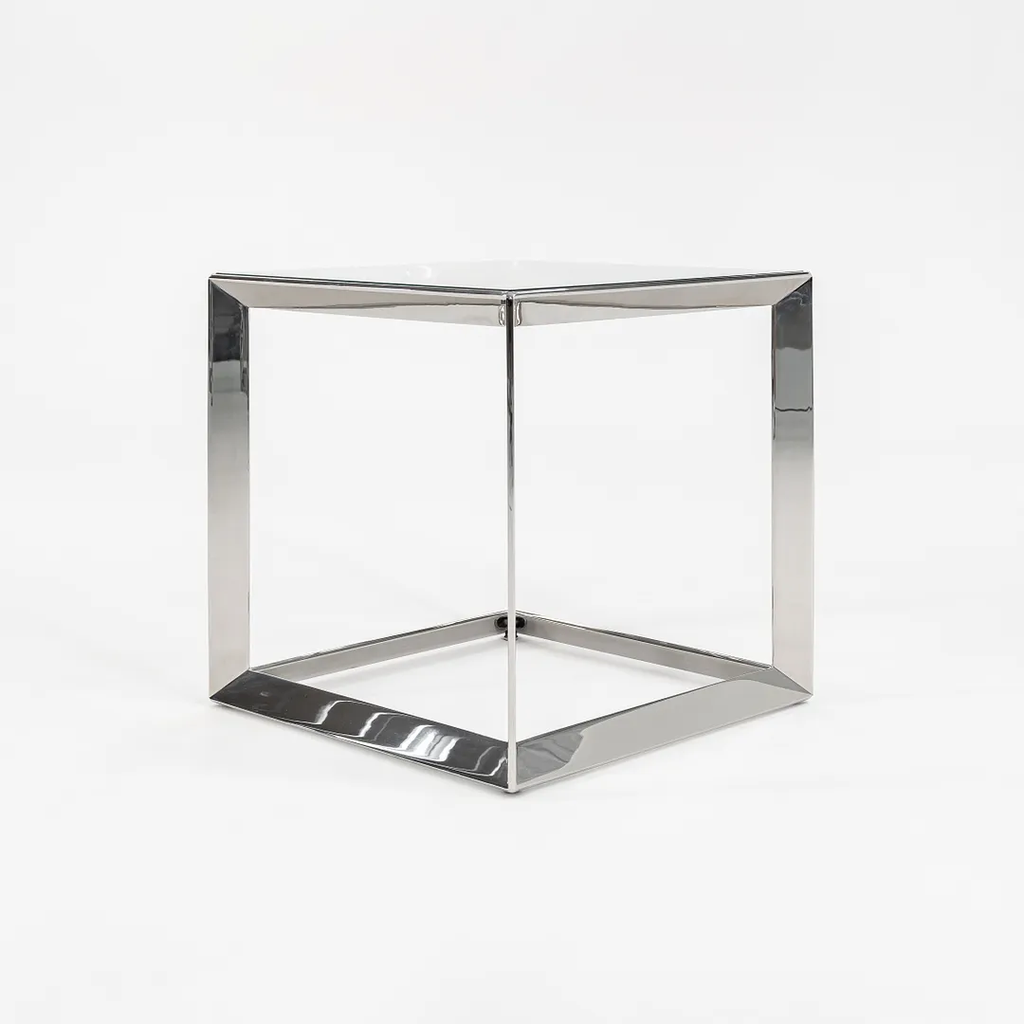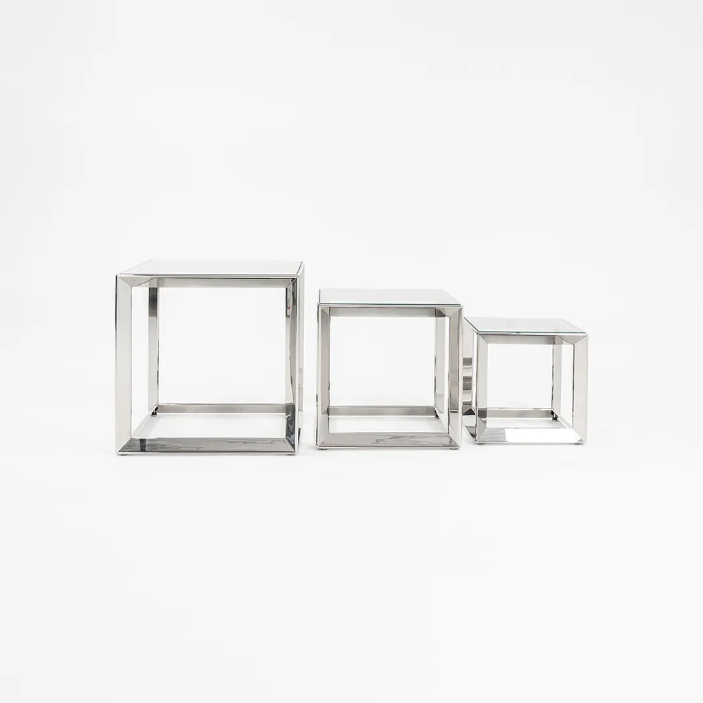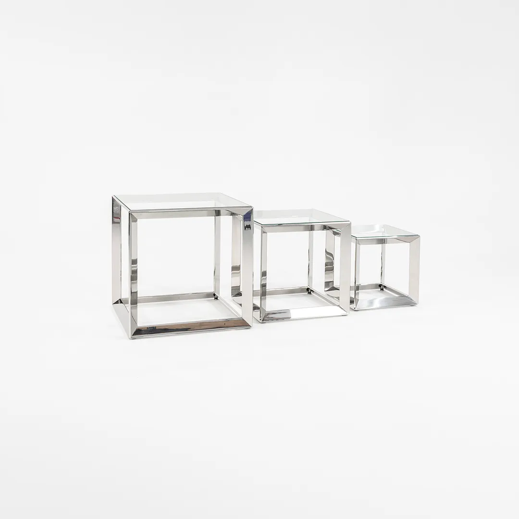 This is a large Russian Doll table in solid polished stainless steel, produced by Gratz Industries for Dennis Miller, designed by Rockwell Group, the world-renowned design firm. This is the largest of three sizes. Three tables are available in this size, along with three in the other two sizes. The weight is notable and quality is otherworldly. It is exceptional to see a table such as this constructed from solid stainless and then polished so beautifully as well.
