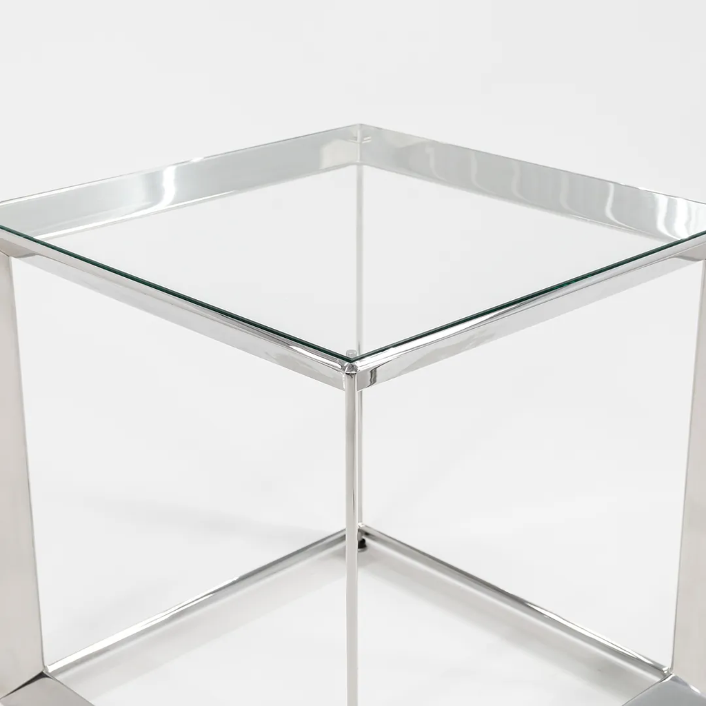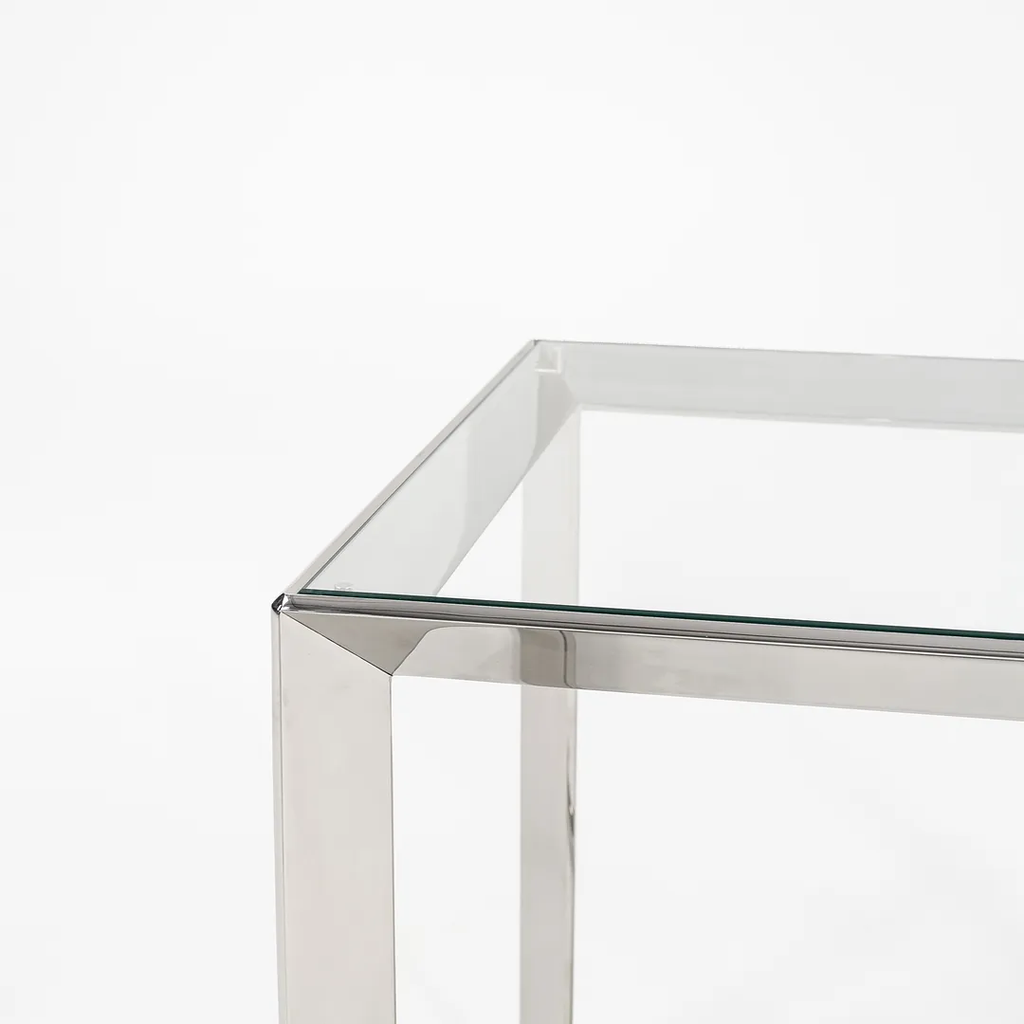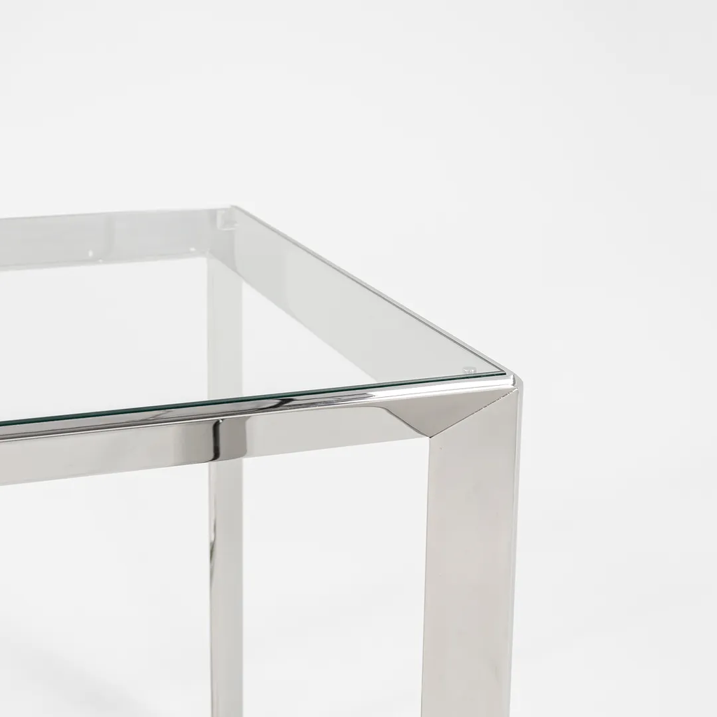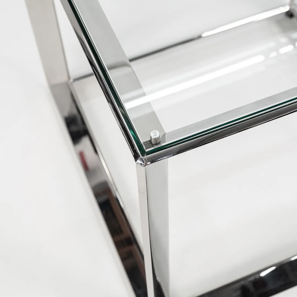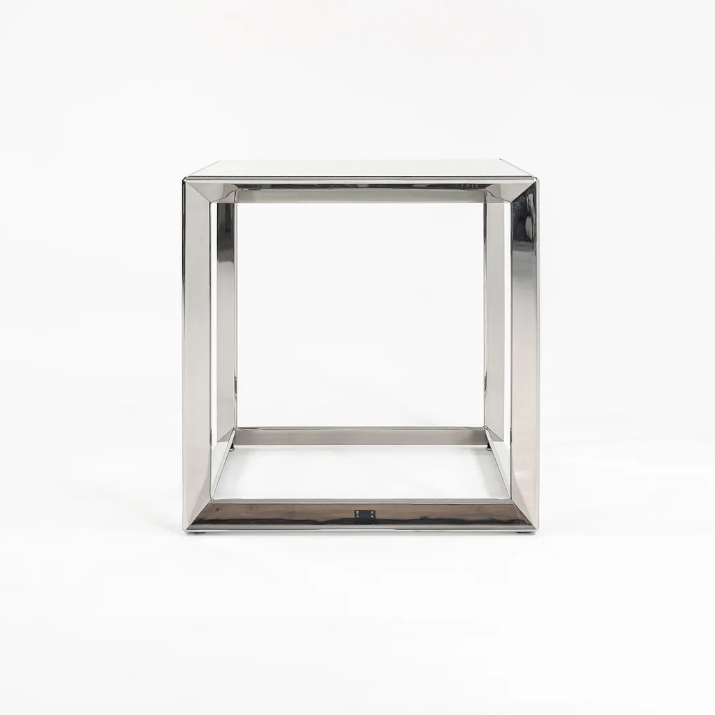 This is a large Russian Doll table in solid polished stainless steel, produced by Gratz Industries for Dennis Miller, designed by Rockwell Group, the world-renowned design firm. This is the largest of three sizes. Three tables are available in this size, along with three in the other two sizes. The weight is notable and quality is otherworldly. It is exceptional to see a table such as this constructed from solid stainless and then polished so beautifully as well.