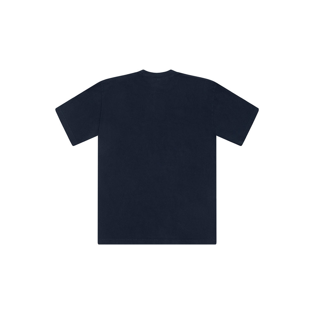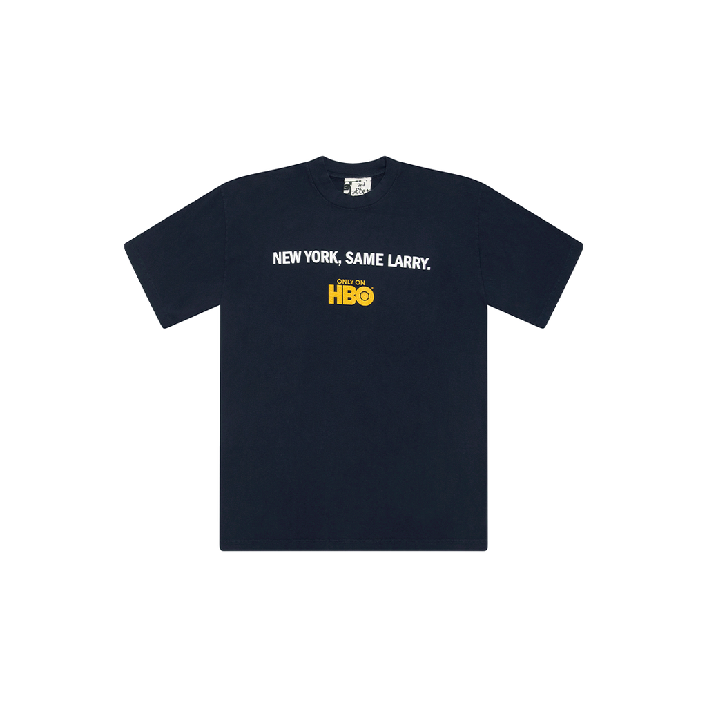 Larry Navy Tee features classic crew neck collar and graphic design.