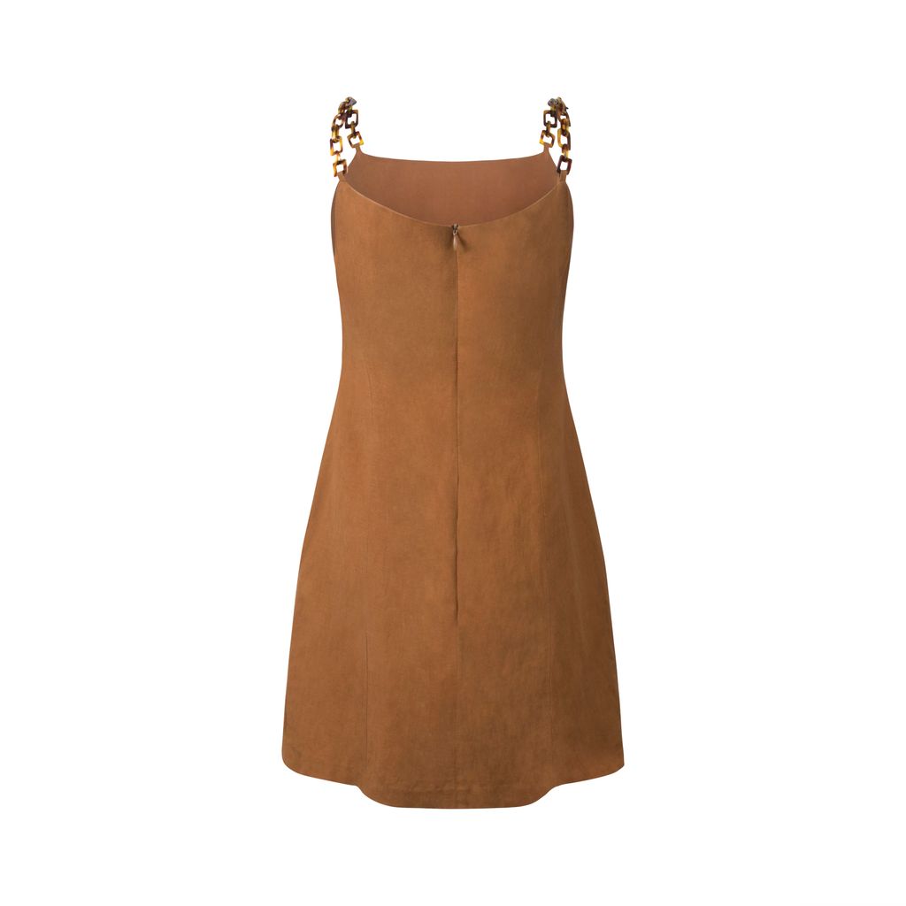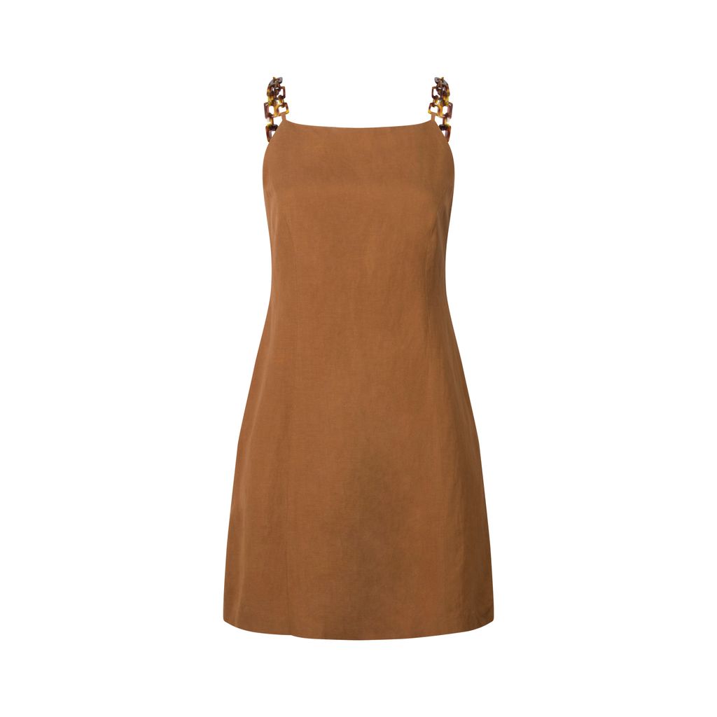 Say hello to your new summer staple. This lightweight linen blend shift dress has a square neckline, beautiful tortoise plastic shell chain link straps, and a hidden back zip for easy wear. Dress is fully lined inside. Gently worn, minor stain on front neckline- in good condition.