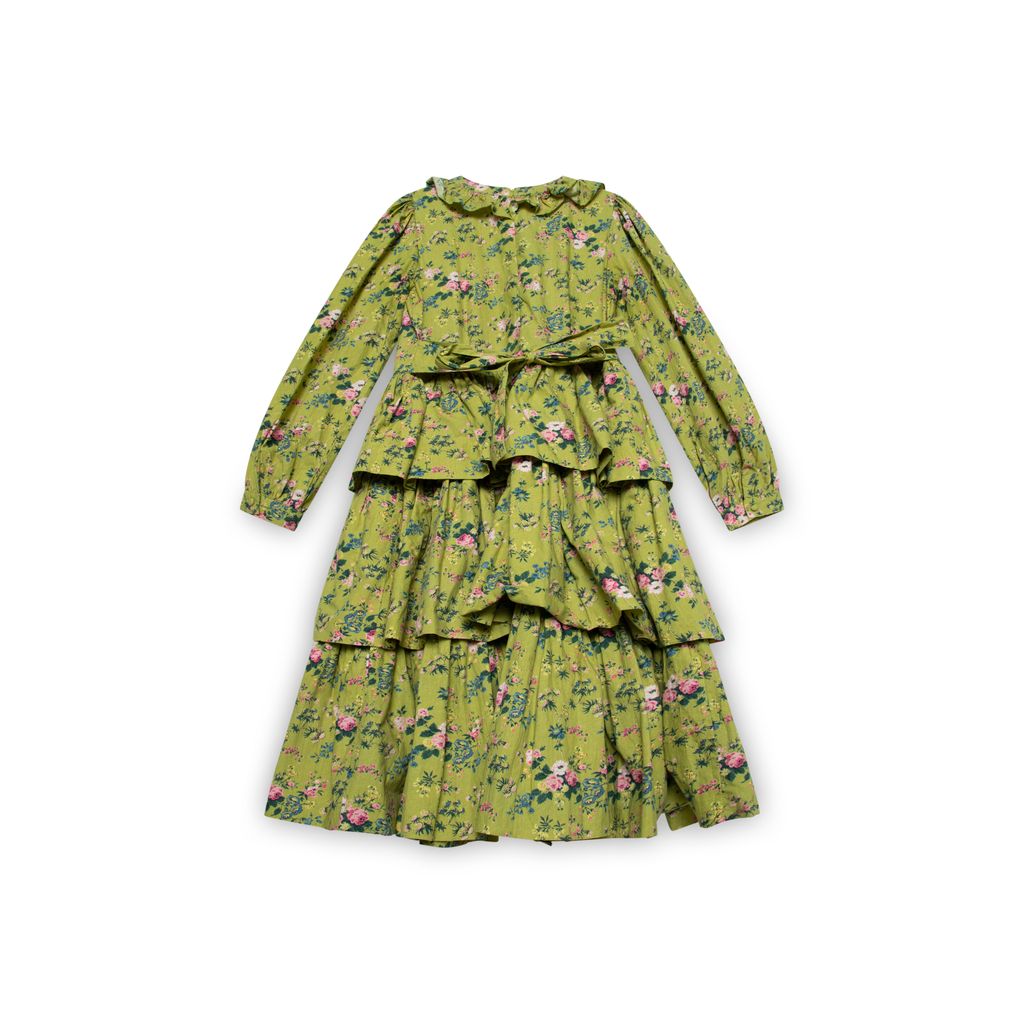 Laura Ashley x BATSHEVA Welsh midi dress features fitted bodice, triple-tiered skirts, ruffle at neck, and invisible closure zipper at back