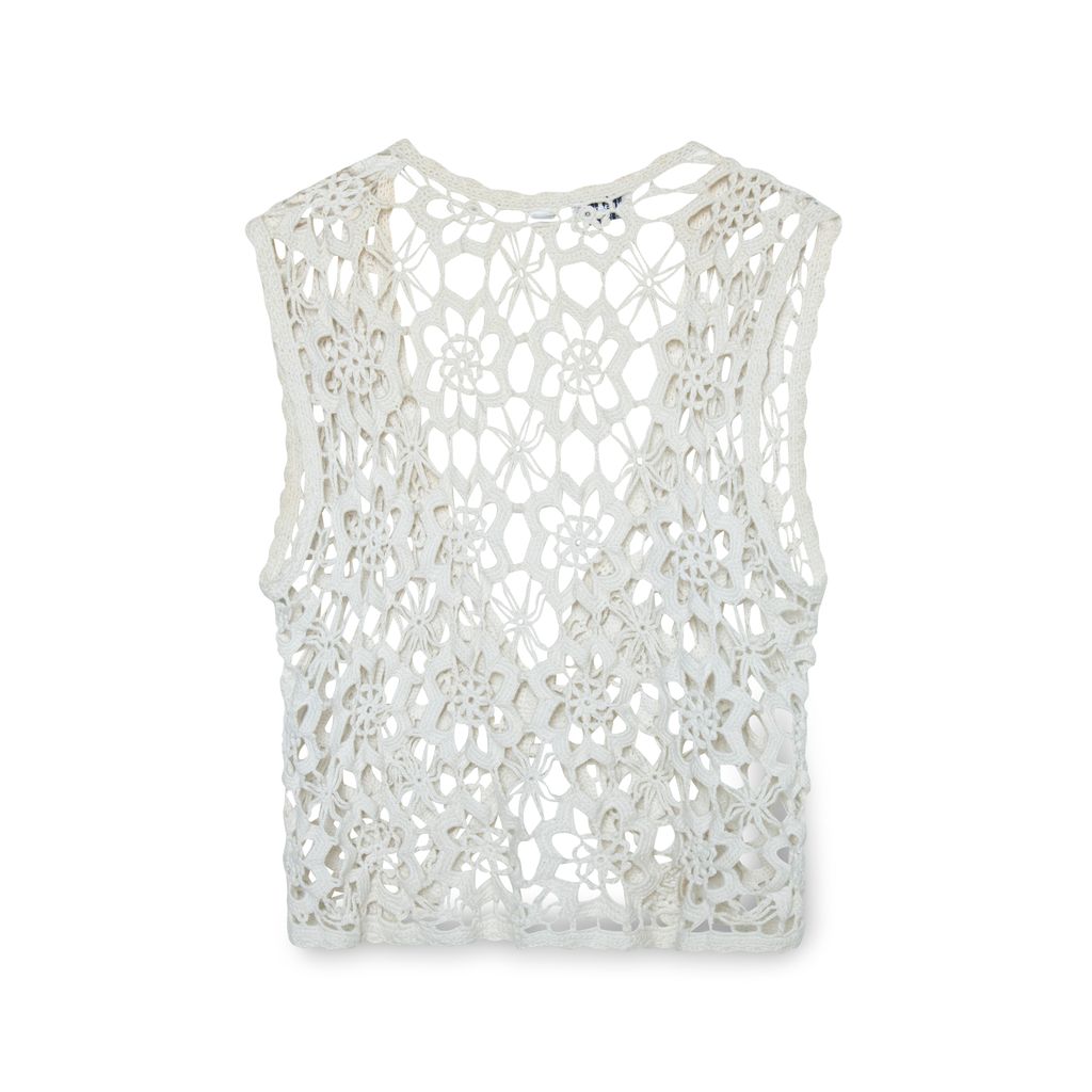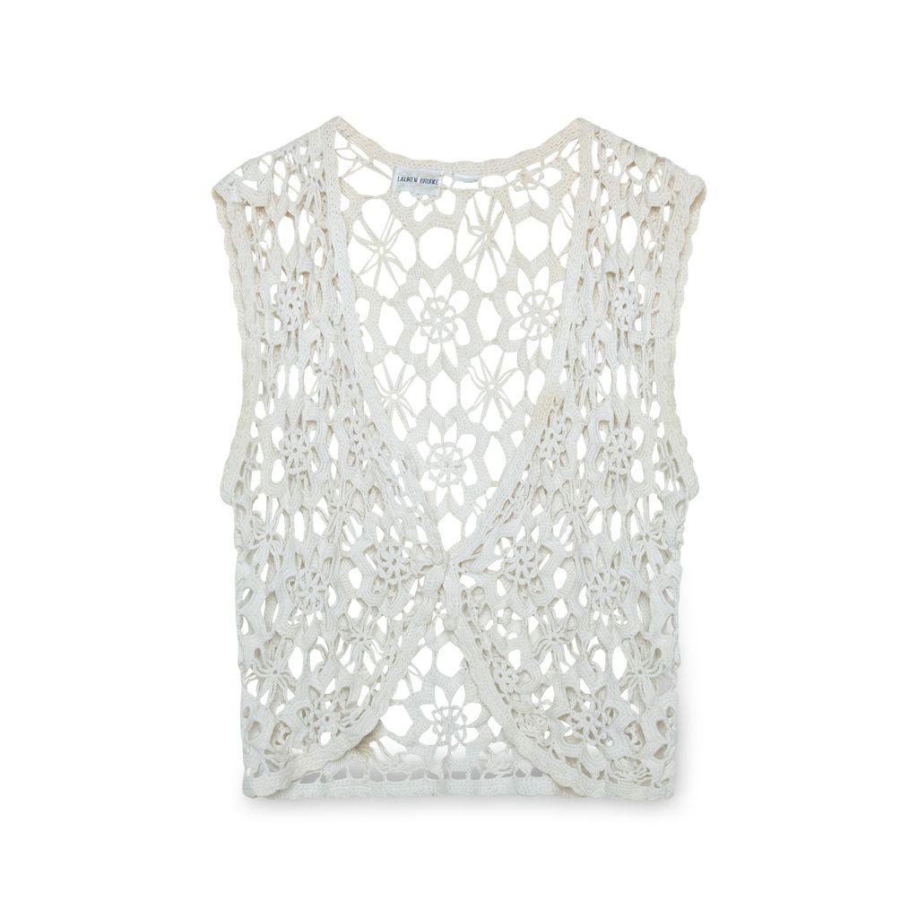 Lauren Brooke White Knit Flower Vest features V-neck, front button closure, and knit flower pattern.