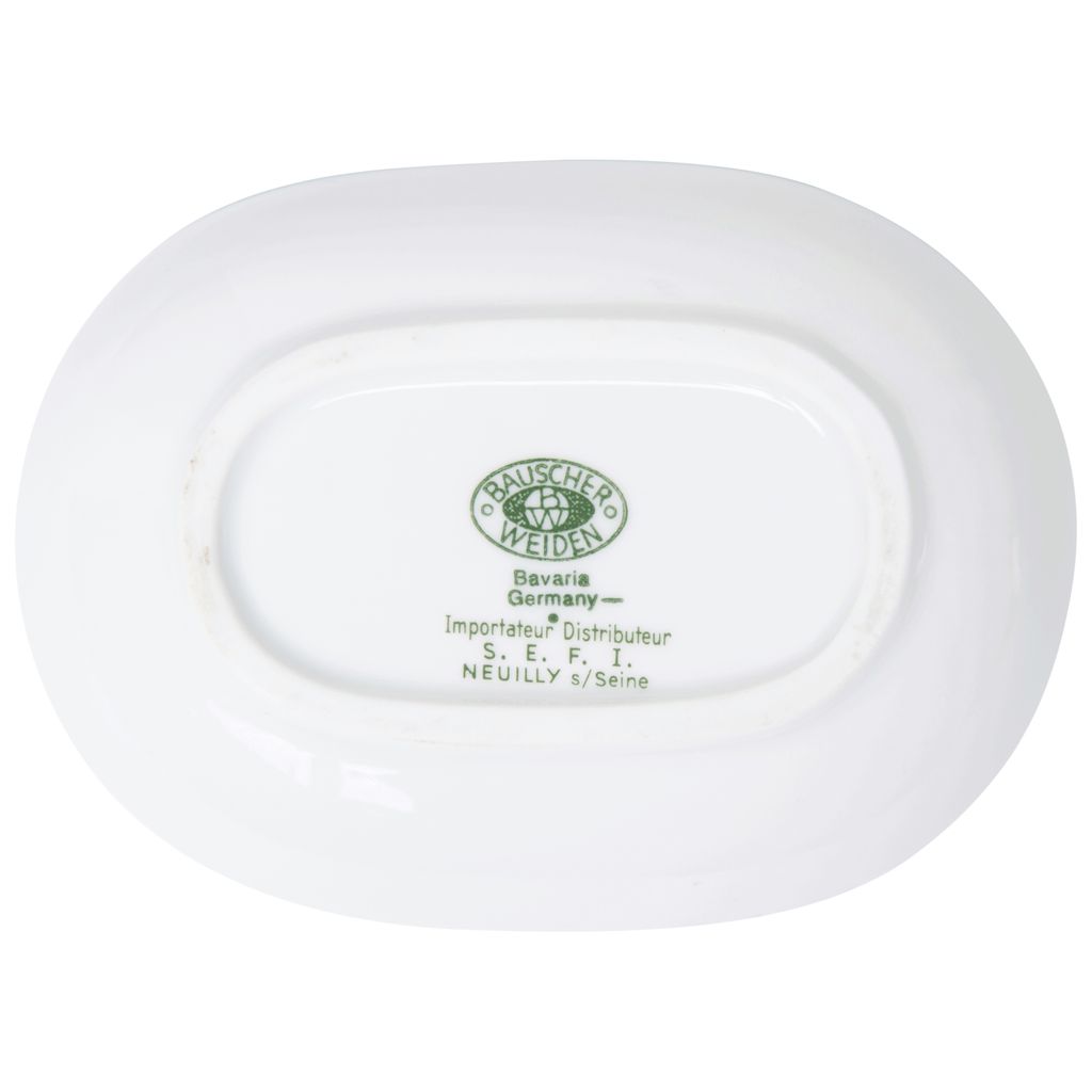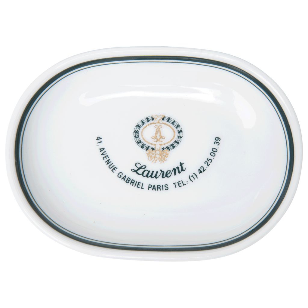 Laurent Paris Ashtray features printed calligraphy on white porcelain with green trim.