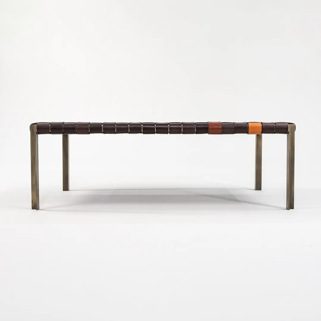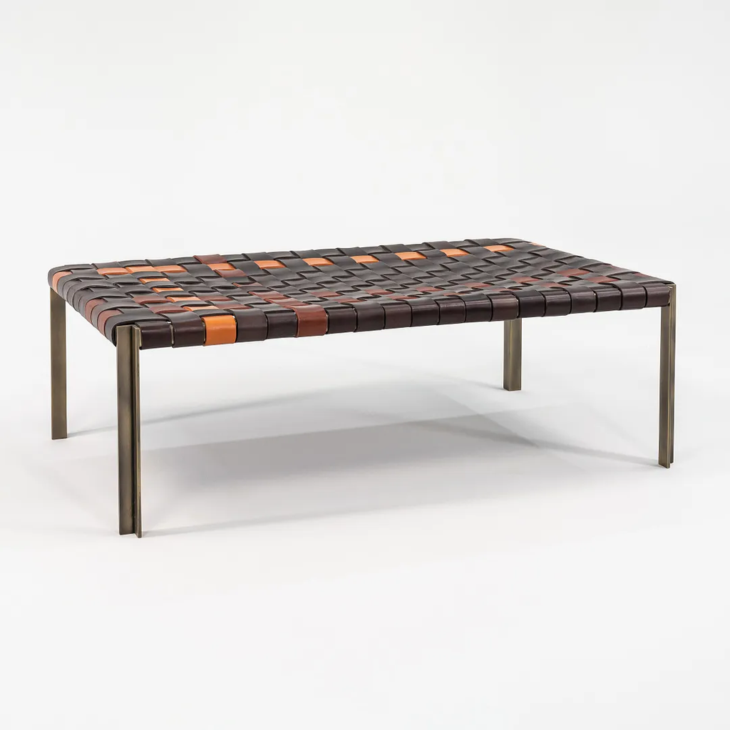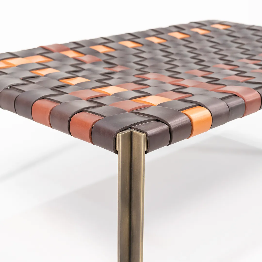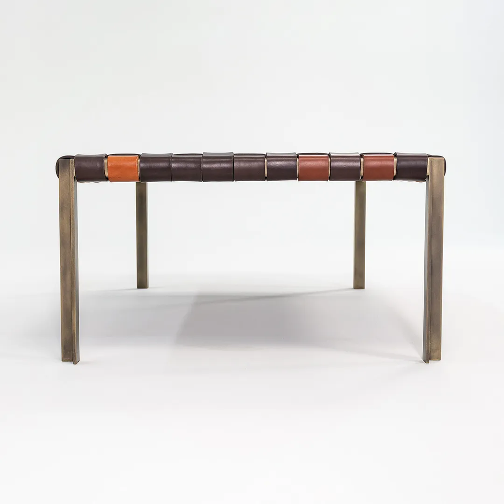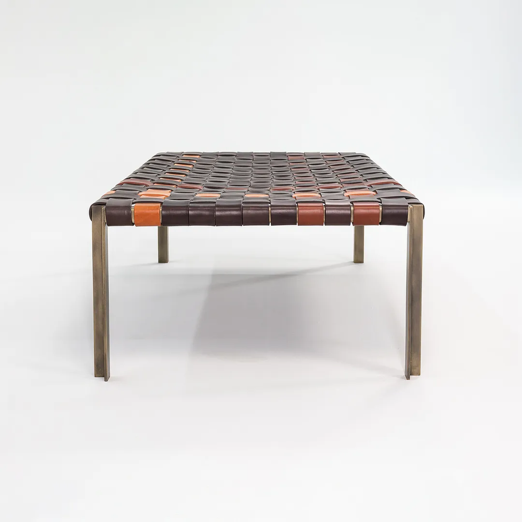 This is a TG-18 Small Woven Leather Bench in multiple brown leathers with a light antique bronze frame produced by Gratz Industries. The bench was designed was designed by Katavolos, Littell and Kelley in 1952 as part of the original Laverne Collection produced by Gratz Industries, formerly known as Trietel-Gratz. This bench design is part of the design collections at the MoMA in New York and Louvre in Paris. The bench dates to circa 2021 and is guaranteed as an authentic Gratz production example.