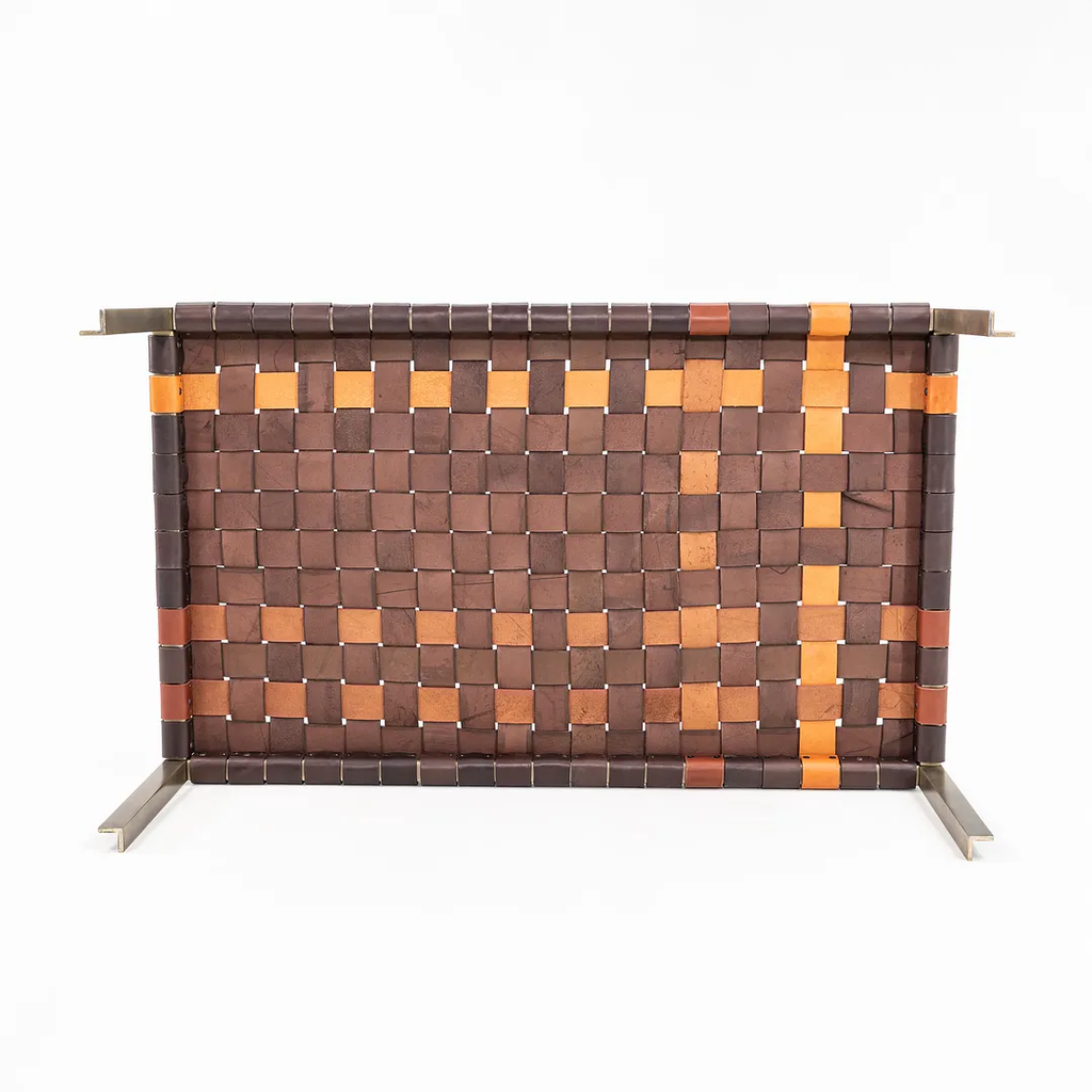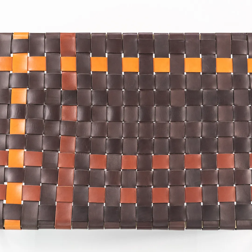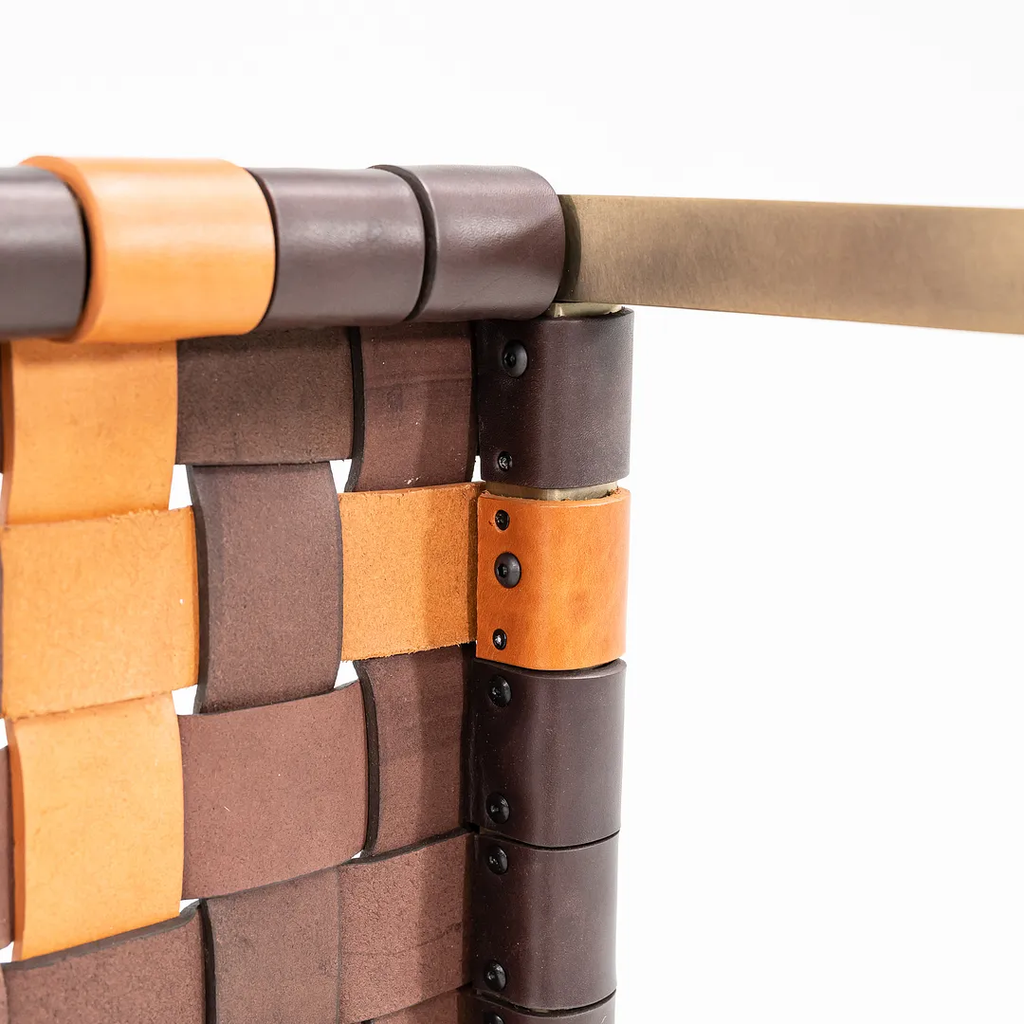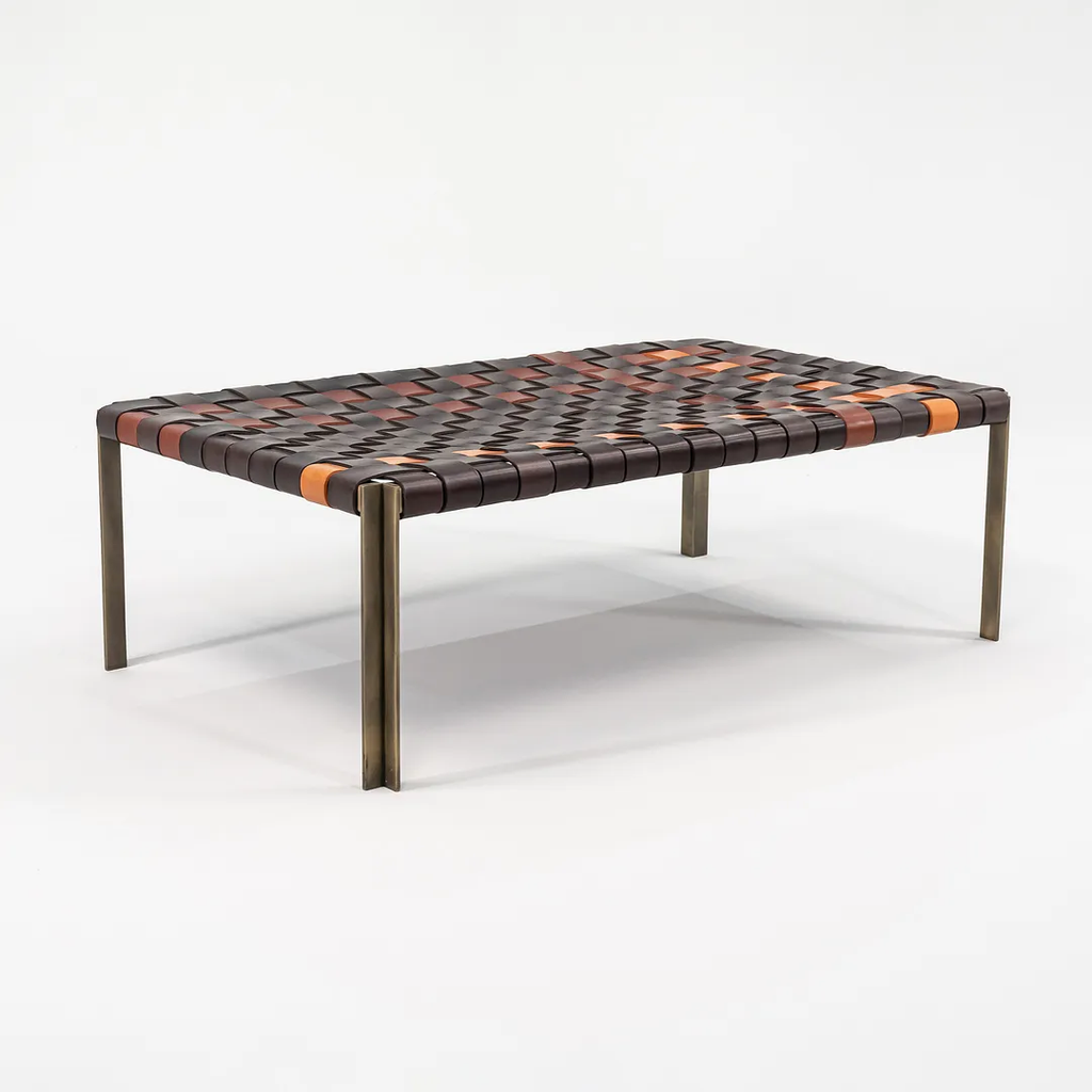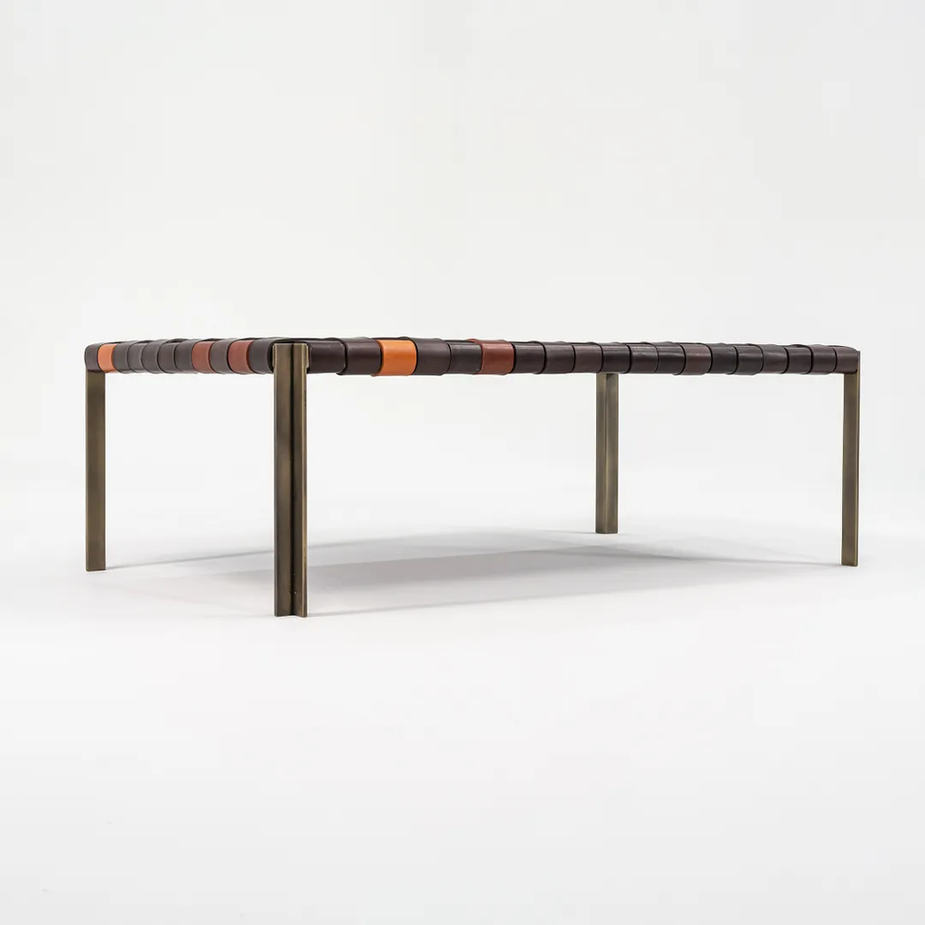 This is a TG-18 Small Woven Leather Bench in multiple brown leathers with a light antique bronze frame produced by Gratz Industries. The bench was designed was designed by Katavolos, Littell and Kelley in 1952 as part of the original Laverne Collection produced by Gratz Industries, formerly known as Trietel-Gratz. This bench design is part of the design collections at the MoMA in New York and Louvre in Paris. The bench dates to circa 2021 and is guaranteed as an authentic Gratz production example.